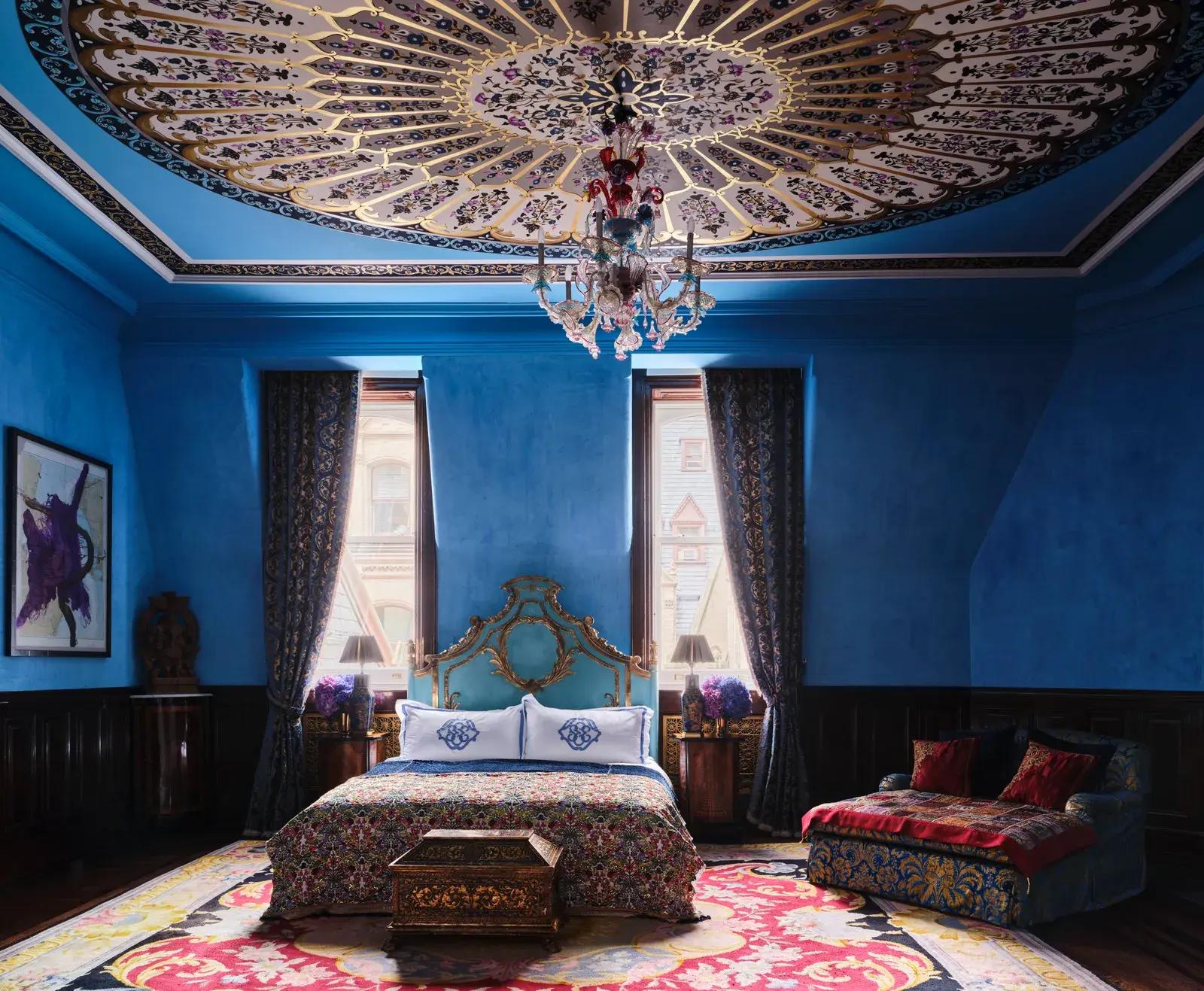 В главной спальне стены и часть потолка окрашены в синий оттенок. Изголовье кровати — антикварное, а ковер привезен из отеля Ritz в Мадриде.