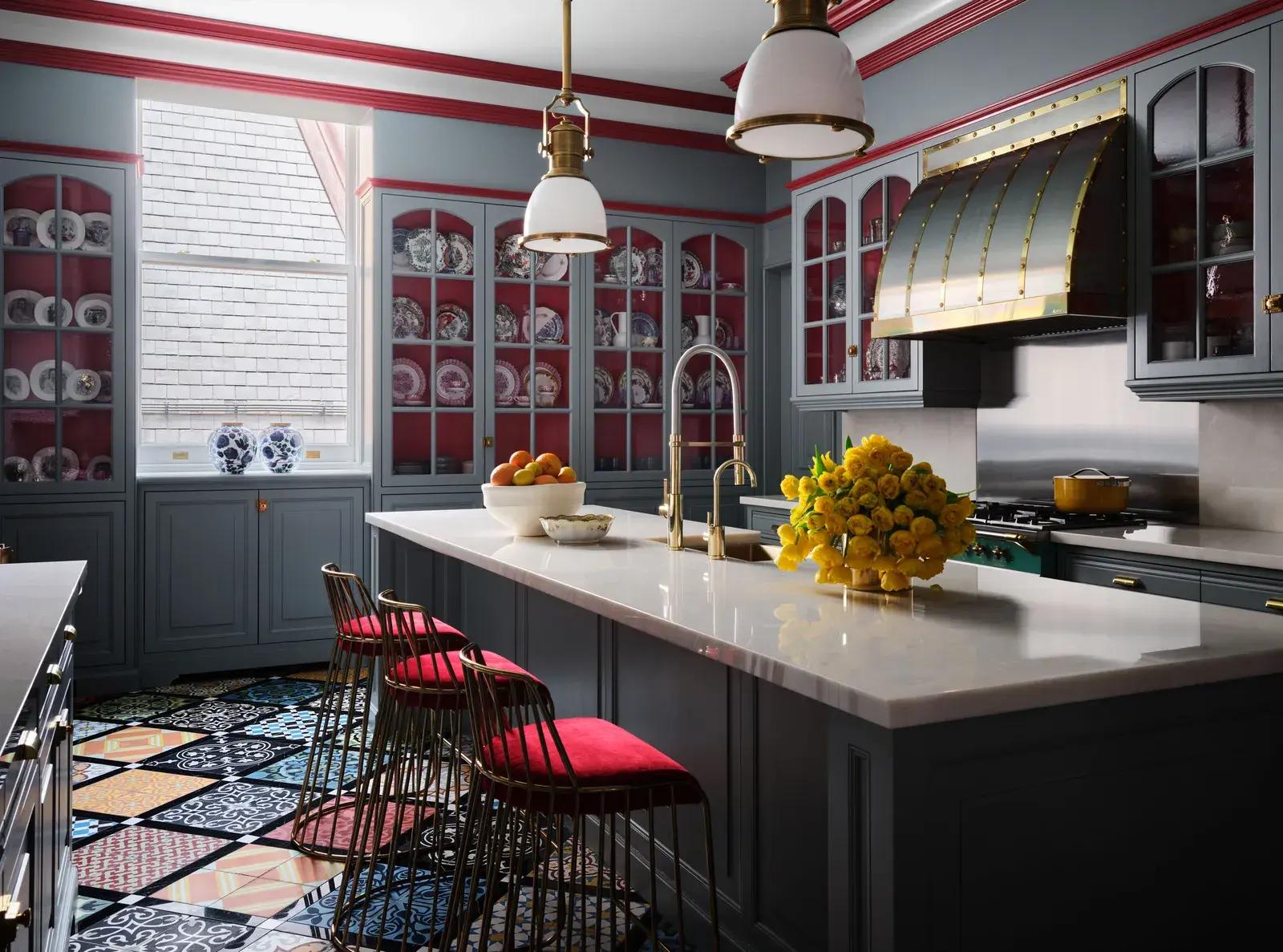 Пол на кухне — плитка Mosaic House, выложенная в красочный пэчворк-узор. Подвесные светильники Lacanche, Circa Lighting. Мойка Whitehaus Collection со смесителями California Faucets.