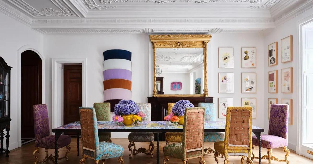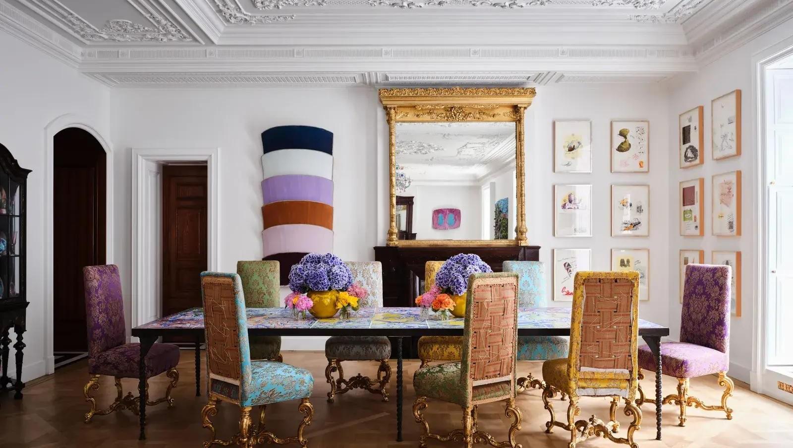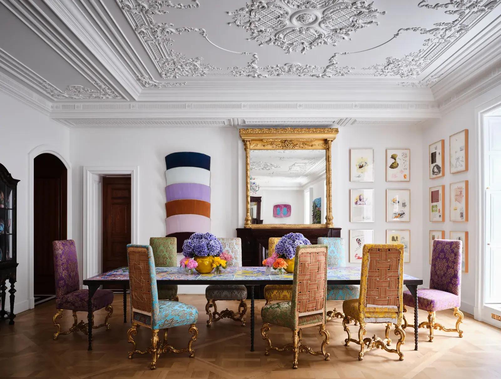 Антикварные стулья эпохи рококо, обитые тканями Alice + Olivia, окружают обеденный стол, изготовленный на заказ Лолой Монтес Шнабел