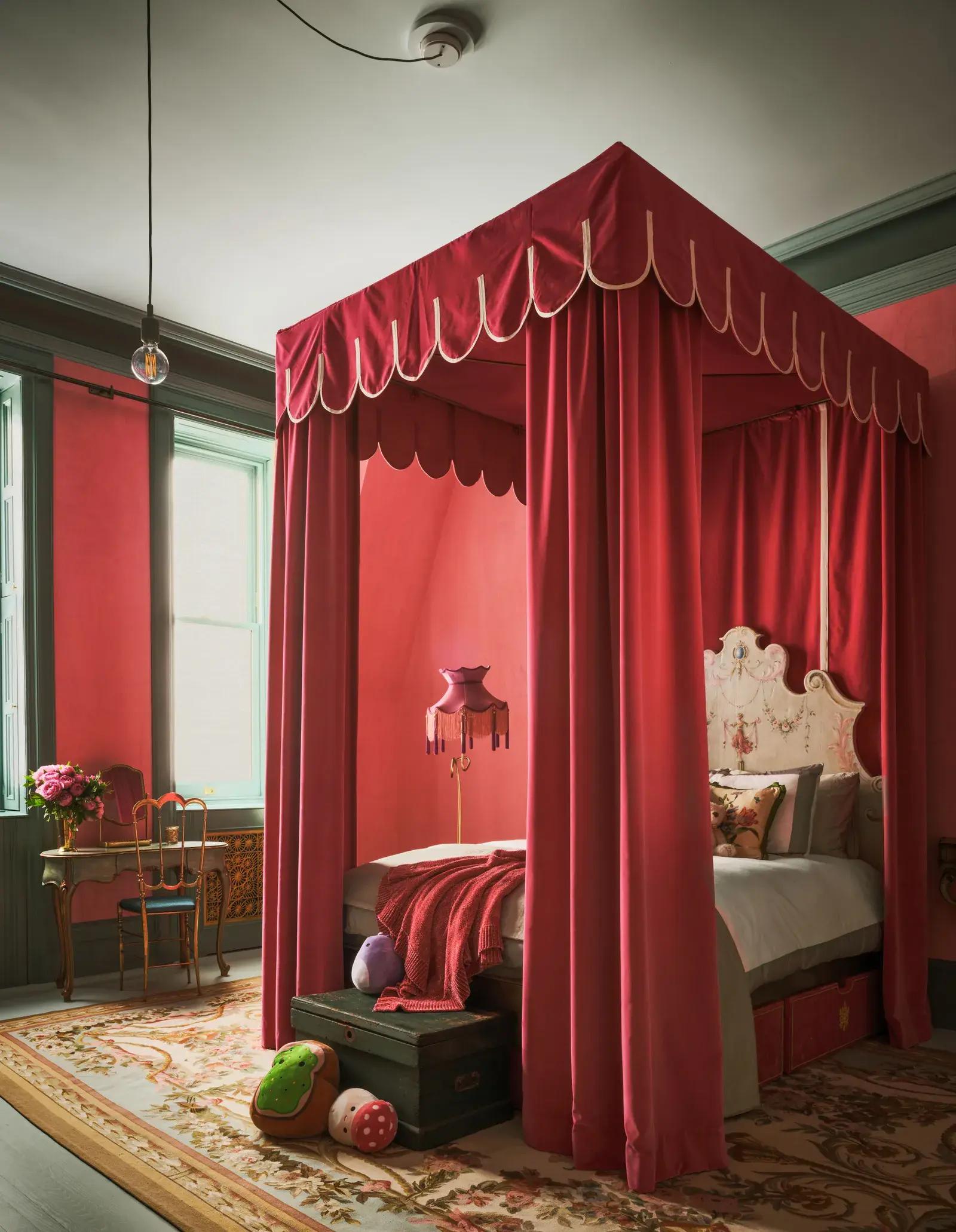В комнате Скарлет, оформленной в оттенках красного, установлена эффектная кровать с балдахином, дизайн которой разработала Луиза Кугельберг.
