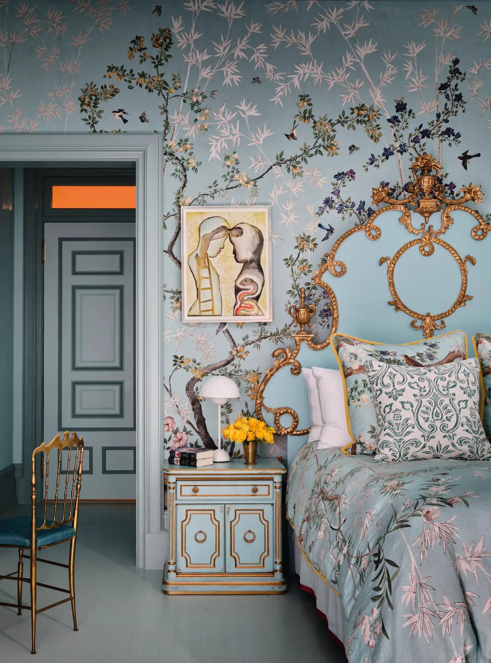 Комната дочери Элоизы декорирована живописными обоями Iksel–Decorative Arts. Кресла-бержеры украшены принтом Fortuny, а пододеяльник изготовлен на заказ из тканей Alice + Olivia. Над венецианским столом 1960-х годов висит картина Лолы Монтес Шнабель