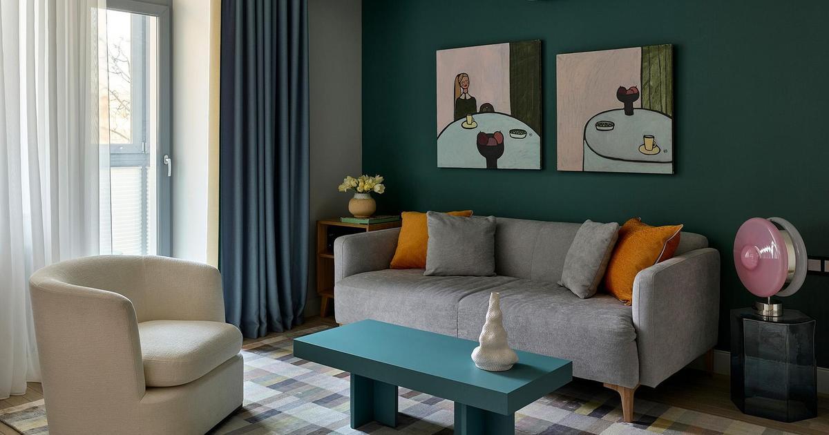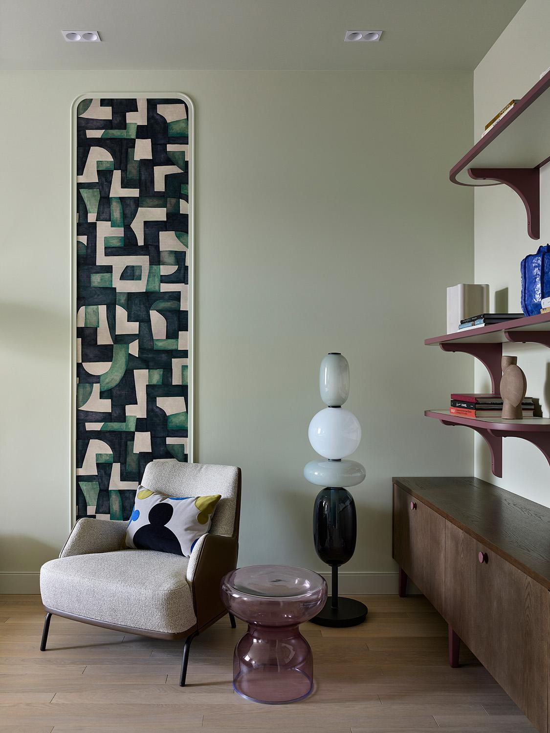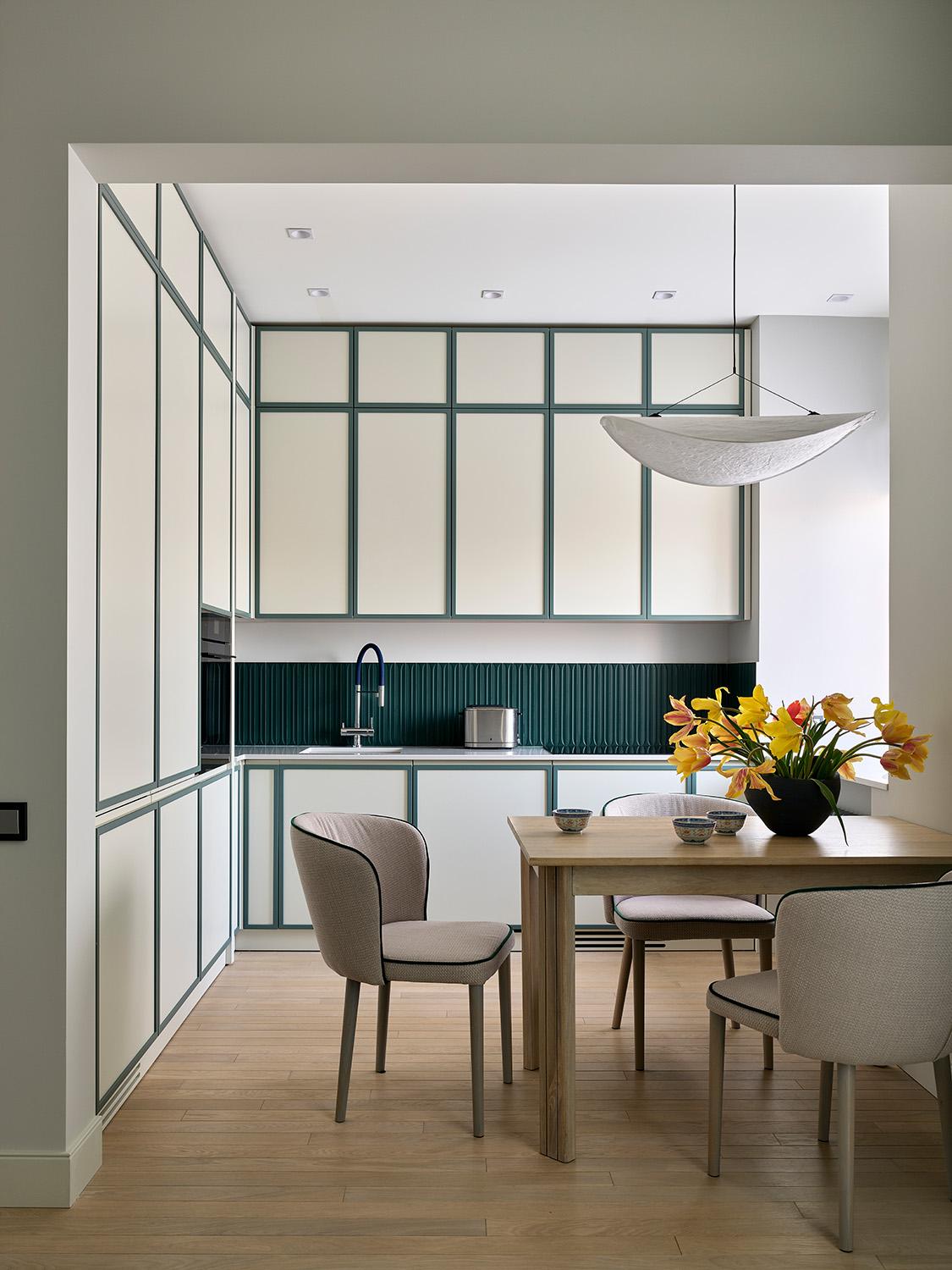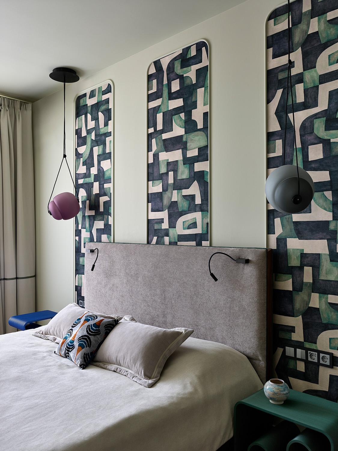 Важно отметить и работу с обоями: в спальне выделяются молдинги с обоями, чей геометрический узор в зеленых и синих тонах напоминает текстиль. Все это неслучайно: сочетание четкости линий со скругленными углами — это метафора балтийского побережья, где строгость скал смягчается песком и водой.