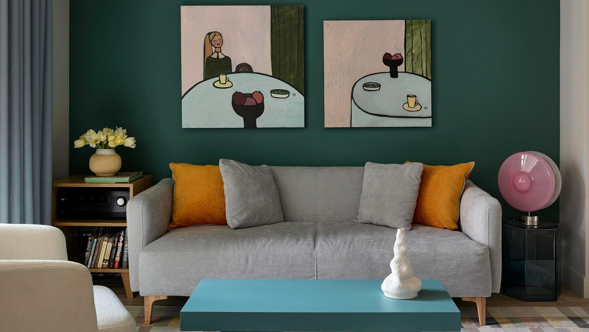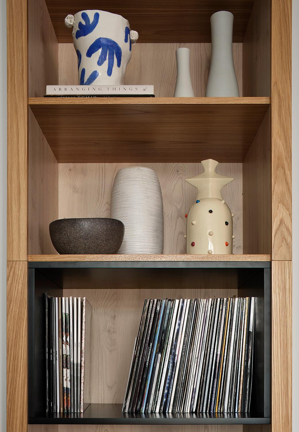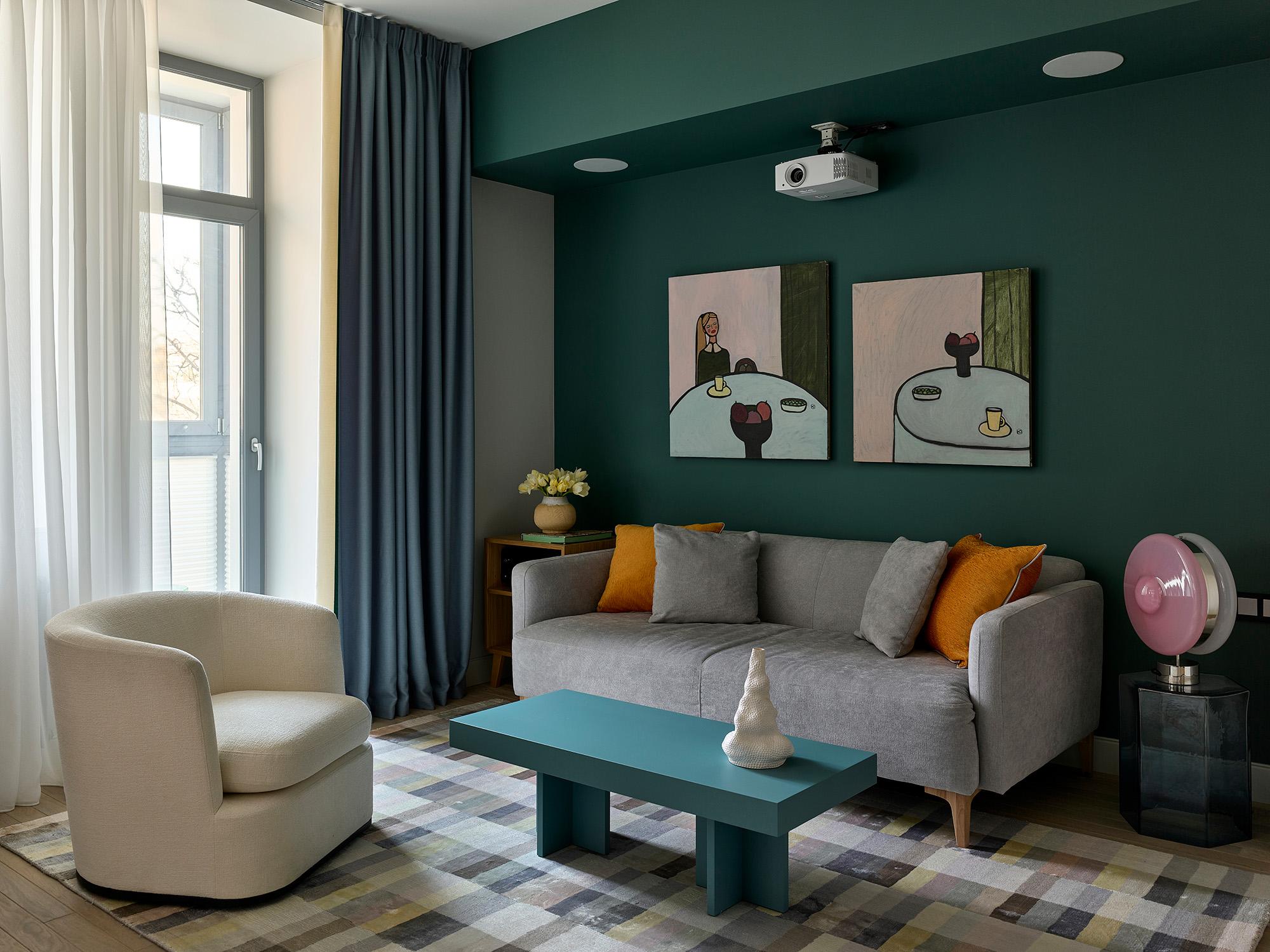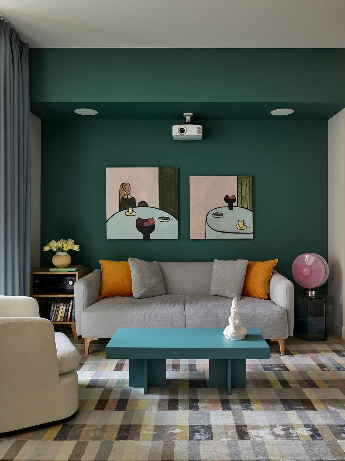 В гостиной важно было найти место для проигрывателя — у хозяйки большая коллекция виниловых пластинок, дорогих ее сердцу. Все это мы разместили в нише, которую отделали светлым деревом. Там же можно увидеть и красивую керамику. А колонки и проектор мы установили над диваном.