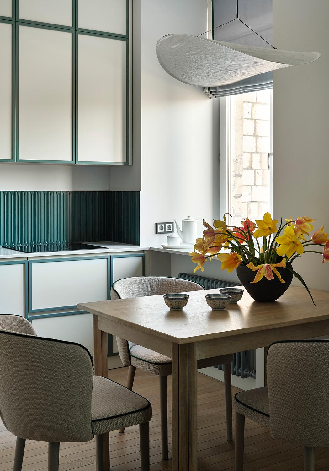 Белые фасады кухни аккуратно обрамили изумрудные контуры, которые дополнил темный фартук похожего оттенка. Рабочую поверхность мы увеличили, соединив с глубоким подоконником.