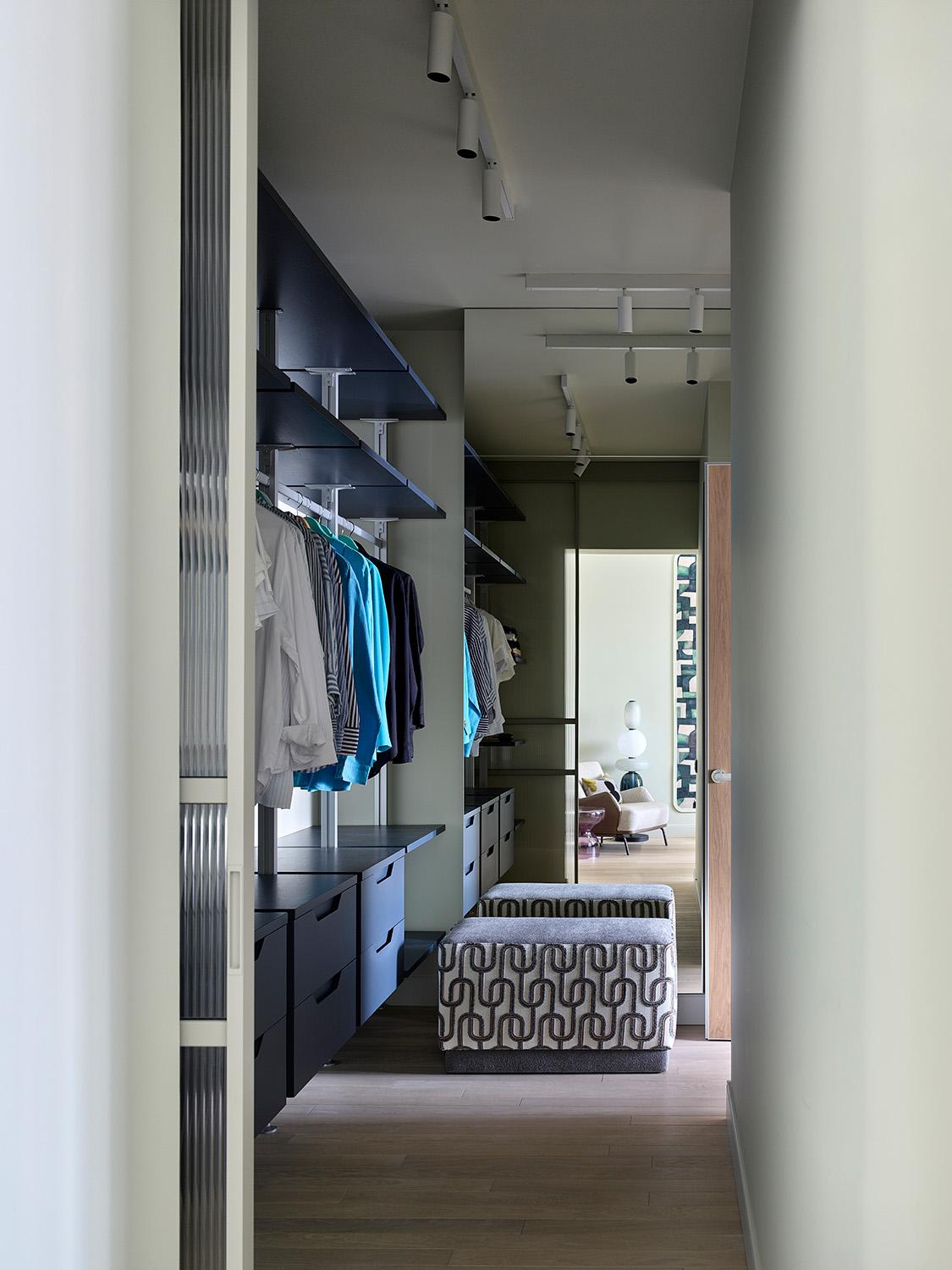 Для заказчицы мы обустроили большую спальню, при входе организовали гардеробную — раньше на ее месте была просто ненужная часть коридора.