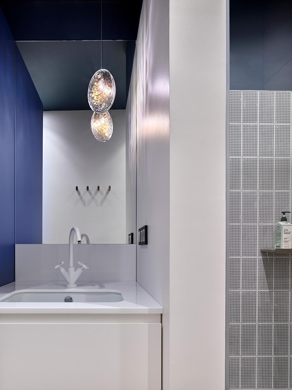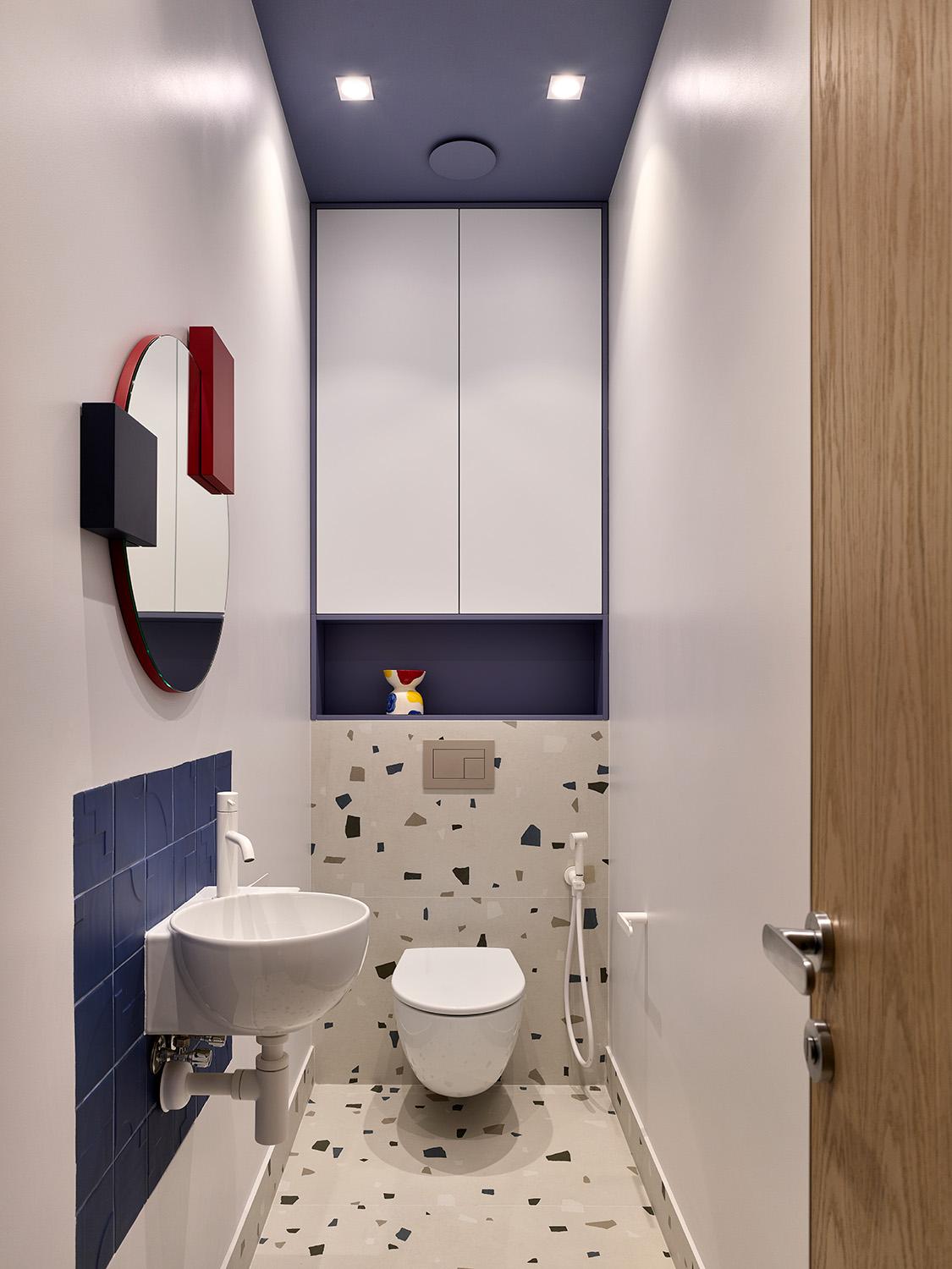 Несмотря на не самую большую площадь, в квартире удалось разместить два санузла. В одном из них, маленьком, есть интересная деталь — зеркало, напоминающее картину авангардиста. Я искала его очень долго — пересматривала множество вариантов и все не могла найти то самое. Хотелось, чтобы оно было акцентным, интересным и подходящим к общему стилю — так и получилось.