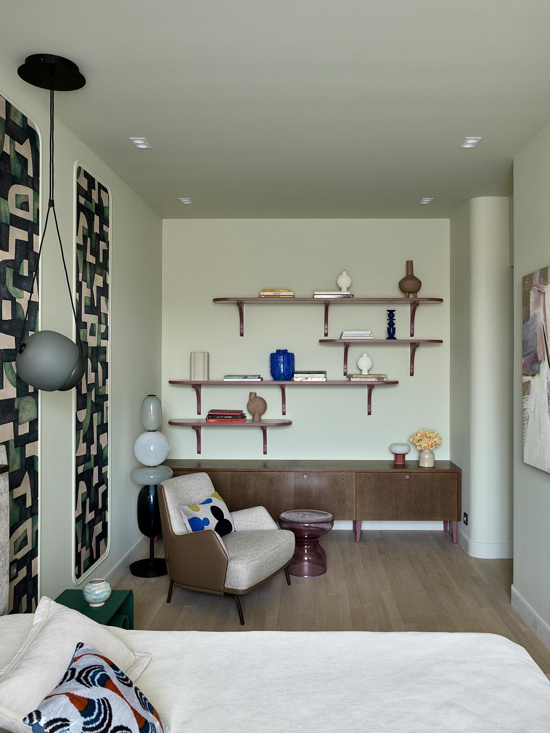 А еще здесь есть уголок для чтения — большое кресло с лаконичными полками для книг. Хозяйка очень любит читать, поэтому это идеальное место, чтобы побыть наедине с собой.