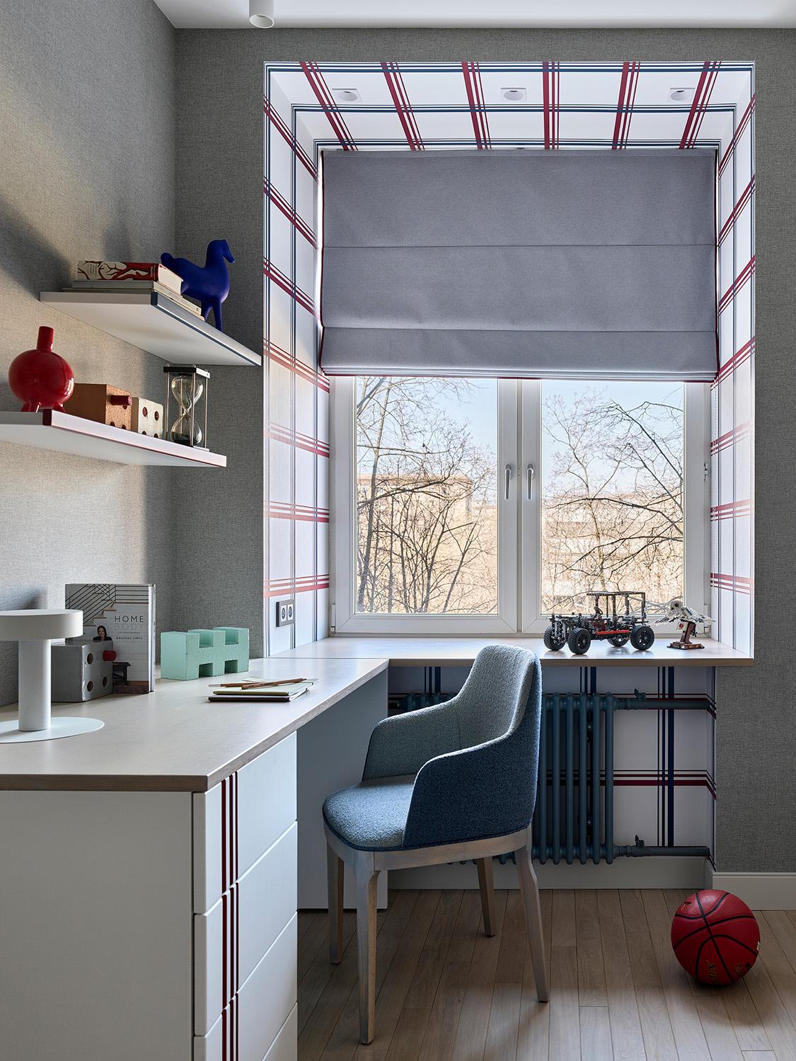 У сына тоже есть своя спальня с большой кроватью, рабочей зоной и вместительным шкафом. Здесь мы тоже поработали с обоями: они тоже геометричные, выделяются яркими красно-синими полосками. Этот ритм мы повторили в мебели и в спальной зоне, он помог расширить пространство и сделать его целостным.