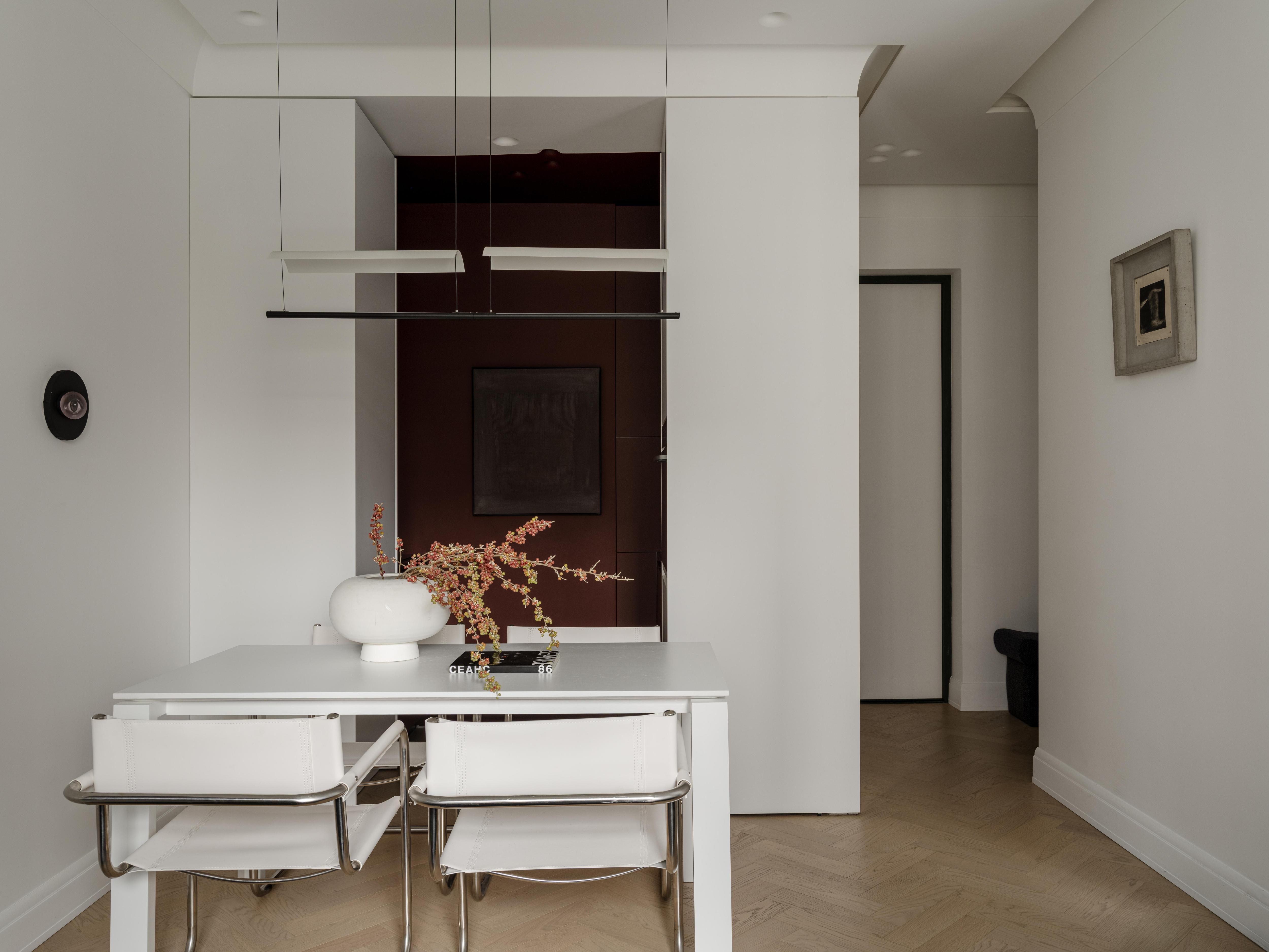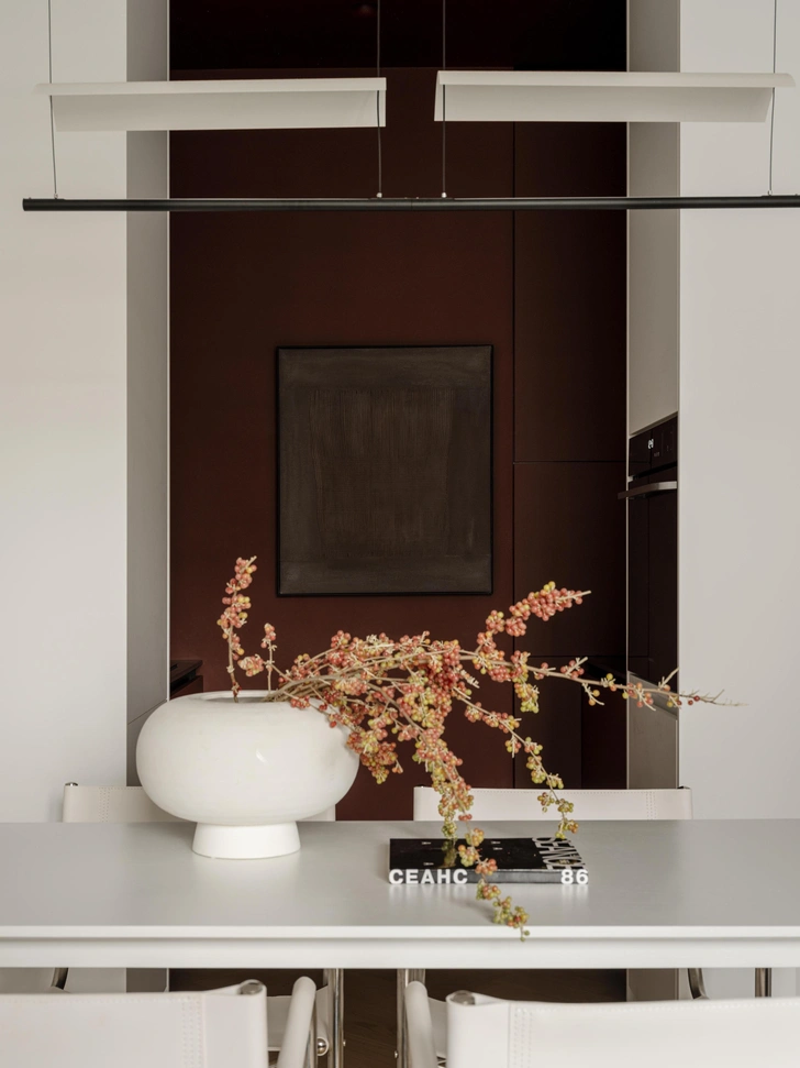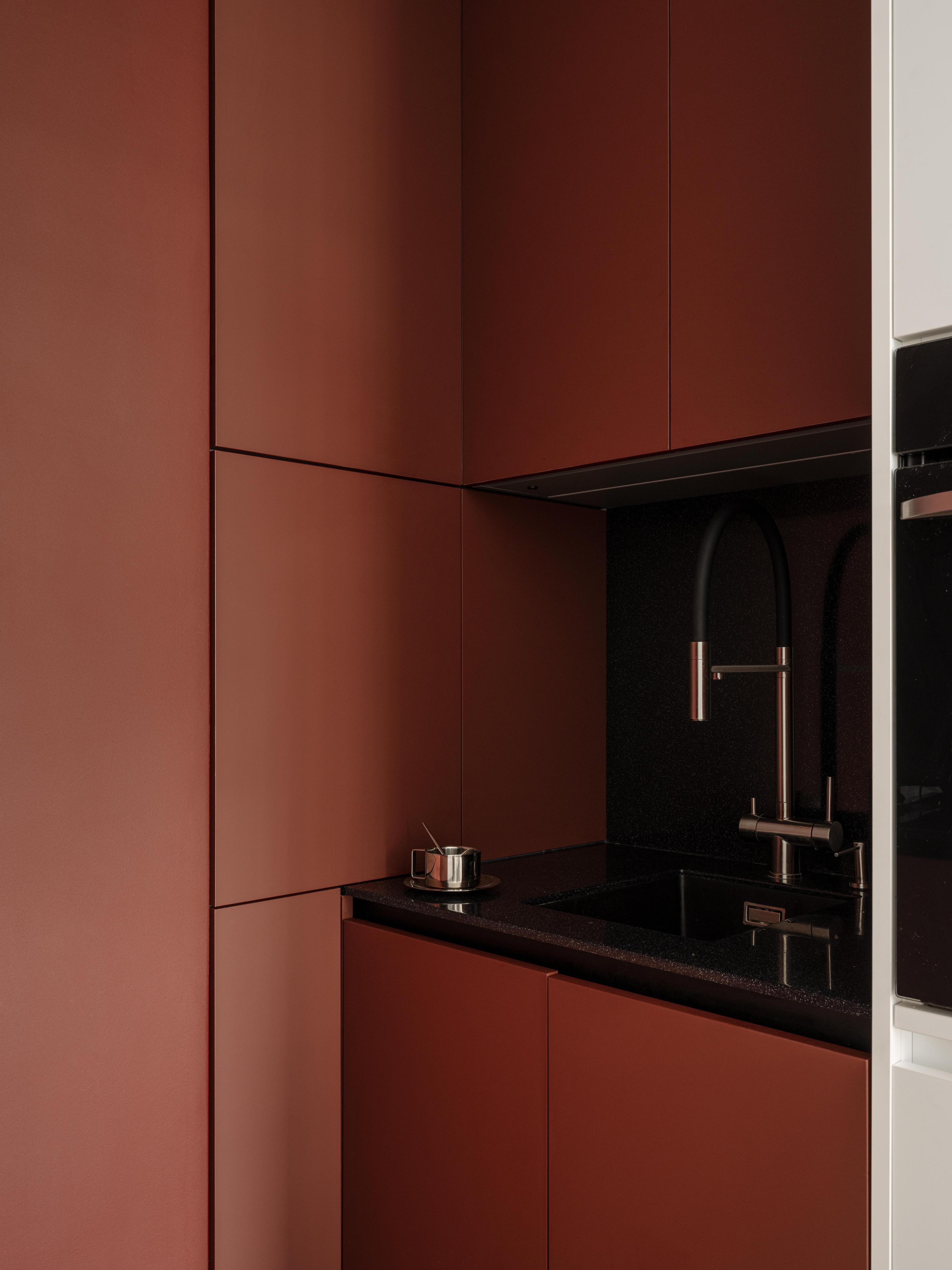 Кухня винно-красного цвета спрятана в нише — так, что зоны готовки издалека не увидеть. Благодаря этому решению пространство не кажется загроможденным — глубокий акцентный цвет, наоборот, делает его объемнее. Несмотря на то, что кухня выглядит компактной, здесь хватает места для хранения, что помогает облегчить уборку — все на своем месте.
