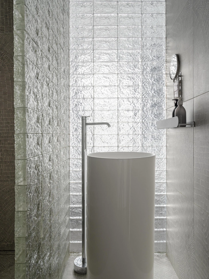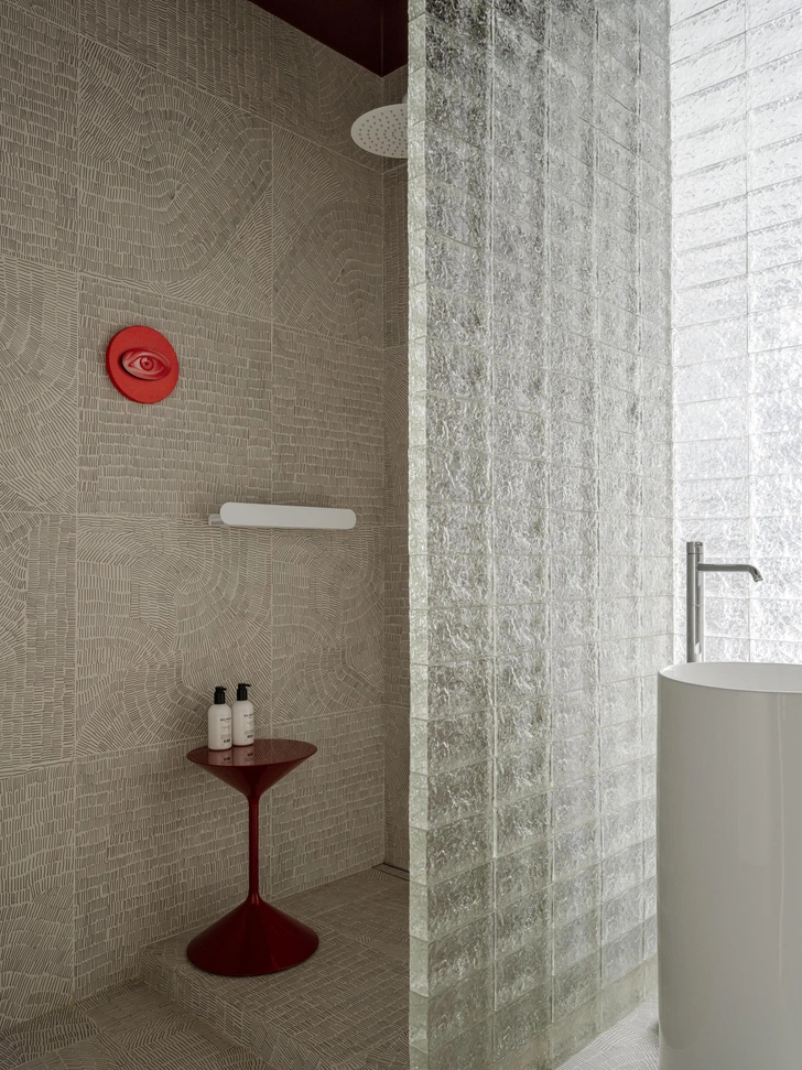Украшает спальню и стена из стеклоблоков, за которой находится санузел. Благодаря такому решению туда поступает естественный свет — так пространство не выглядит тесным. Вечером рифленая текстура стеклоблоков мягко рассеивает теплый свет ламп, добавляя уюта. А неожиданные красные акценты в виде столика и небольшой картины добавляют индивидуальности, разбавляя серую палитру.