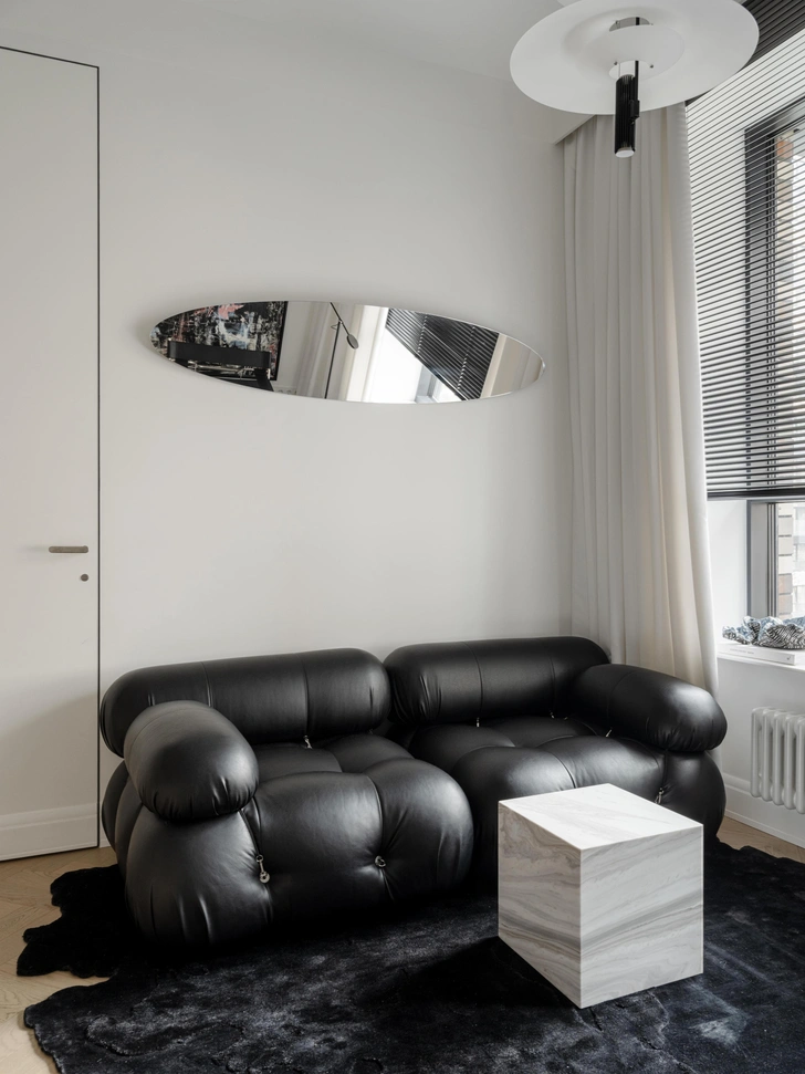 На 35 м² разместились кухня-гостиная, спальня, прихожая, гардеробная и санузел. В проекте много предметов с разной текстурой и фактурой: от блестящих металлических поверхностей до рифленых стеклоблоков и ковролина. Много и небанальных контрастов форм: например, «дутый» черный диван и строгий каменный столик.