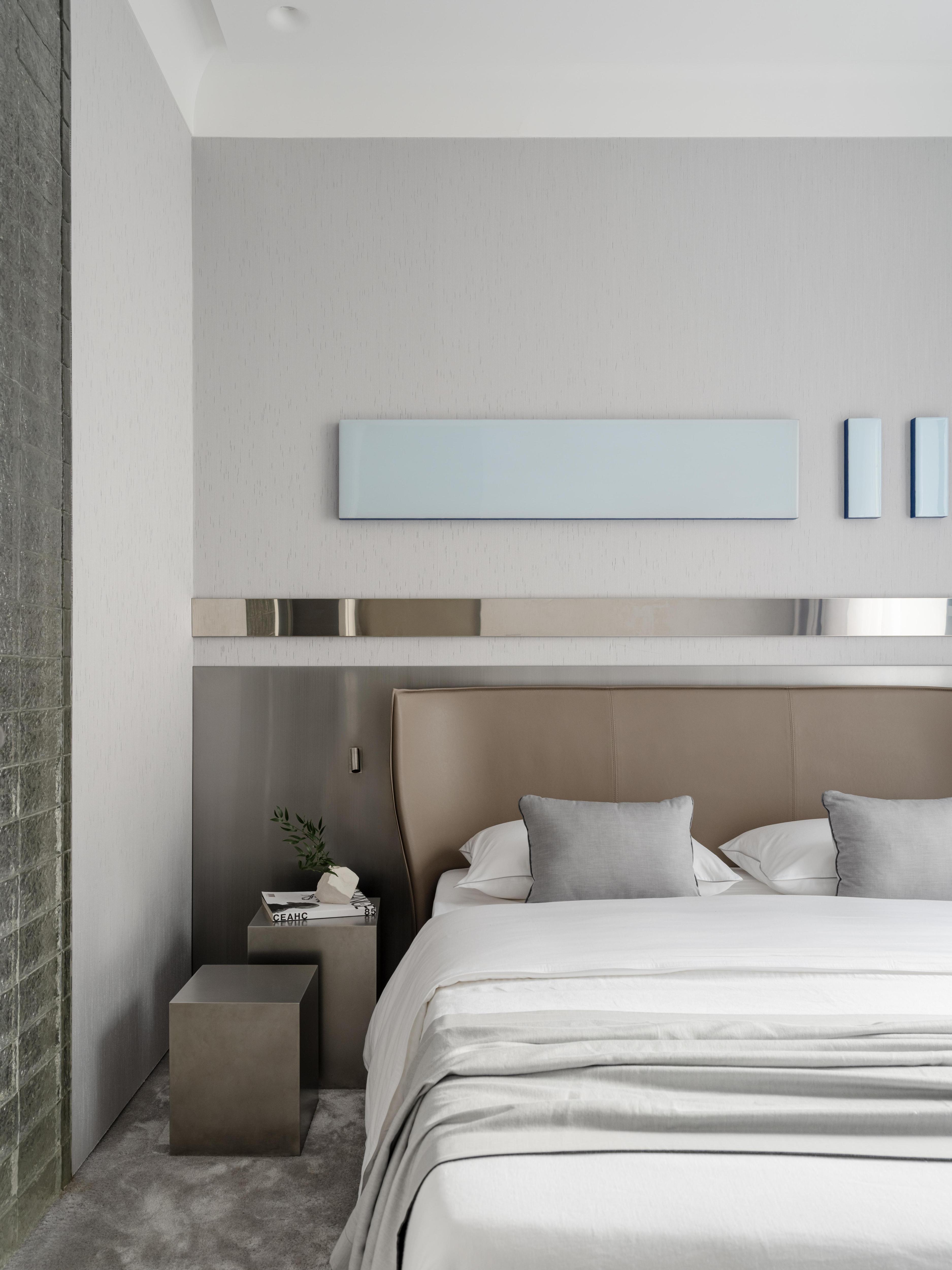 Интересной получилась и спальня. Сначала кажется, что металл и геометрические очертания делают ее довольно строгой для места отдыха и расслабления, но это только с первого взгляда. Гладкие поверхности отражают свет, делают комнату спокойной и сбалансированной. Слегка изогнутое изголовье будто «обнимает» кровать, создавая ощущение безмятежности.