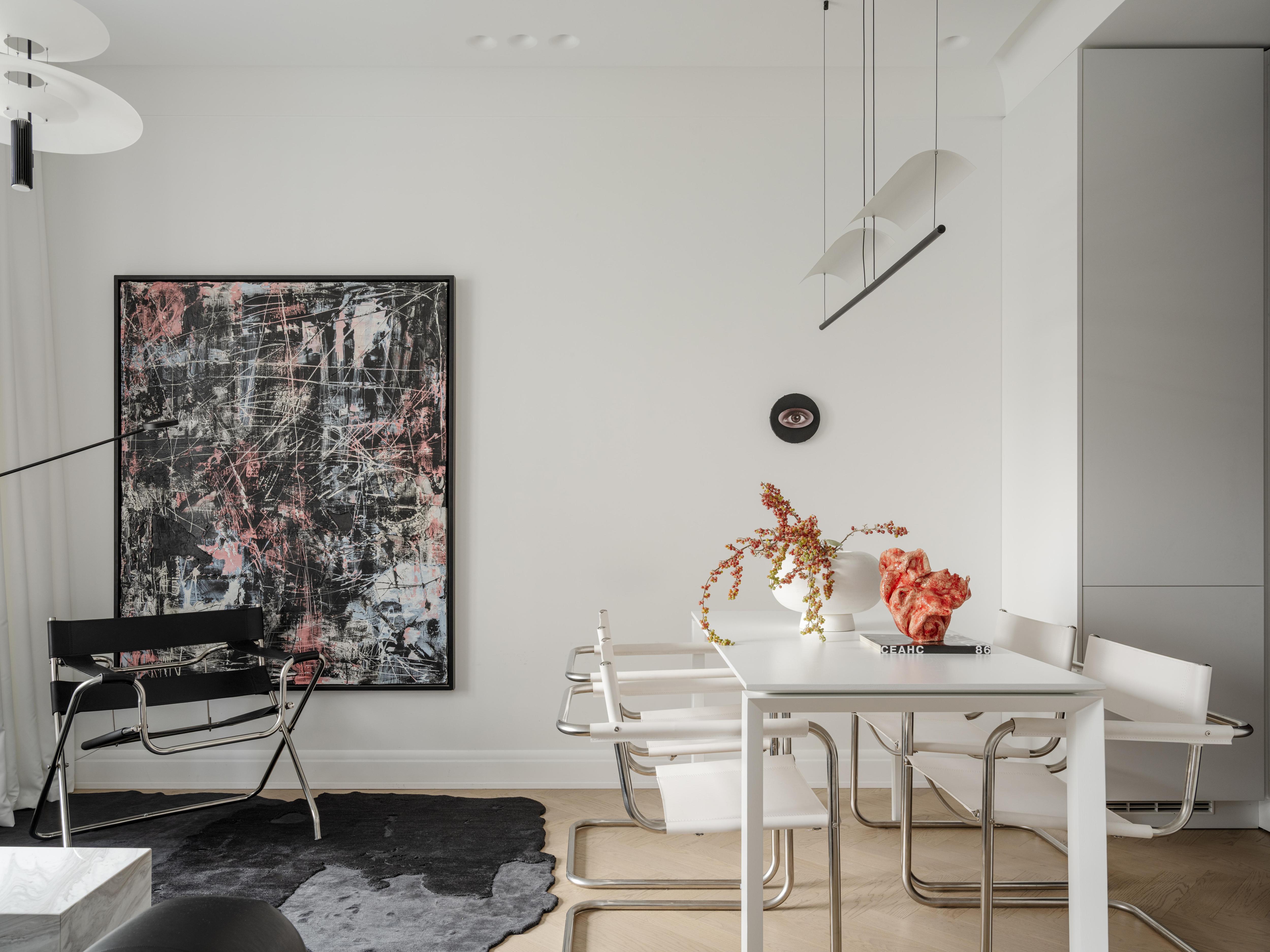 Картина слева, Кирилл Басалаев, галерея Plush. Картина справа, Art&Brut. Белая ваза, 101 Copenhagen. Ваза, Izzy Decor. Ковер, Dovlet house. Встроенные гипсовые светильники, Novotech.