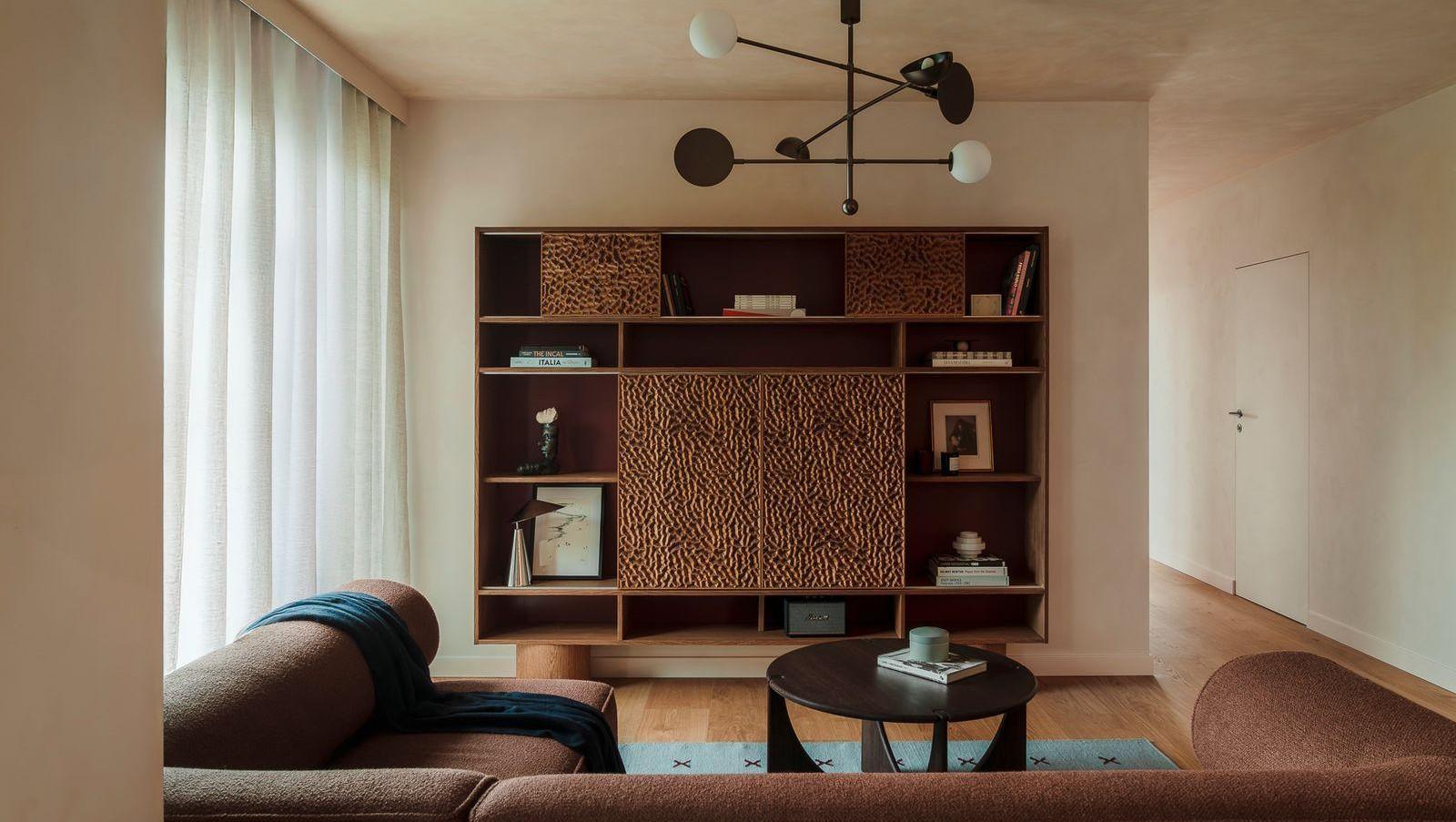 Модульный диван Eave, Norm Architects для Audo Copenhagen. Кофейный столик, Miloni. Ковер ручной работы Cross Blue/Burgundy, Nordic Knots. Подвесной светильник, 101 Copenhagen. Стеллаж для ТВ и книг был специально спроектирован Studio Bosko для этой квартиры.