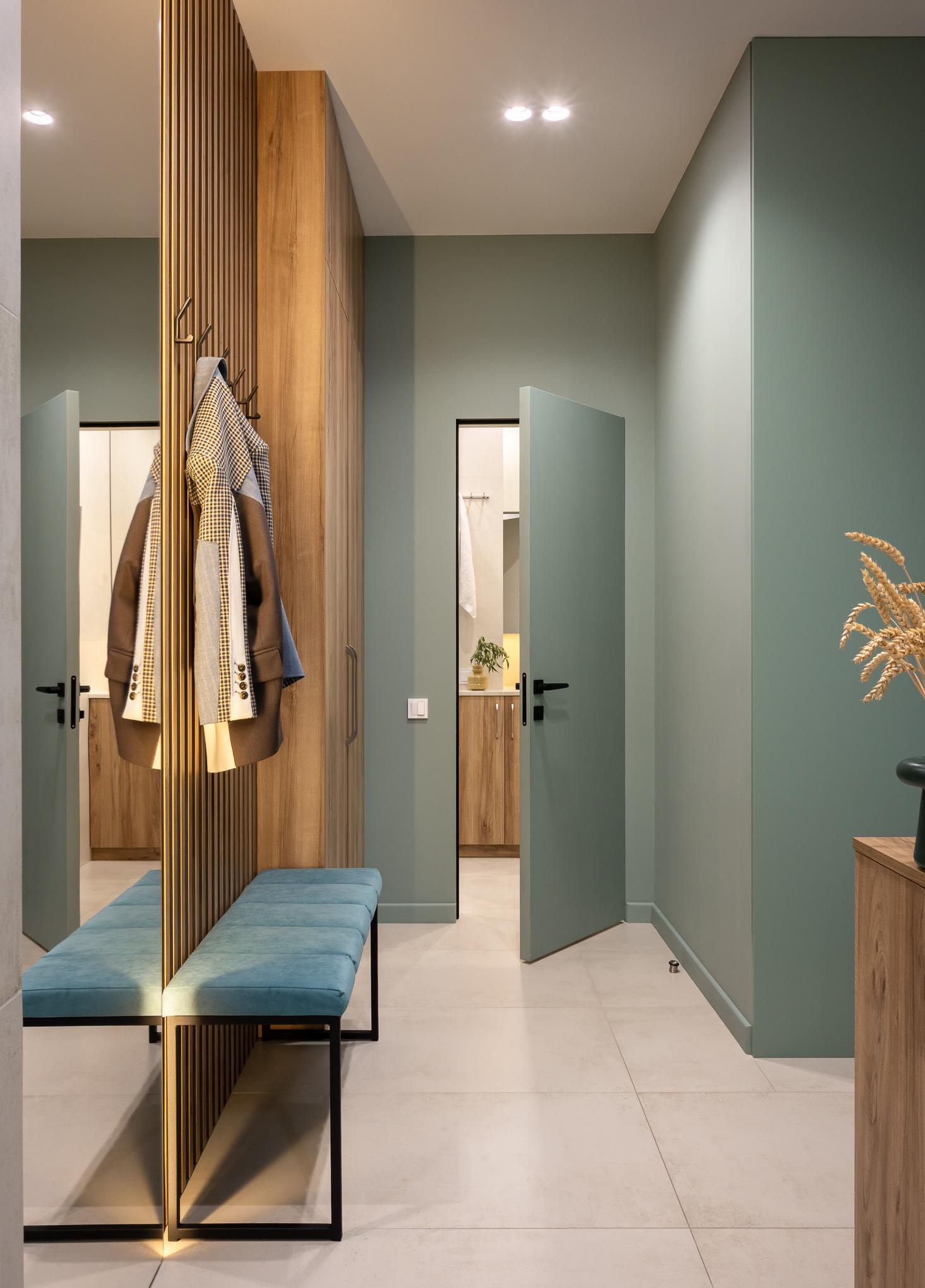 Здесь очень удобная система хранения с антресолью сверху — мы расположили ее симметрично, по обе стороны от входа.