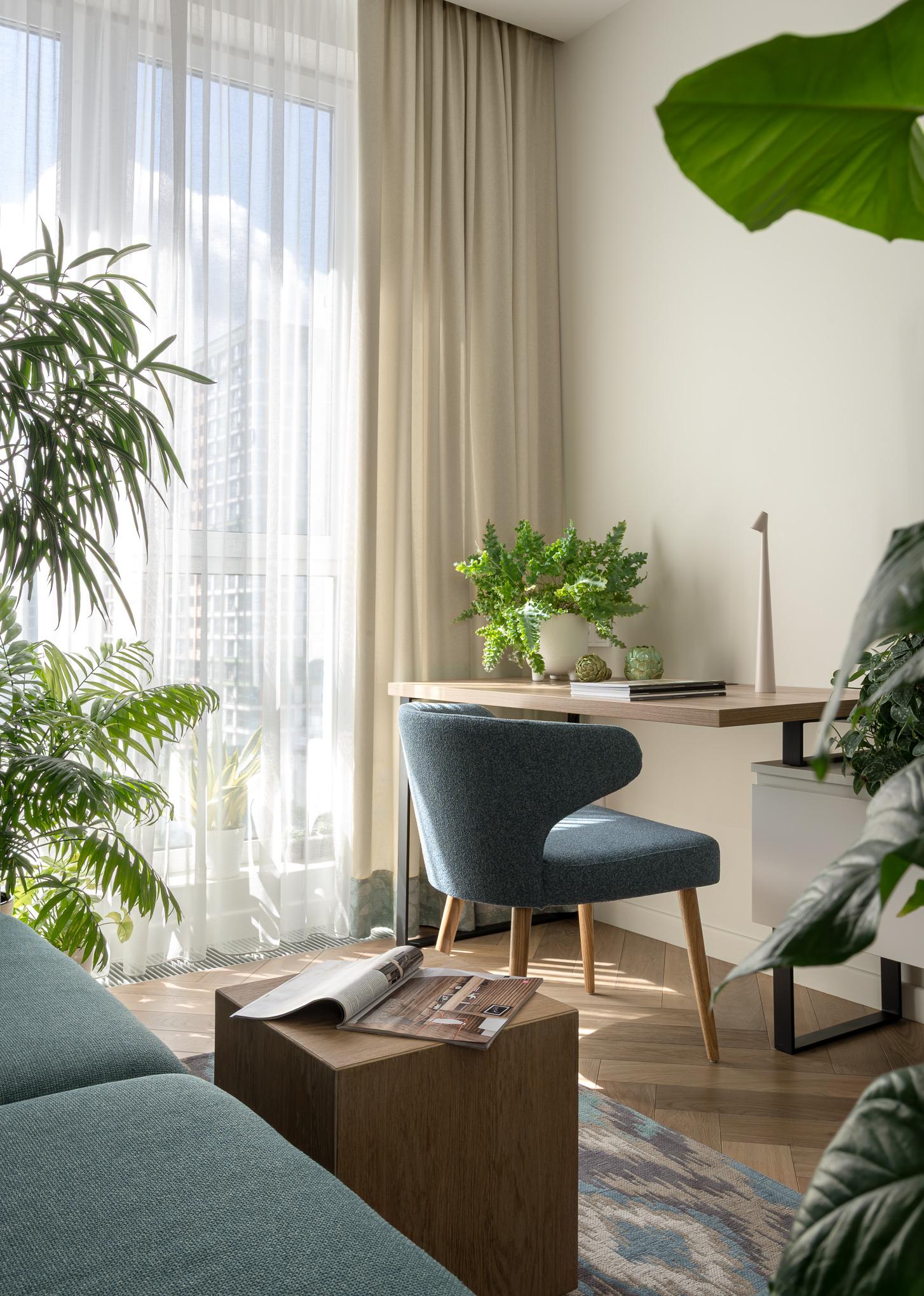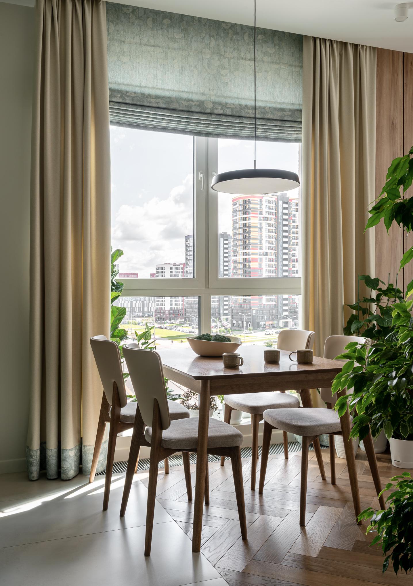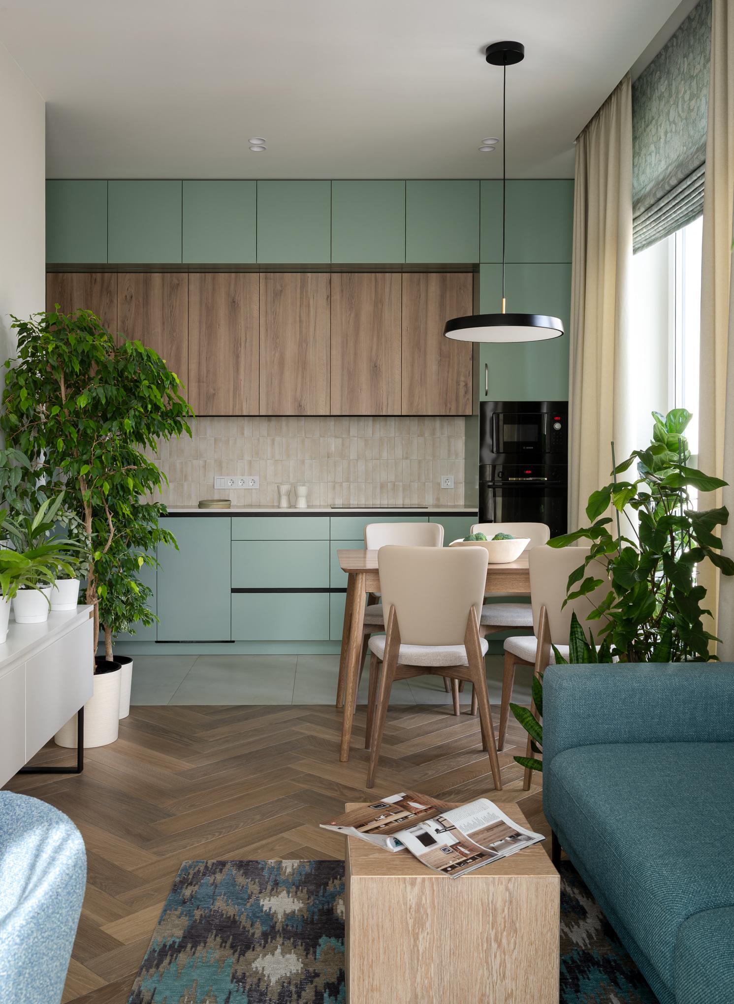 Обеденная группа у окна позволяет наслаждаться завтраком с красивым видом — своего рода «живой телевизор». Здесь очень много живых растений! С ними прекрасно сочетаются оттенки мятно-зеленого и бирюзы, теплый тон натурального дерева и песочно-бежевая гамма служит спокойным фоном, а завершают композицию акценты горчично-желтого и голубого. Я всегда рассматриваю квартиру как единый организм: переходя из комнаты в комнату, важно ощущать единую историю. Цвета и принты могут меняться, но общее настроение должно оставаться цельным.
