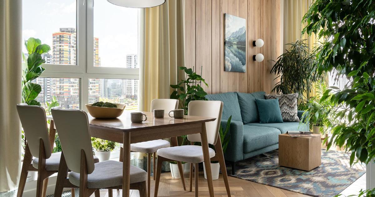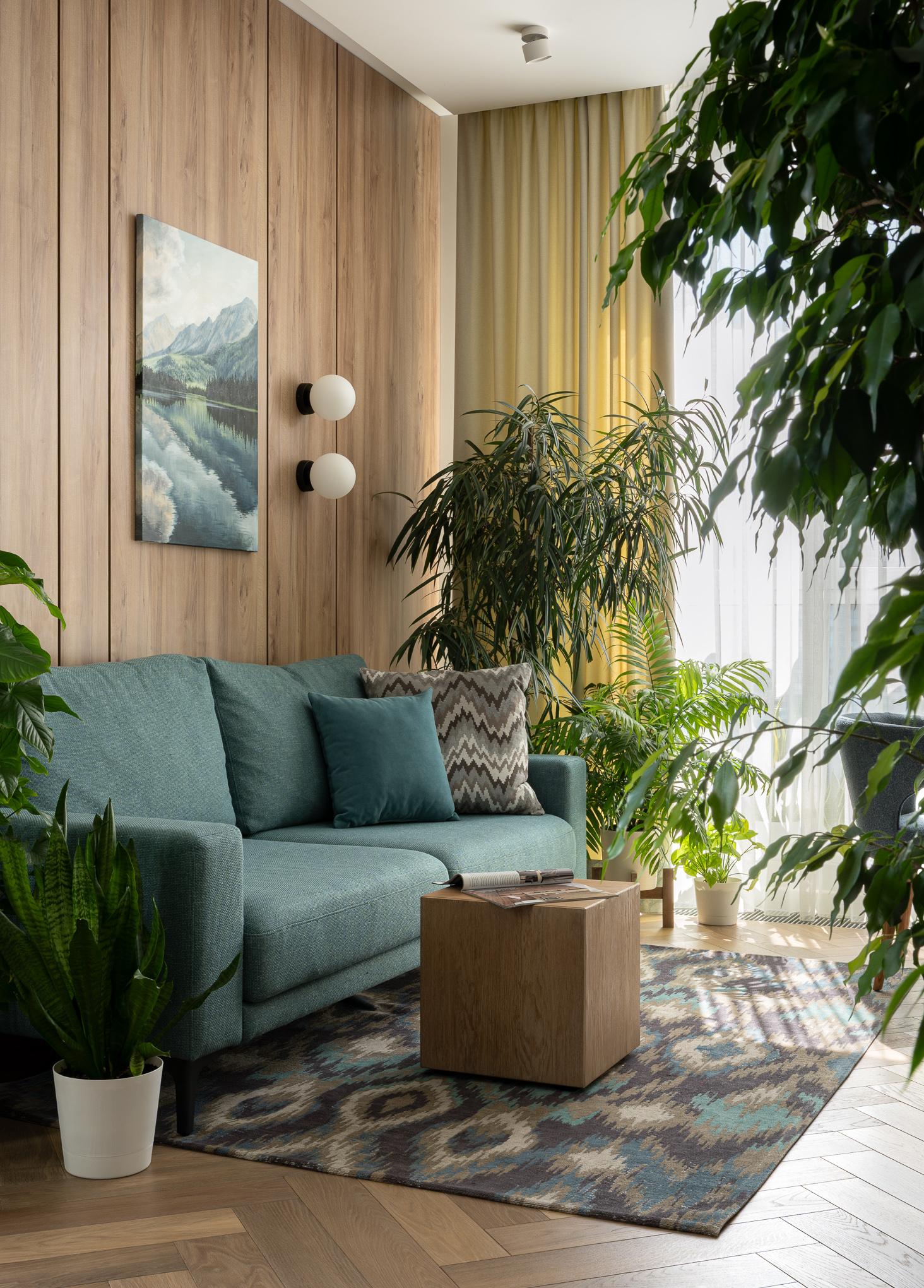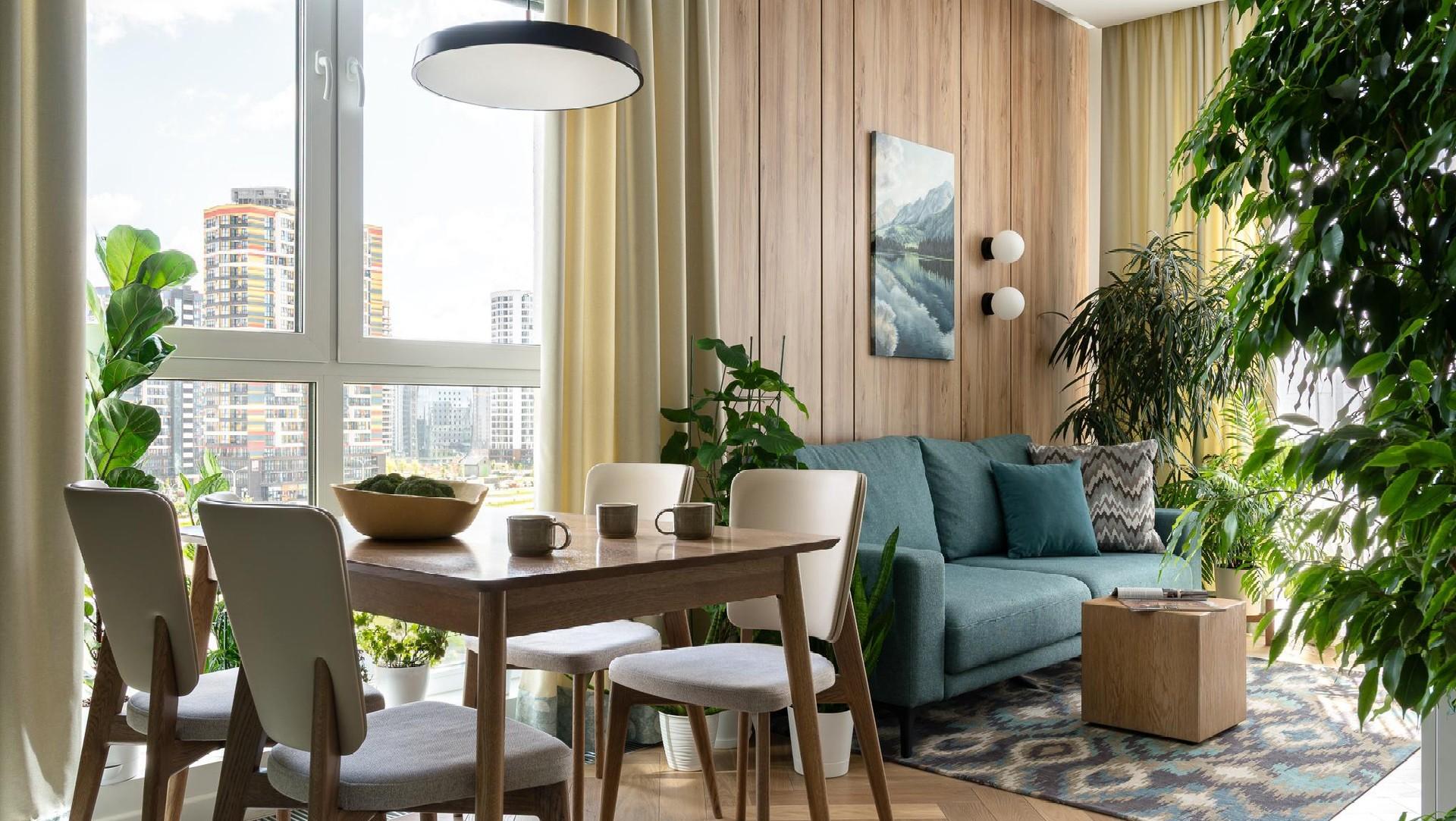 Обеденная группа у окна позволяет наслаждаться завтраком с красивым видом — своего рода «живой телевизор». Здесь очень много живых растений! С ними прекрасно сочетаются оттенки мятно-зеленого и бирюзы, теплый тон натурального дерева и песочно-бежевая гамма служит спокойным фоном, а завершают композицию акценты горчично-желтого и голубого. Я всегда рассматриваю квартиру как единый организм: переходя из комнаты в комнату, важно ощущать единую историю. Цвета и принты могут меняться, но общее настроение должно оставаться цельным.