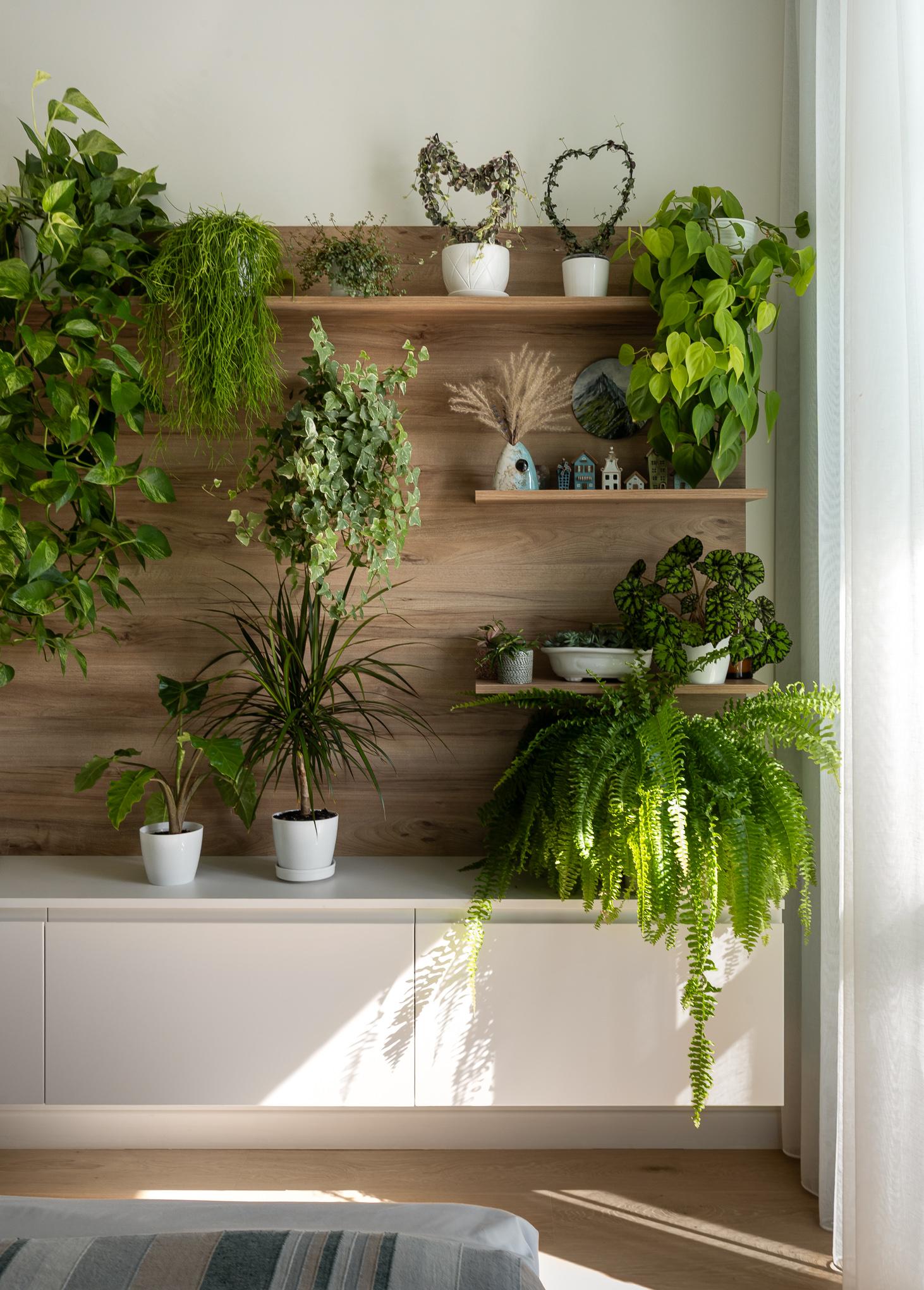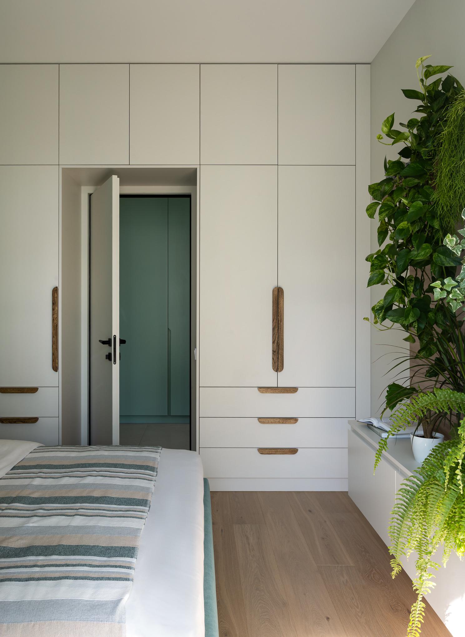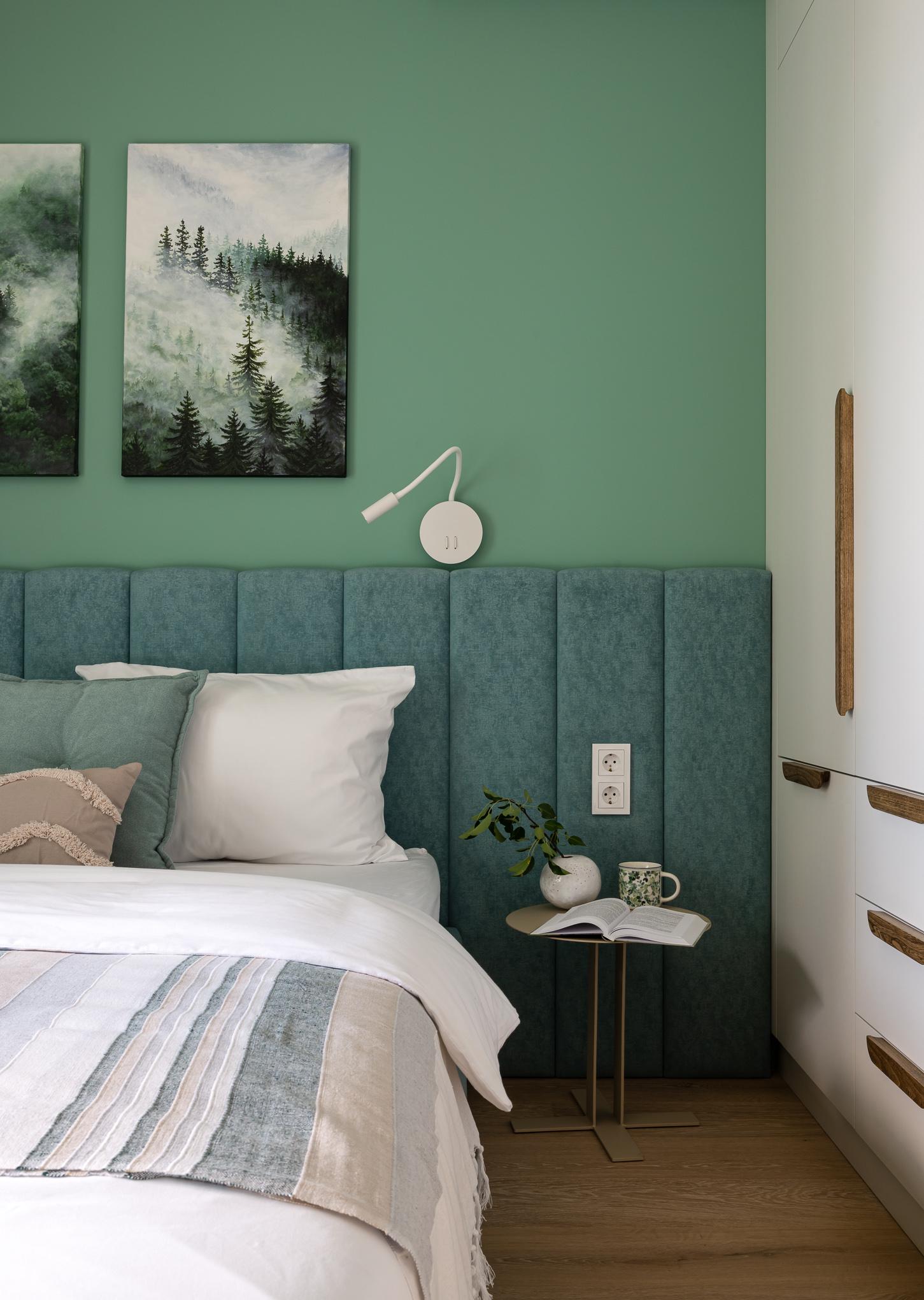 Палитра в спальне напоминает уединенное морское побережье. Чтобы поддержать живость зеленых растений, стену за изголовьем я предложила оформить в насыщенном цвете. Его дополняют мягкие панели, близкие по тону. А еще из спальни есть выход на лоджию — растения есть и там!