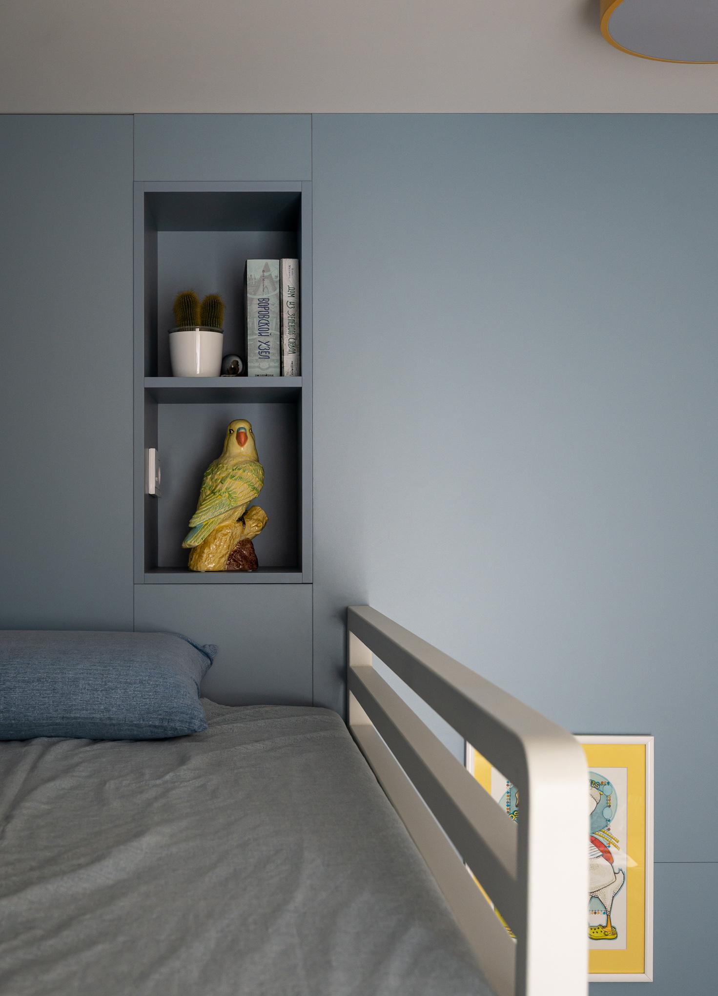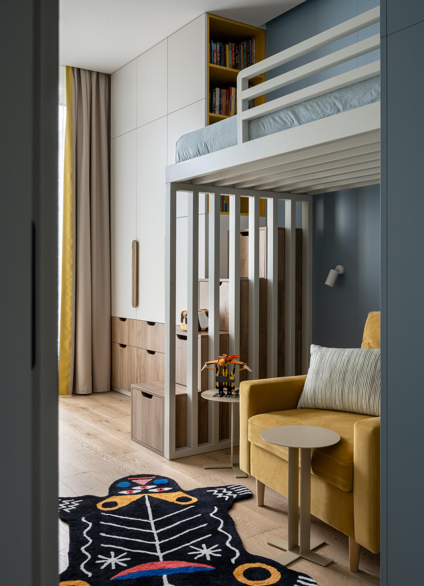 Главное пожелание для детской — кровать на верхнем ярусе. Для нижнего мы оставили 1,6 метра, здесь получился уютный уголок для чтения, а в будущем здесь можно разместить диван для гостей. К кровати можно подняться по ступеням с выдвижными ящиками.