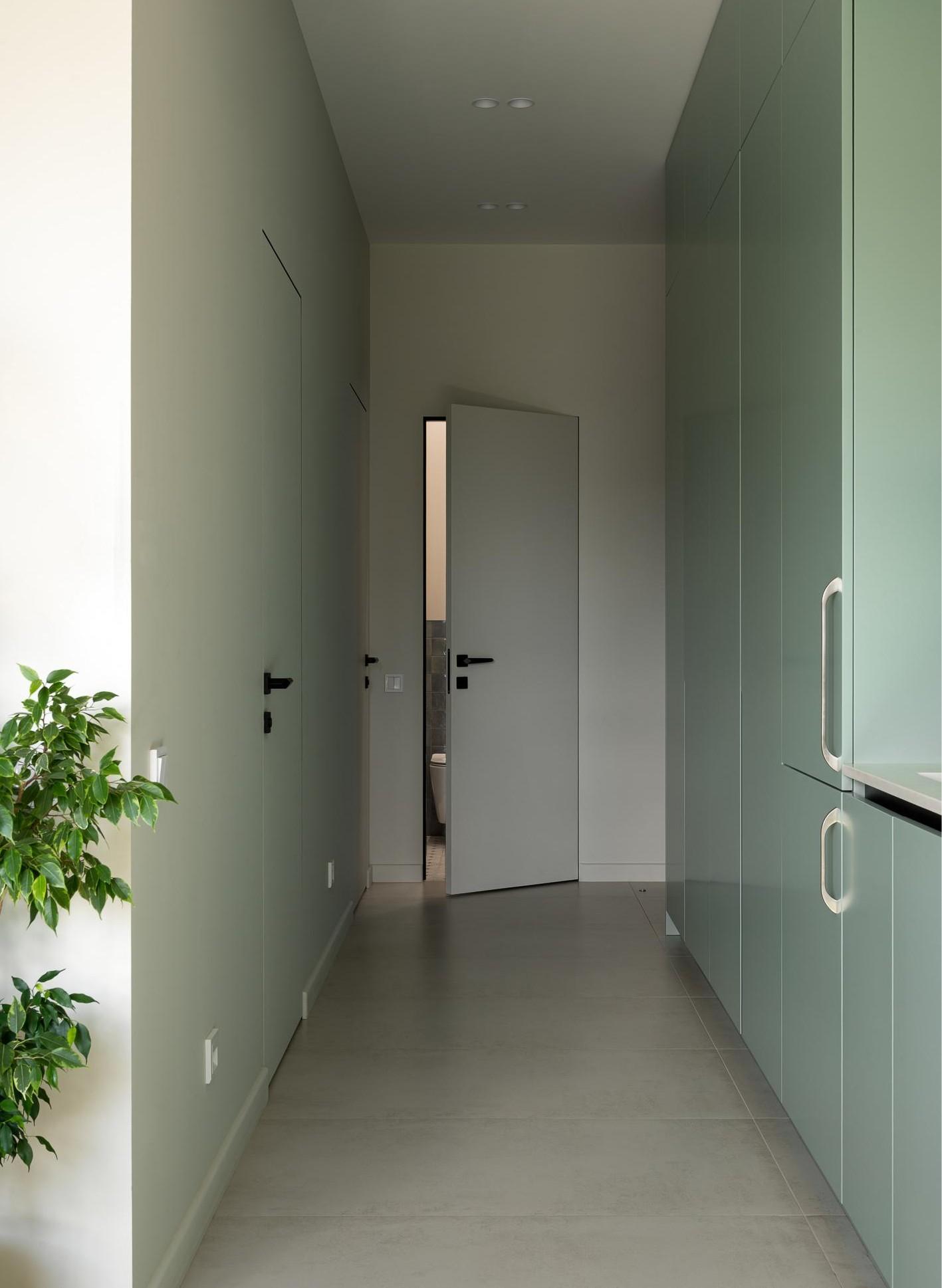 Обычно при проектировании я стараюсь избегать коридоров, чтобы эффективно использовать площадь. Но заказчикам с коридором удобнее, поэтому я старалась объединить его с остальным пространством с помощью цвета и мебели. Как я это сделала? Две зоны объединяет вместительная система хранения с той же отделкой, что и кухонный гарнитур. Благодаря такому приему вся длинная мебель не выглядит громоздко и «по-кухонному», она не выбивается и грамотно вписывается в общую планировку. К тому же, коридор выходит к окну — так он не кажется длинным и «давящим».