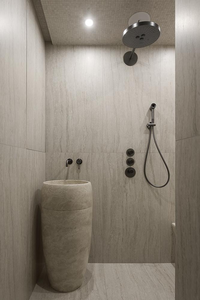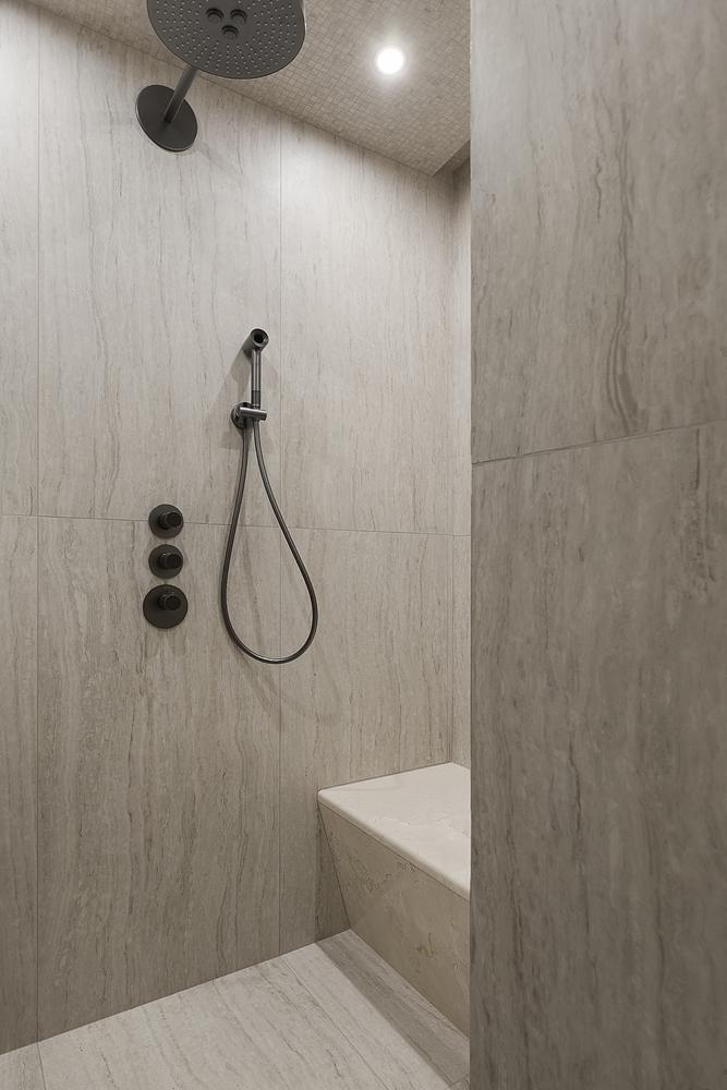 Керамогранит Italy Marvel Fior di Bosco Hammered, Atlas Concorde. Ванна, Abber. Смесители, Boheme. Душ, Gunon.