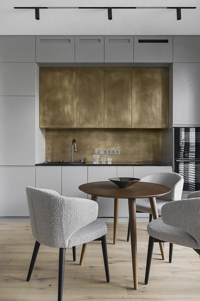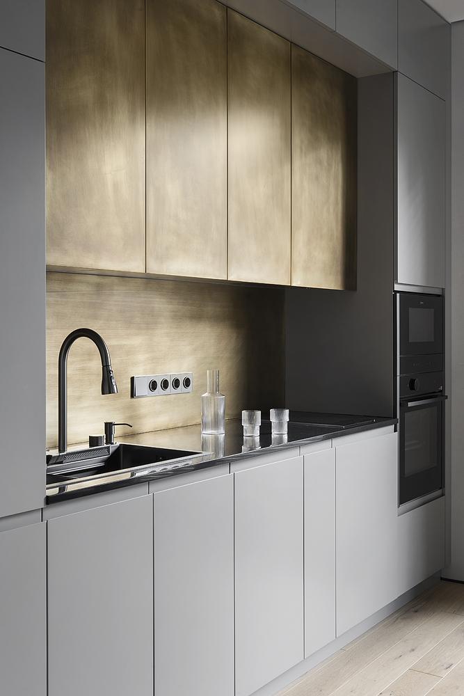 Вся корпусная мебель изготовлена на заказ. Особенно выделяется экспериментальный кухонный гарнитур — верхние фасады и фартук сделаны из натуральной латуни с эффектом благородной патины. Воплотить эту задумку было непросто, подрядчика нашли не сразу. Поначалу даже думали о декоративной штукатурке с металлизированным эффектом, потом о жидком металле… Выбрали мы, конечно, самый сложный вариант, зато какой получился результат.