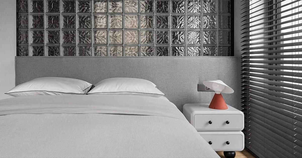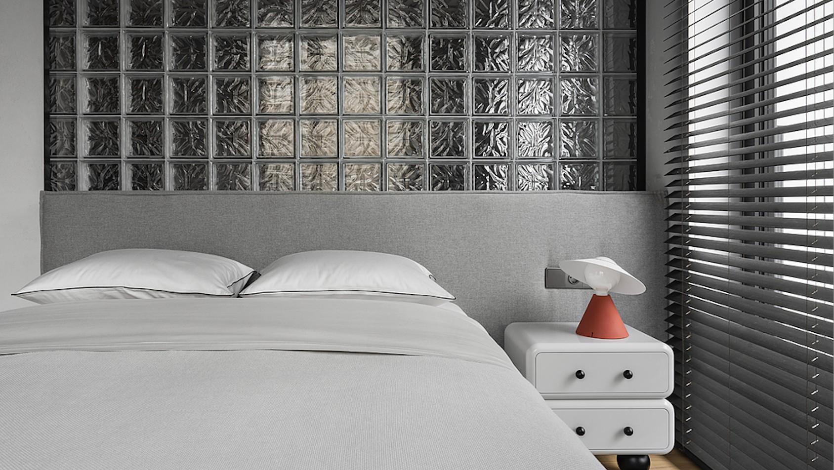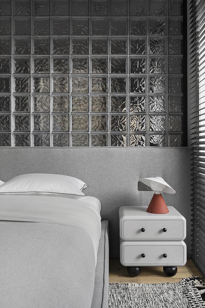 Жалюзи, Kado. Кровать изготовлена на заказ. Прикроватная тумба, My Barli. Настольная лампа Fante Red, Stilnovo. Постельное белье, Ateliertati.