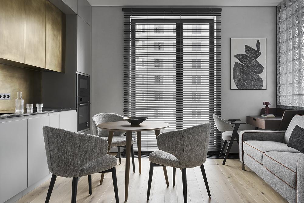 Интерьер небольшой квартиры в московском ЖК «Диалог» создавался для молодого человека, который планирует жить здесь один. Он был открыт к экспериментам и нашим идеям — главным для него было создать вневременной дизайн, который долго будет актуален. Заказчик работает в IT-сфере и часто бывает в разъездах, поэтому дом для него — место отдыха, расслабления и восстановления. Здесь есть не только кухня-гостиная, спальня и ванная, но и уютный хаммам.
