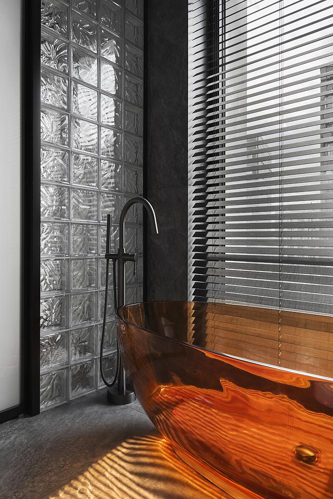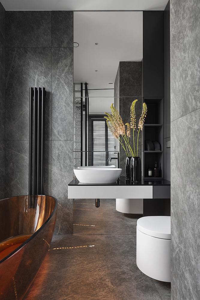 Самый необычный акцент мы спрятали в ванной комнате: прозрачная отдельностоящая оранжевая ванна выглядит очень неожиданно. Она стоит прямо у окна, которое прикрывает жалюзи, и днем можно наблюдать красивую игру света и тени. Яркий насыщенный цвет отлично сочетается с графичным серым фоном.