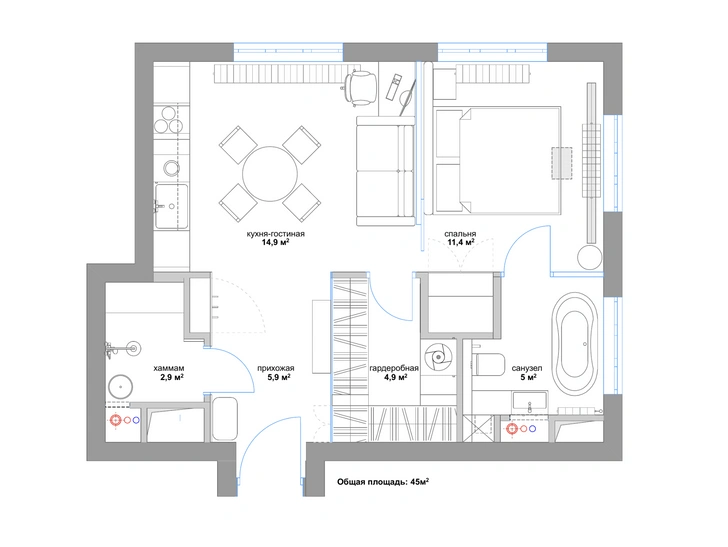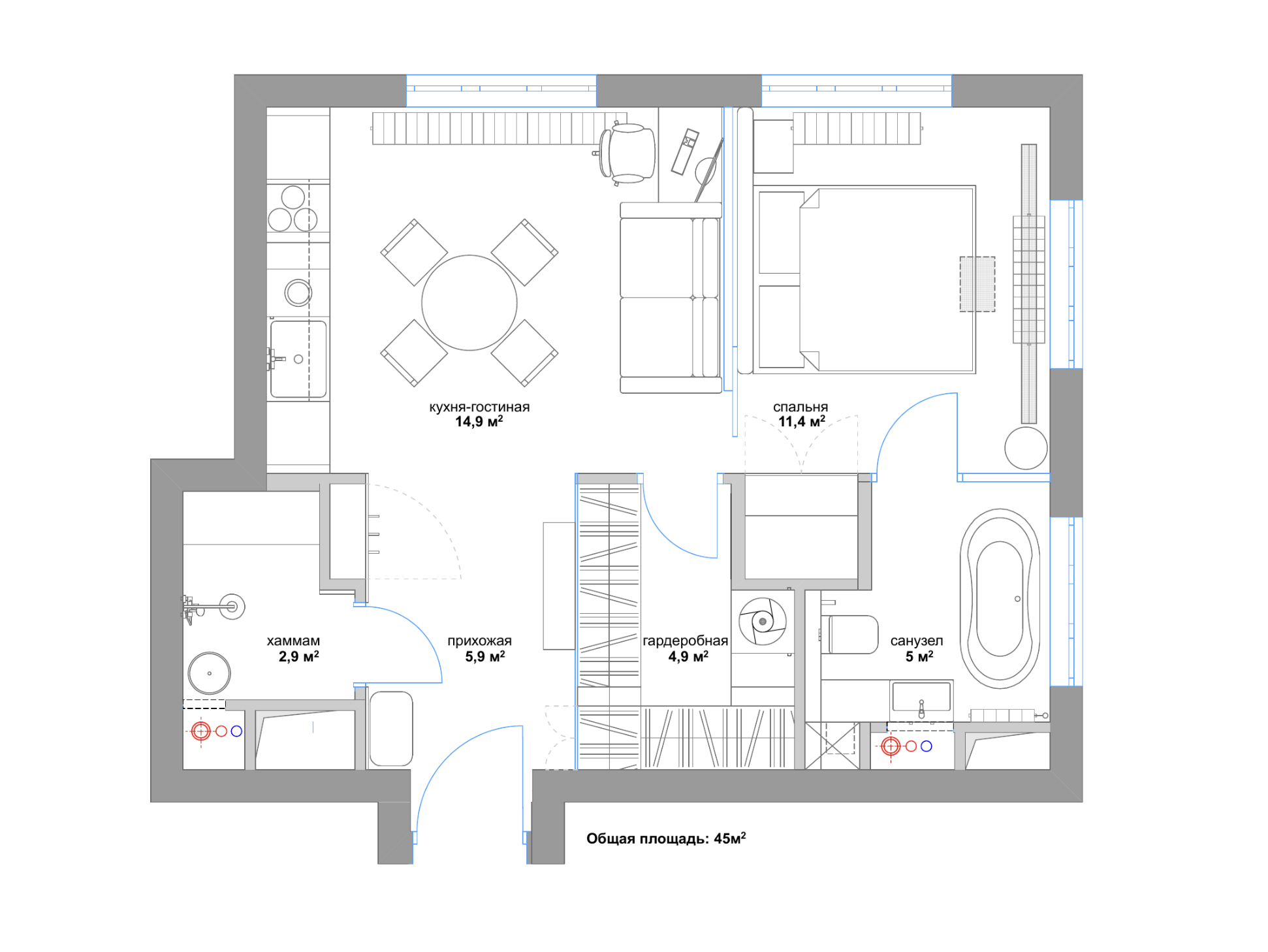 План квартиры 45 м². Проект студии «Точка Дизайна».