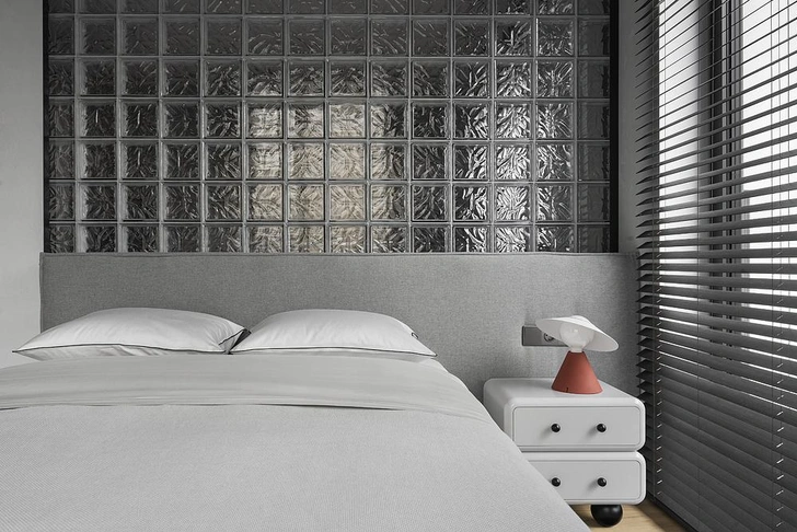 Небольшой метраж, конечно, диктует свои ограничения, но в то же время это повод подумать над интересными приемами зонирования. Между кухней-гостиной и спальней возвели стену из стеклоблоков, они пропускают свет и придают ощущение легкости. Такое решение помогает избежать грубого дробления на зоны и создает приватность, ощущение уединенности.