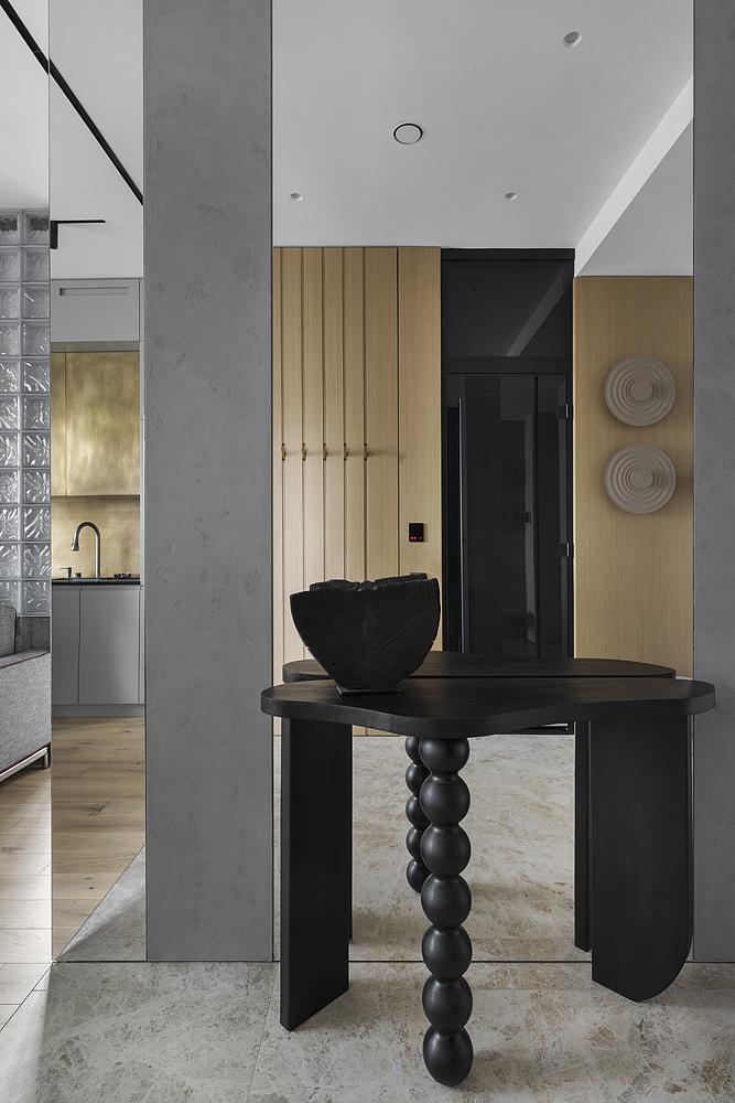 Шпонированные панели, «Швед Мебельные Решения». Керамогранит Rus Victory White, Atlas Concorde. Бра, Maytoni. Консоль, Divan.ru. Скульптура в технике Yaki-sugi, Игорь Лукашенко, Modenature.