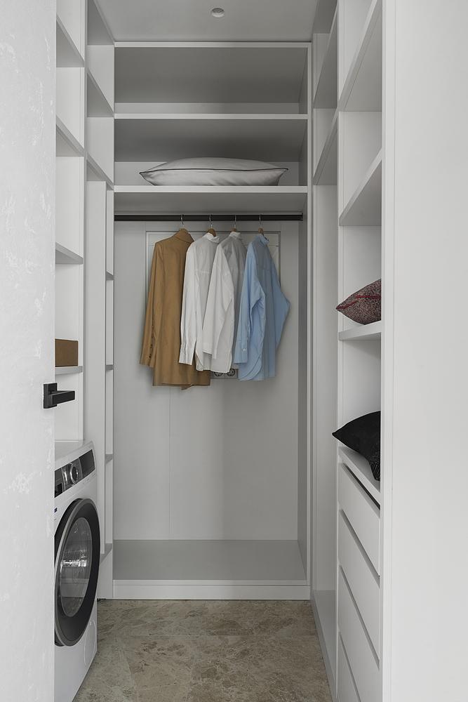 Нужно было не только продумать хранение, но и решить, как скрыть его от посторонних. Мы сосредоточили все в гардеробной — туда отлично вместилась не только одежда, но и постирочная зона.
