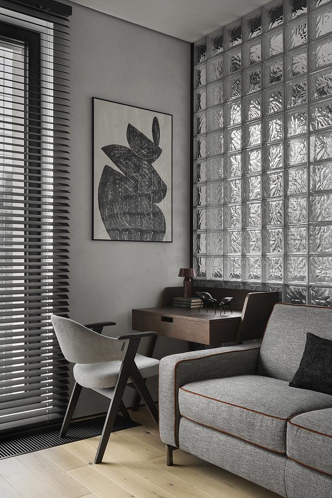 Птицы, Normann Copenhagen, L’Appartement. Стол, «Швед Мебельные Решения». Лампа, Marset, L’Appartement. Жалюзи, Kado. Диван Capriccio, Natuzzi Italia. Стеклоблоки Q19/0 MET, Neutro. Декоративная штукатурка и краска, Oboi1, Majestic. Арт-принт Stones, Алиша Бициева. Декоративная подушка, Ateliertati.