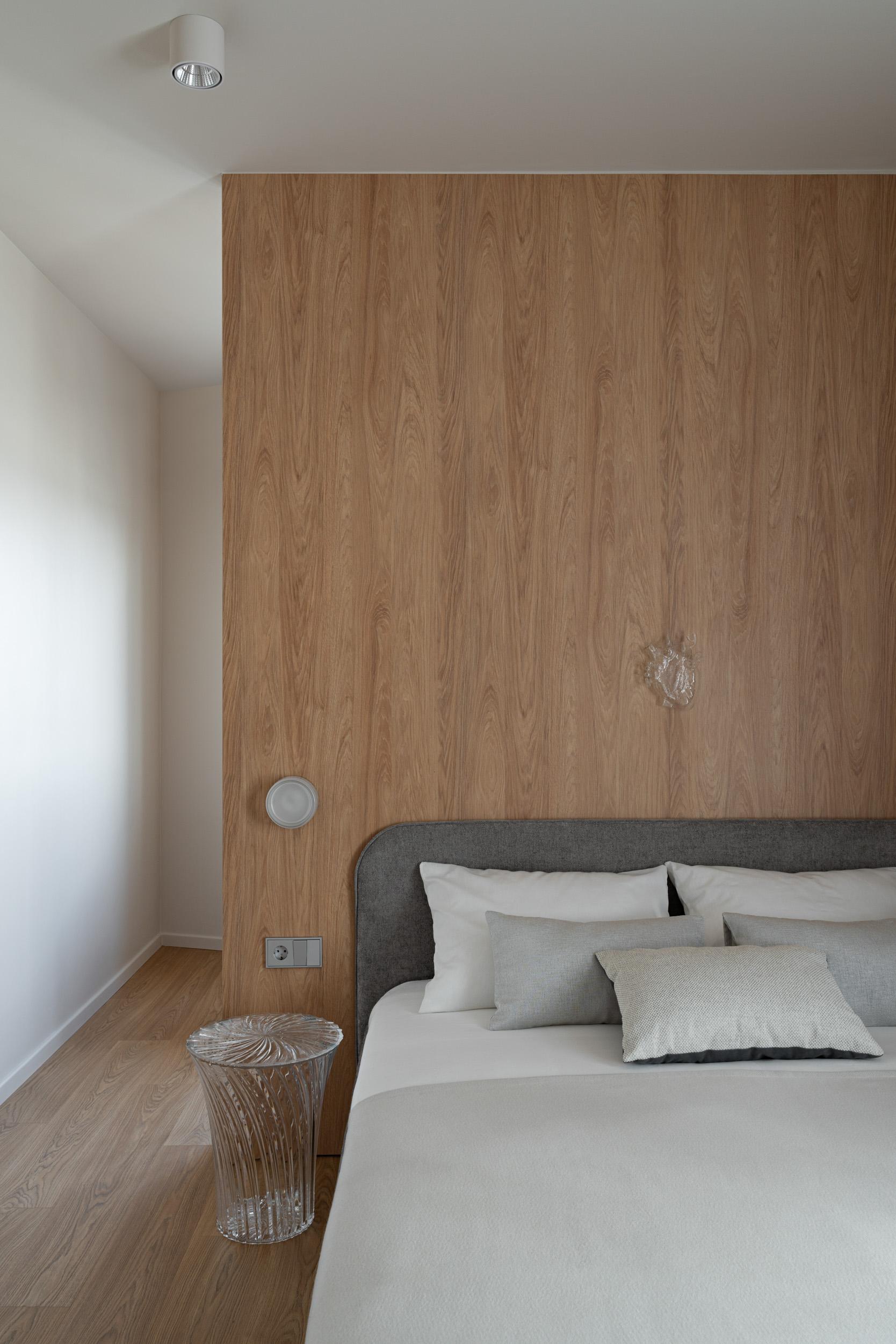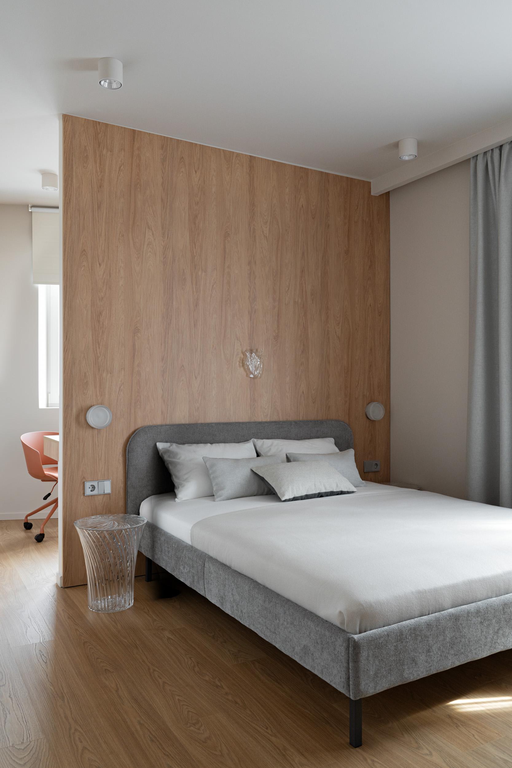 Сложную форму спальни с острым углом мы тоже обыграли с помощью перегородки: она не только выравнивает пространство, но и отделяет кровать от рабочей зоны и гардероба. Из интересных деталей здесь стеклянный столик и декоративное стеклянное сердце.