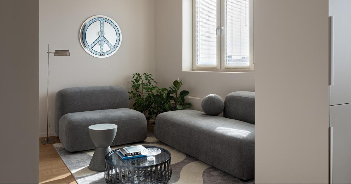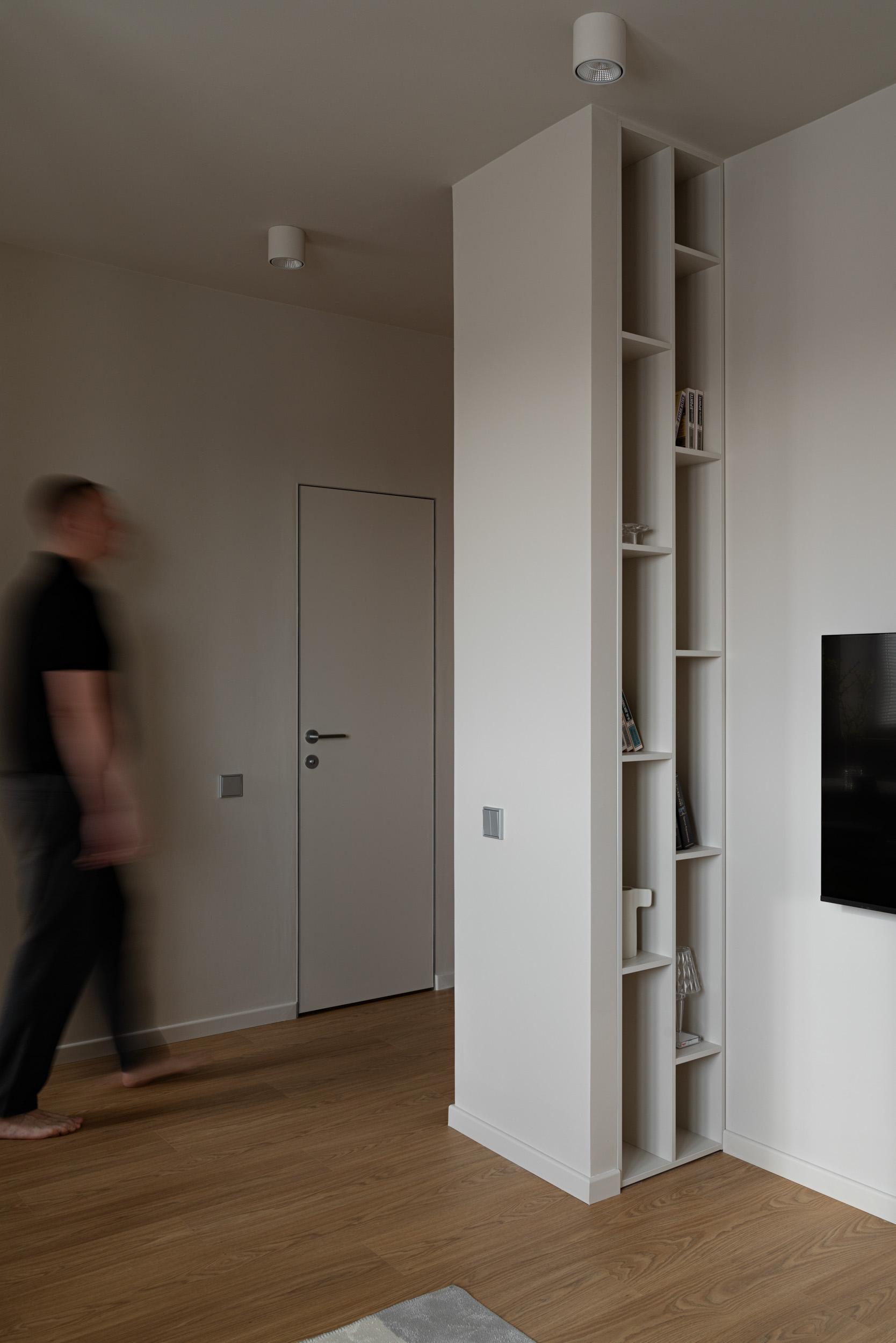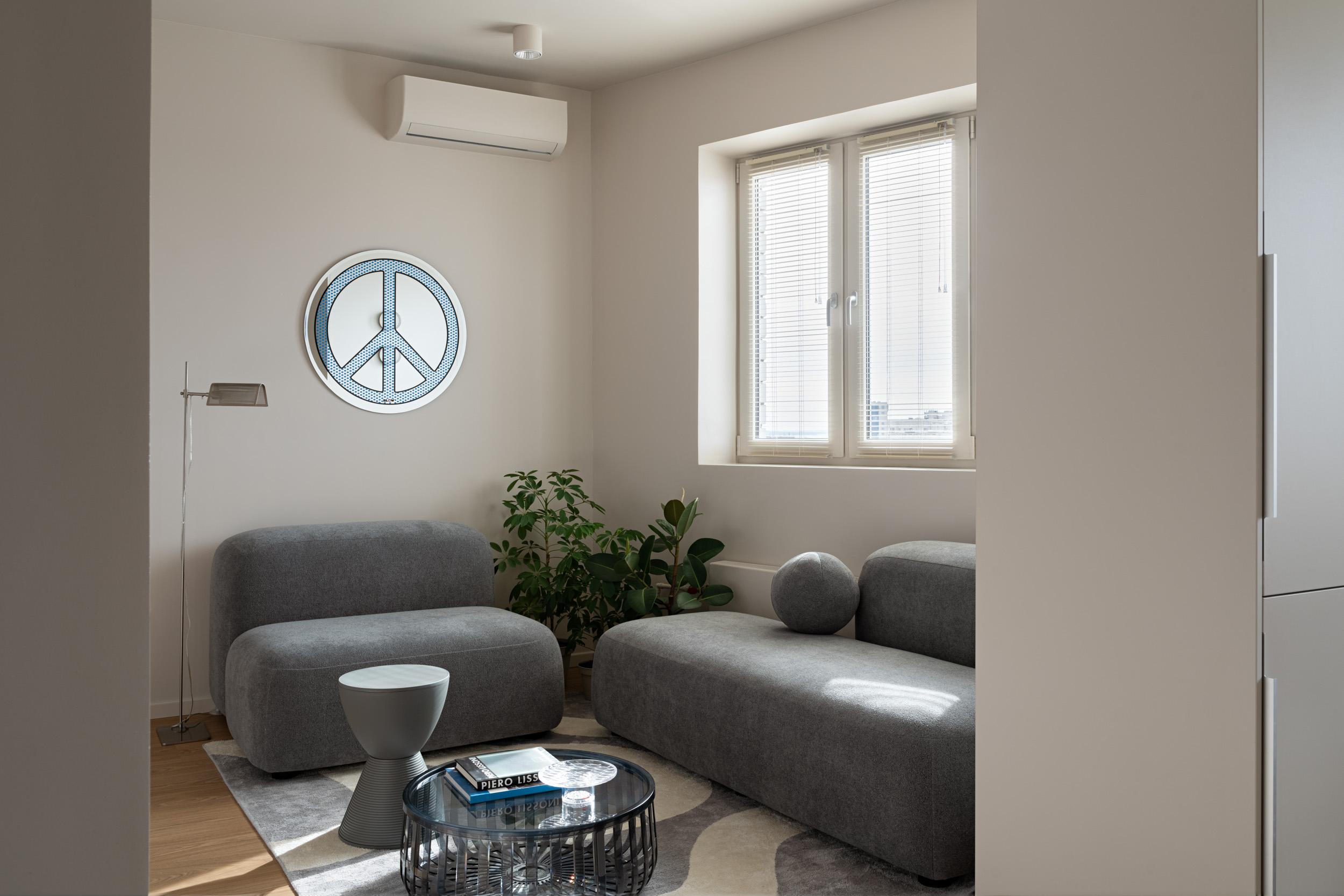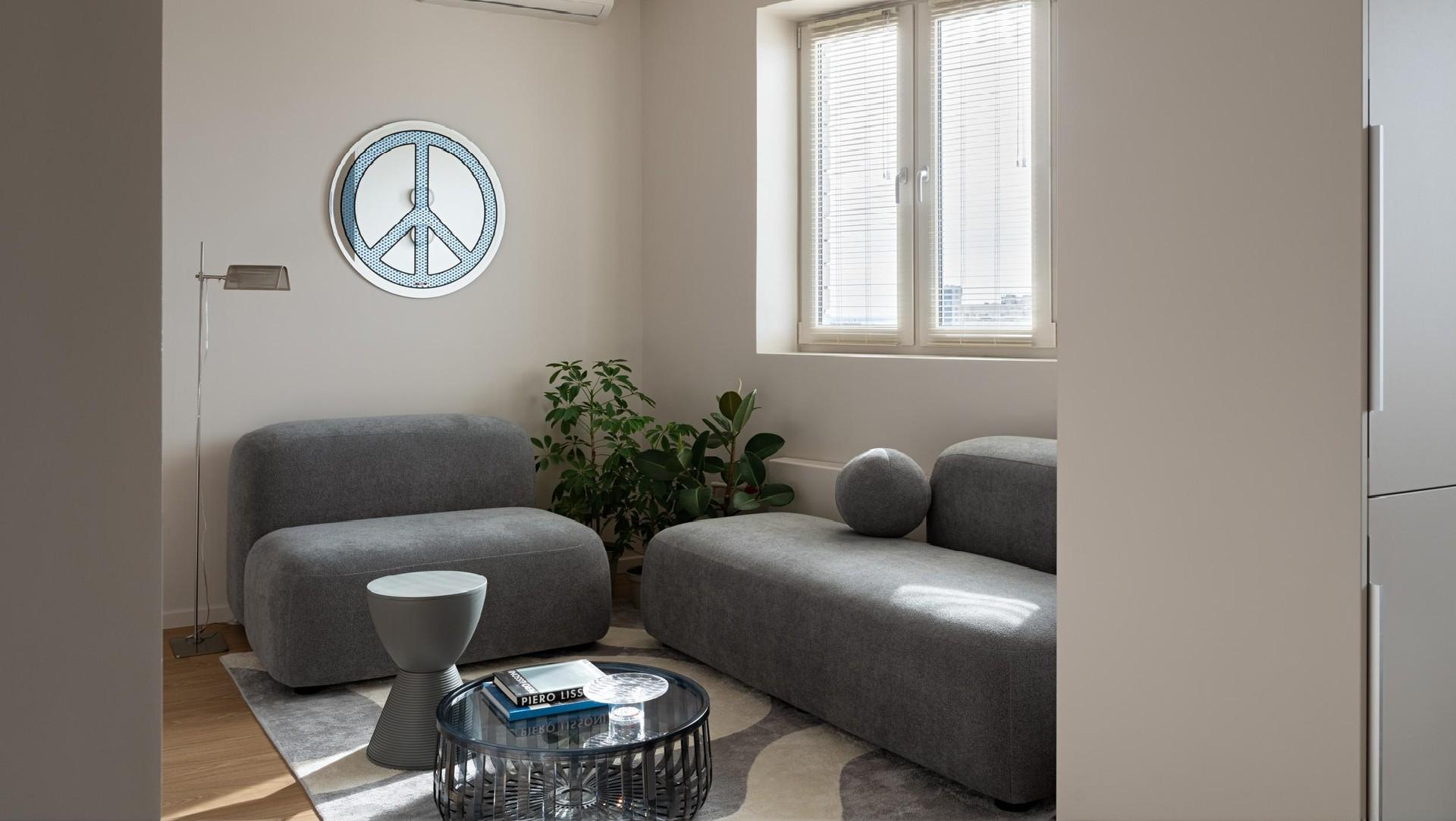 Акцентов здесь почти нет — все по минимуму. Наряду с монохромной белой отделкой мы использовали светлый оттенок дерева, он добавил пространству уют и тепло. Ритм интерьеру задала строгая геометричная мебель в сочетании с мягкими текстурами, плавными скругленными формами и интересным декором. Гости-арендаторы, кстати очень любят зеркало от Seletti над диваном — в нем сделано много селфи!