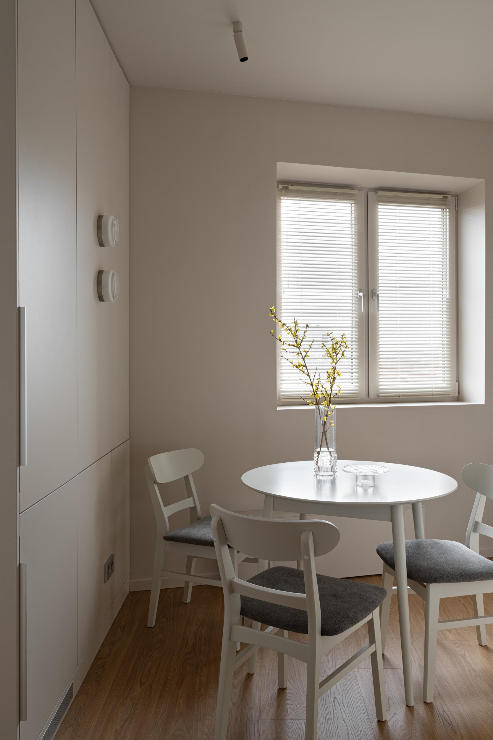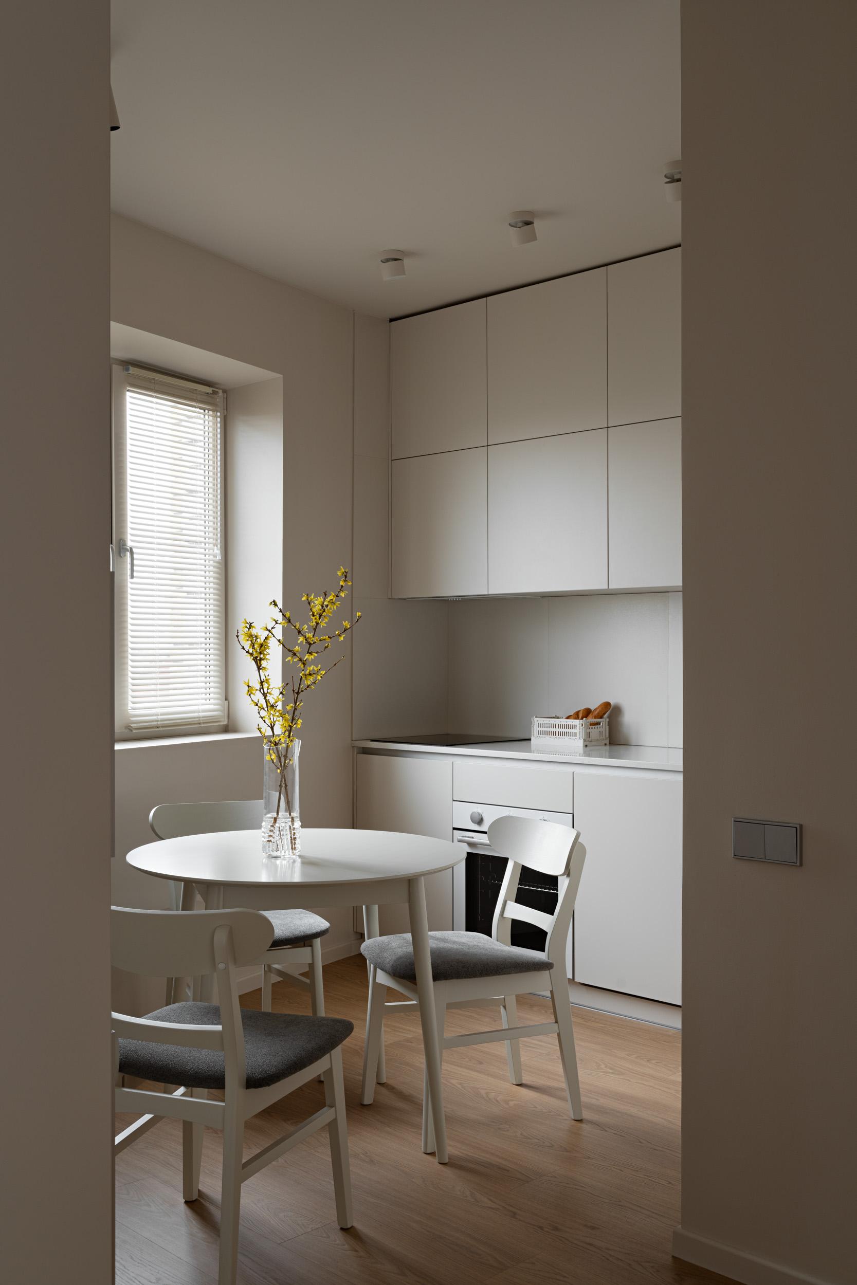 Кухню и гостиную разделяет пенал с холодильником — его мы «надели» на колонну. Белый гарнитур с лаконичными фасадами выглядит невесомо, он почти сливается со стенами и не загромождает небольшое пространство, не делает его тесным.