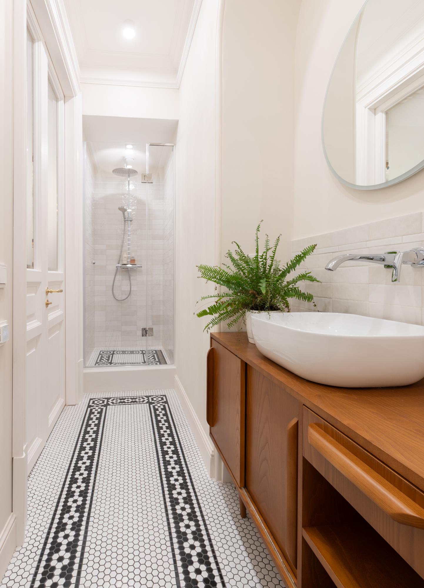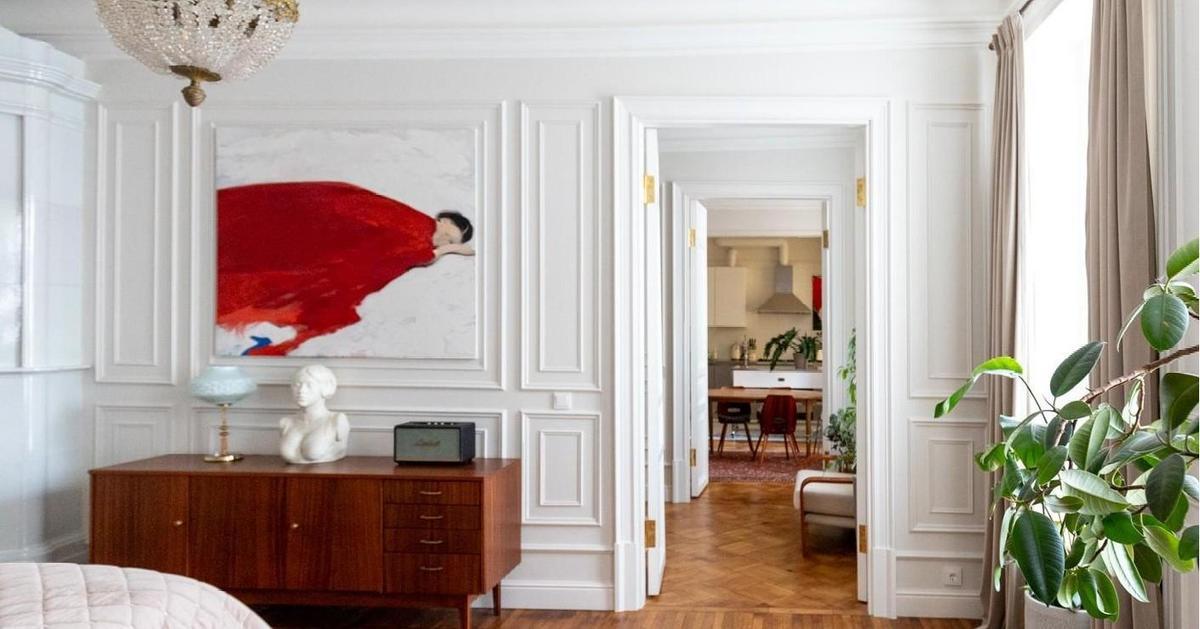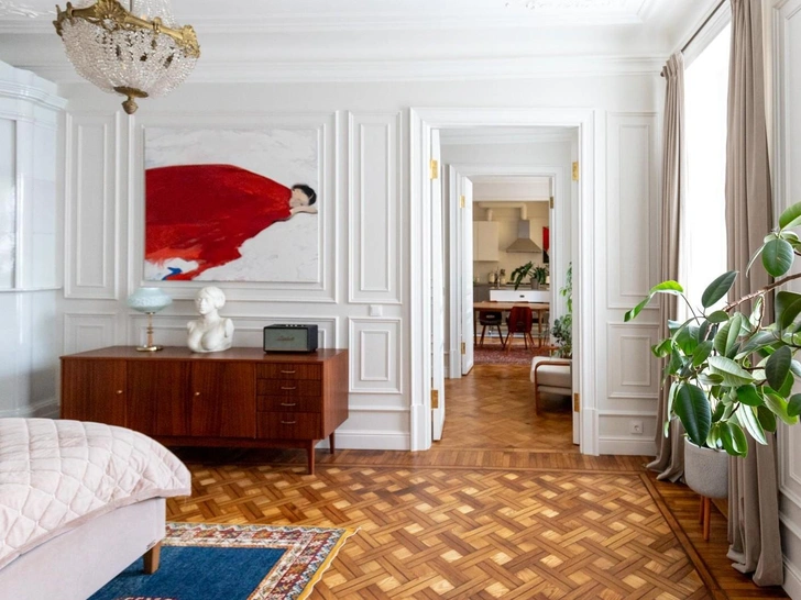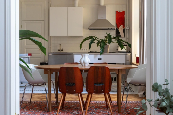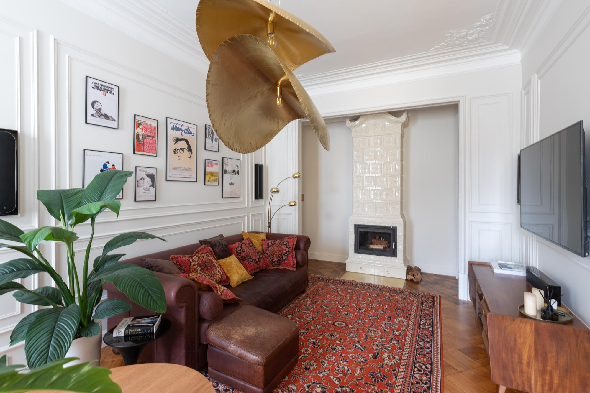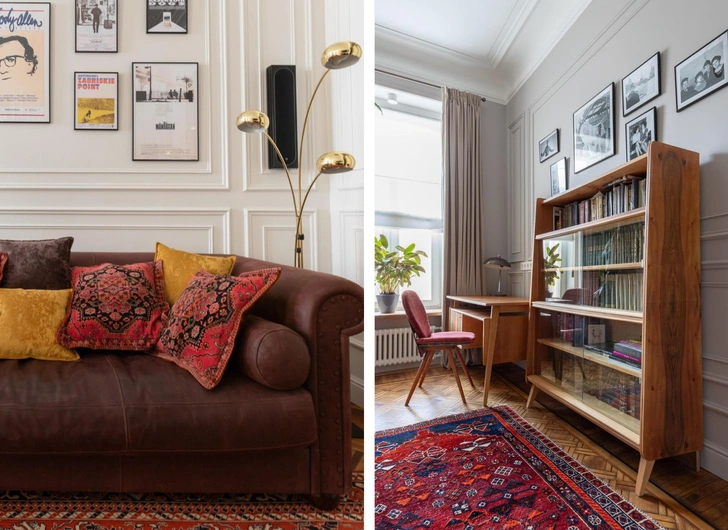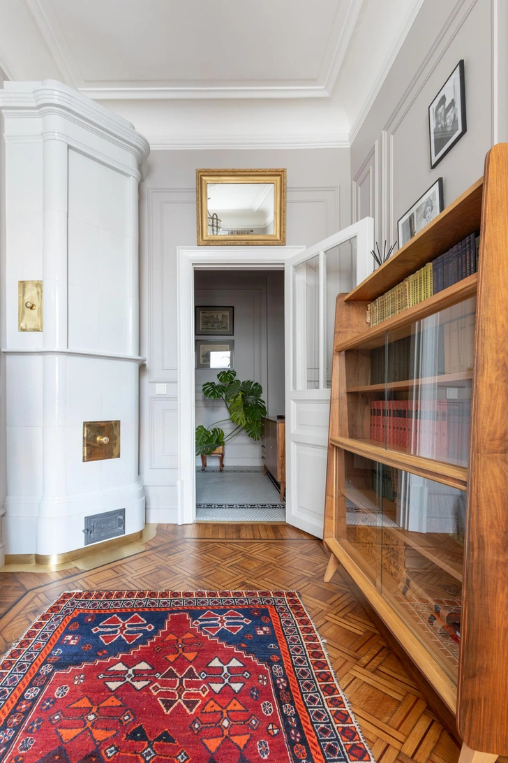 Хозяин — почитатель Петербурга, ценитель истории. В 1980-е он учился в Петроградском районе, рядом с Александровским парком. Квартира находится там же, в историческом доме — ему была важна атмосфера старого фонда. Детство и юность заказчик провел в интерьерах советского времени, где была популярна чешская, югославская и румынская мебель mid-century. Для него она ценна как воспоминание. Так у нас родилась идея вписать советскую мебель в дореволюционную квартиру с элементами стиля модерн.