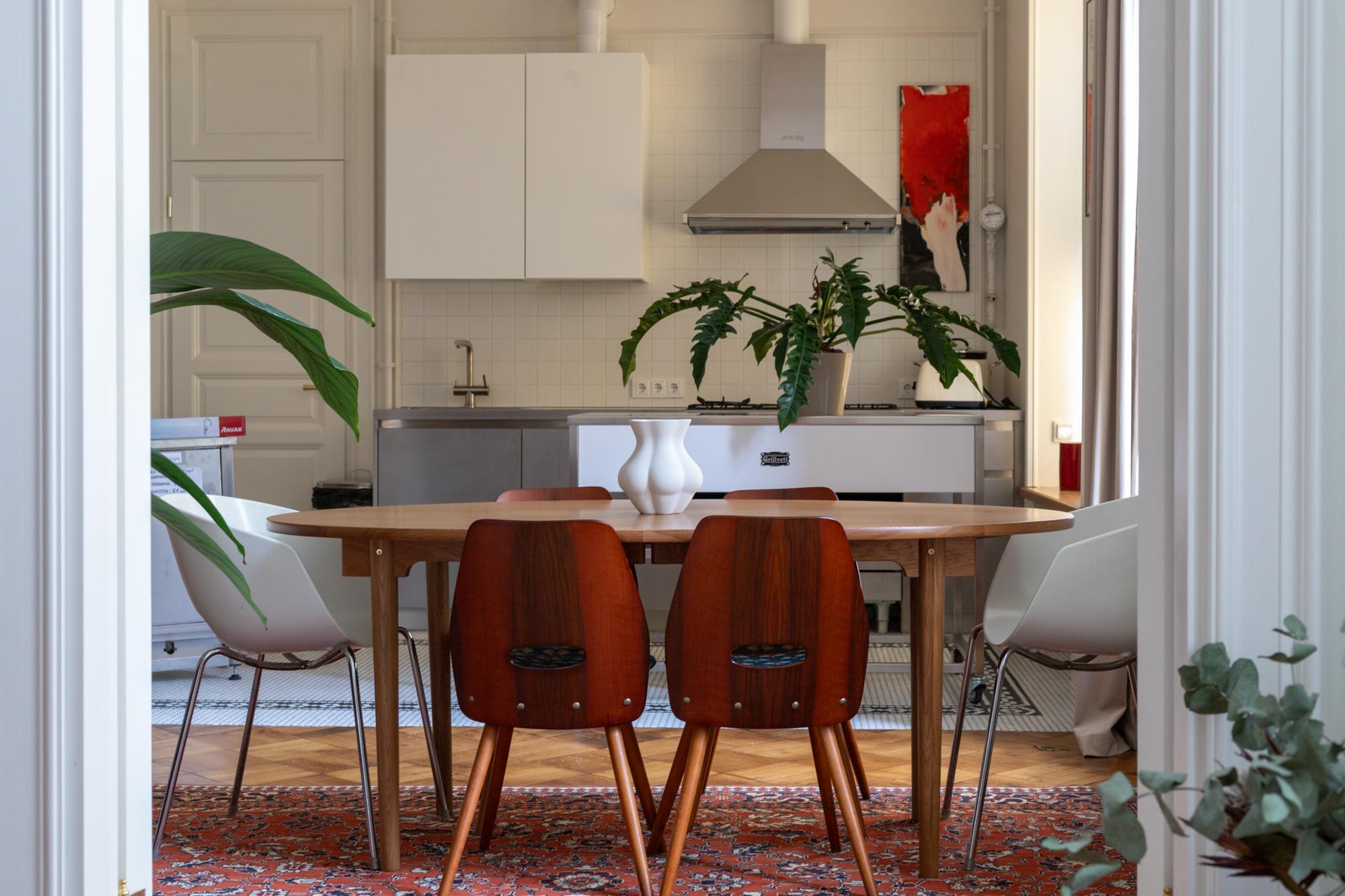 Среди предметов, которые созданы специально для проекта — дубовый шкаф в прихожей, который похож на антикварные образцы, и овальный стол в гостиной. За этим столом мы собрали ассорти винтажных стульев, которые создают неповторимую атмосферу. Они сочетаются с кожаным диваном Baxter и люстрой от итальянского дизайнера.