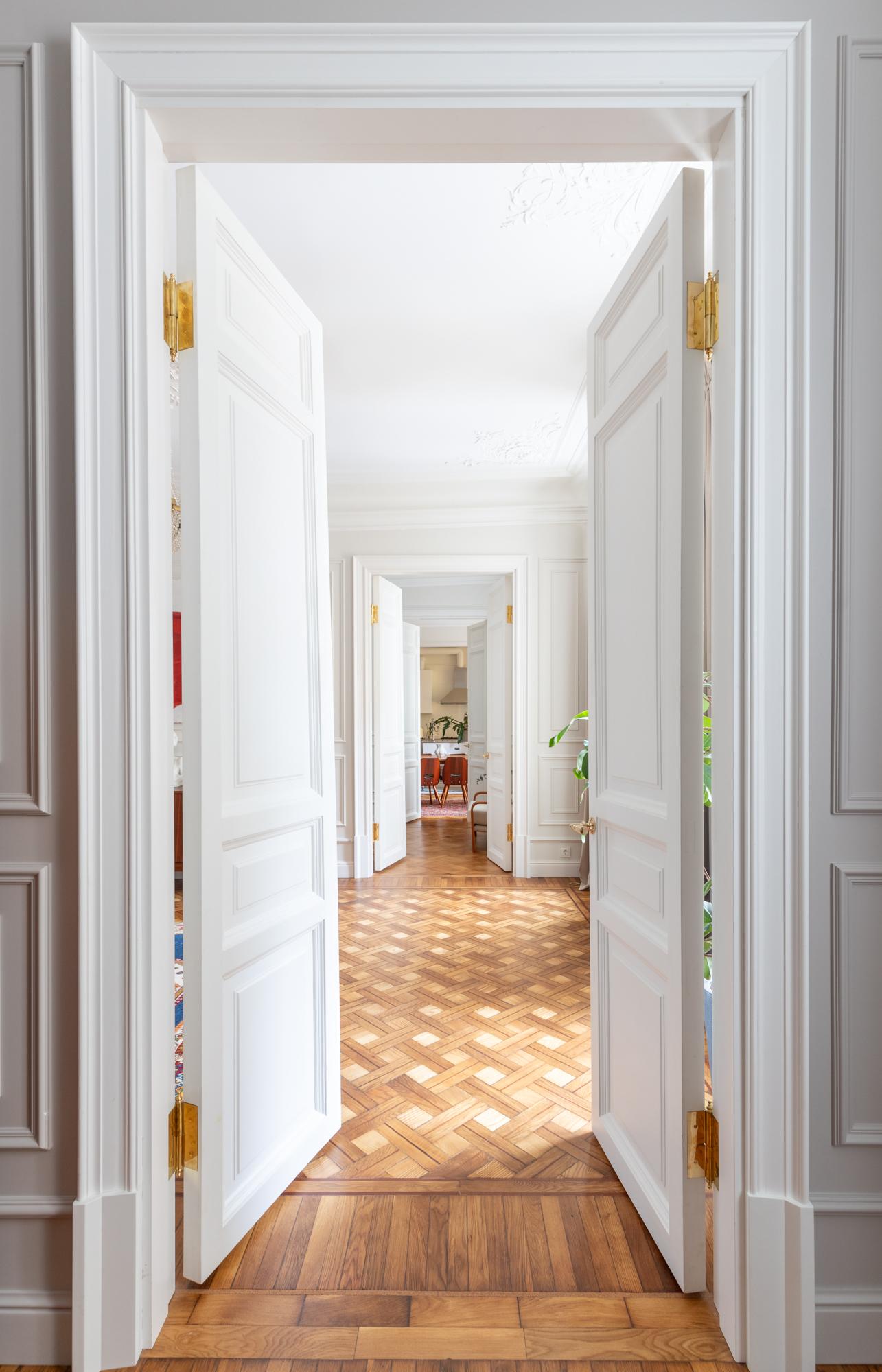 Заказчик хотел вернуть пространству вер изначальный облик, поэтому над проектом работала большая команда реставраторов разных направлений. Лепнина, полы, двери, анфиладная планировка — все это восстановлено. Снова работают и две изразцовые печи, камин. Потолки мы бережно очистили от ярких масляных красок, а паркет сначала снимали, приводили в порядок и снова стелили.