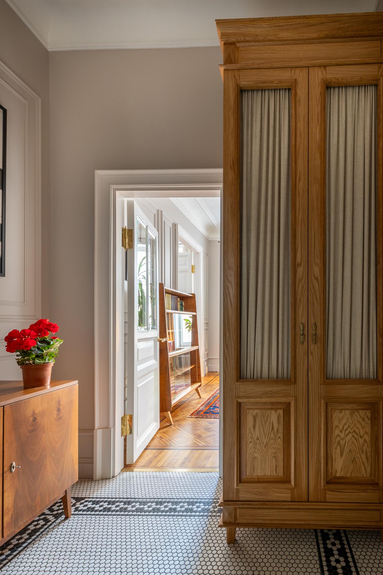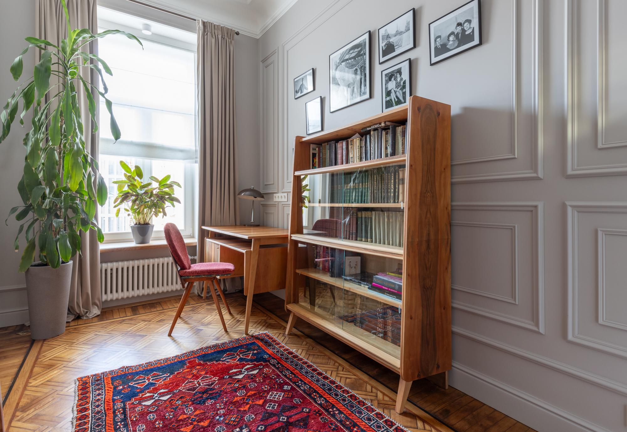 Ремонт длился год и восемь месяцев — работы было много. В mid-century мебели хозяину нравилось все, особенно шпон, чьи узоры выстраиваются в интересные образы. Но все это было под толстым слоем зеркального лака, поэтому реставраторы помогли его снять и тонировать шпон в тот оттенок, который подходит общей стилистике. К мебели мы подобрали антикварные ковры.