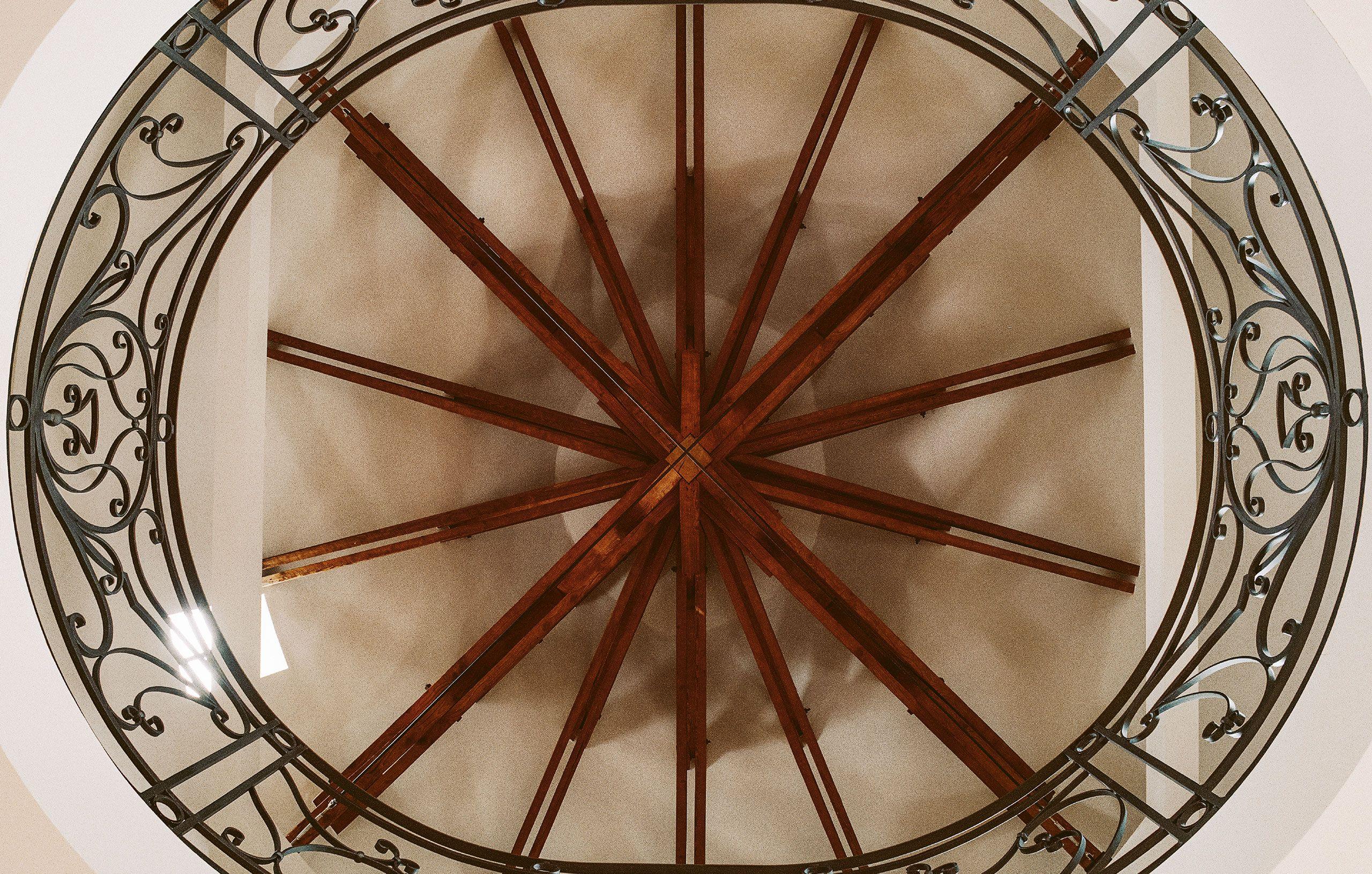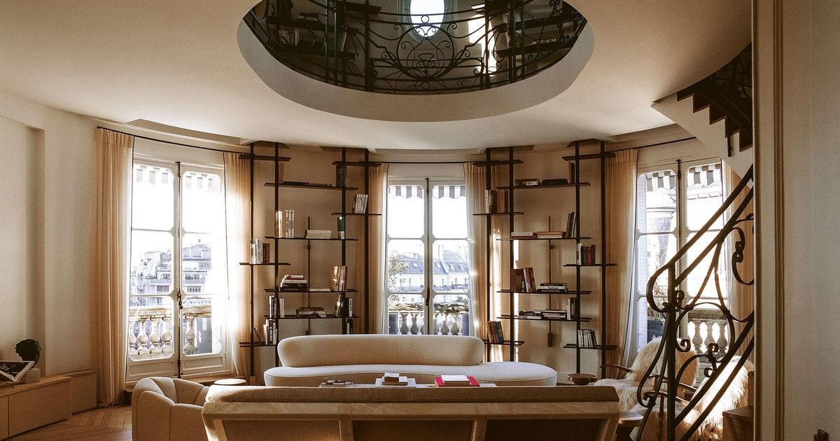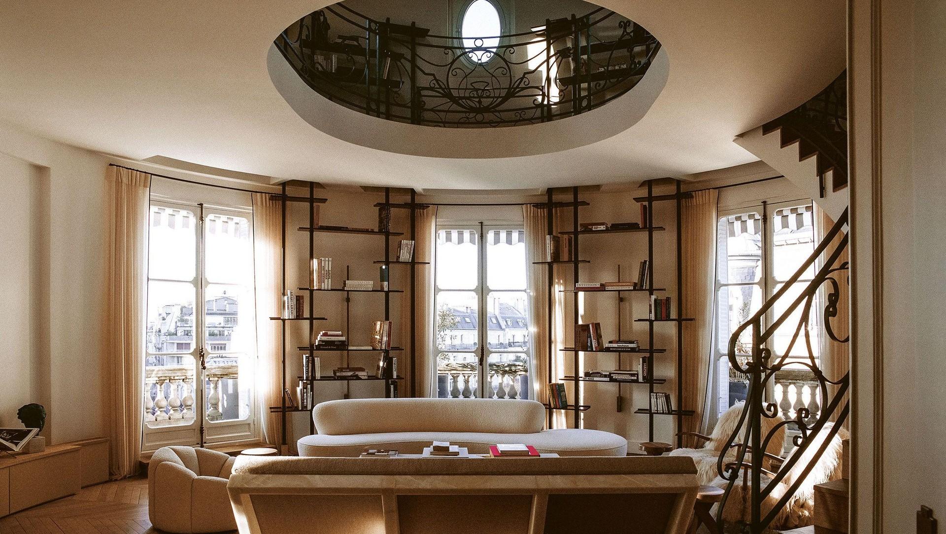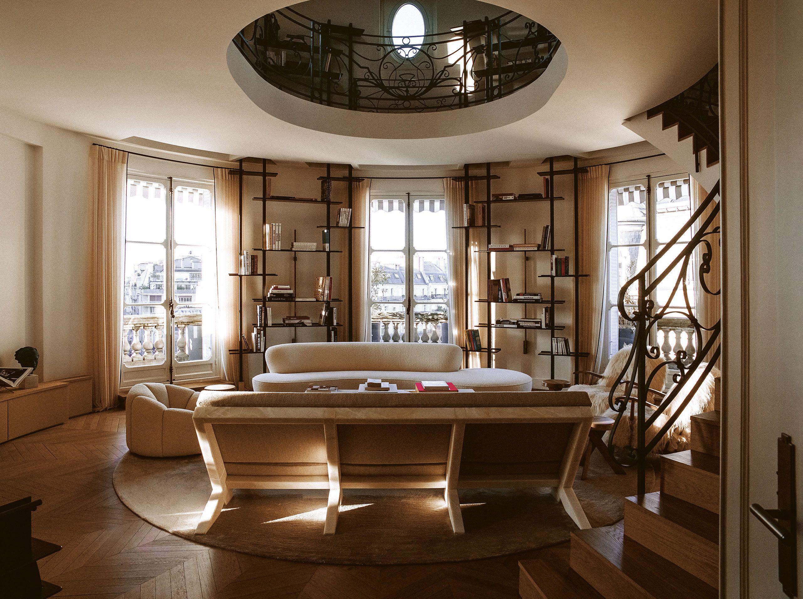 Гостиная расположена прямо под куполом башни — элементом, часто встречающимся на угловых зданиях Парижа, — дизайнер сделала проем в потолке, круглая форма которого перекликается с формой основания комнаты. Это решение удваивает высоту помещения и открывает вид на деревянную конструкцию XIX века наверху, детали которой расходятся, словно спицы колеса. Скульптурная лестница, украшенная кованой балюстрадой поднимается к смотровой площадке на уровне мезонина.