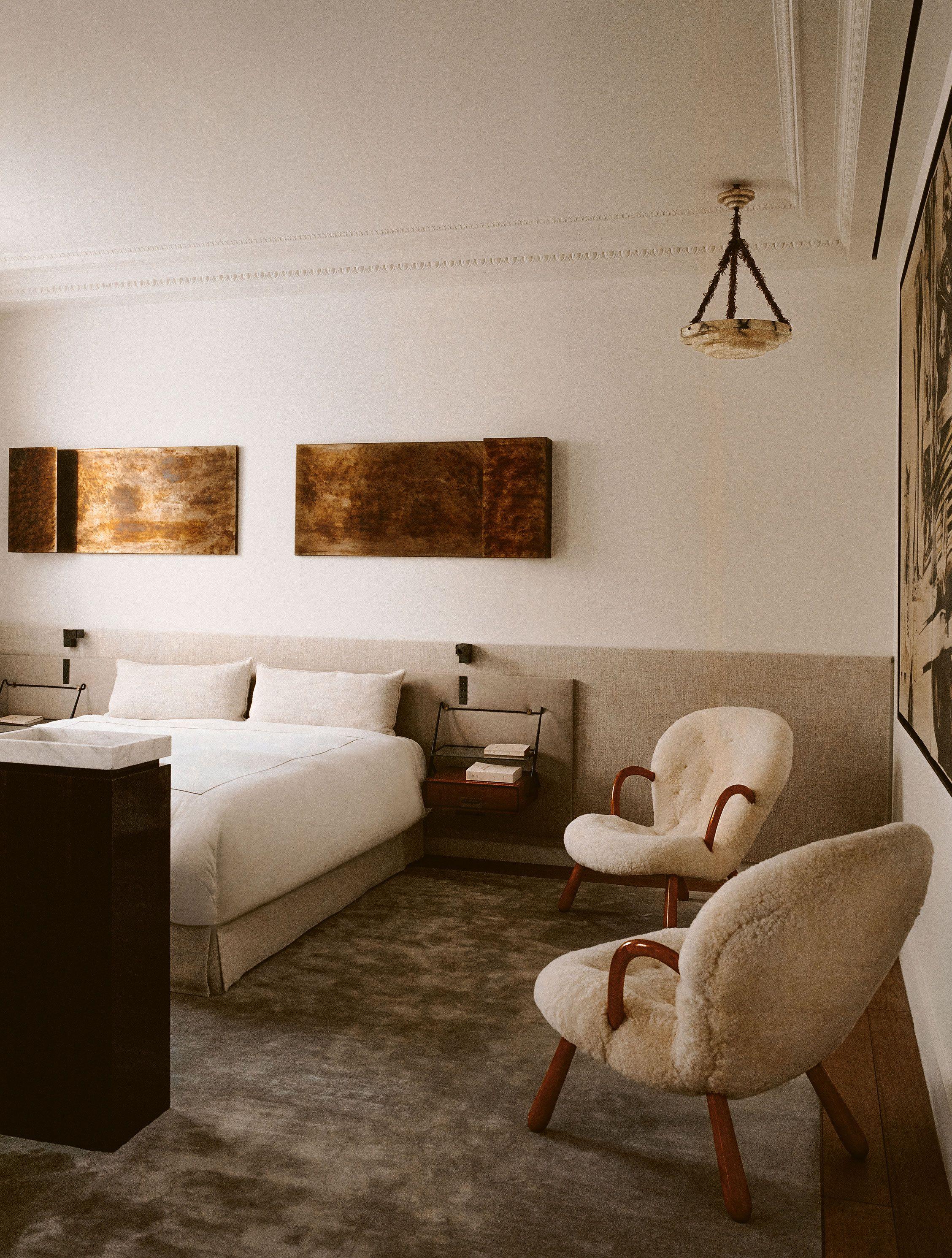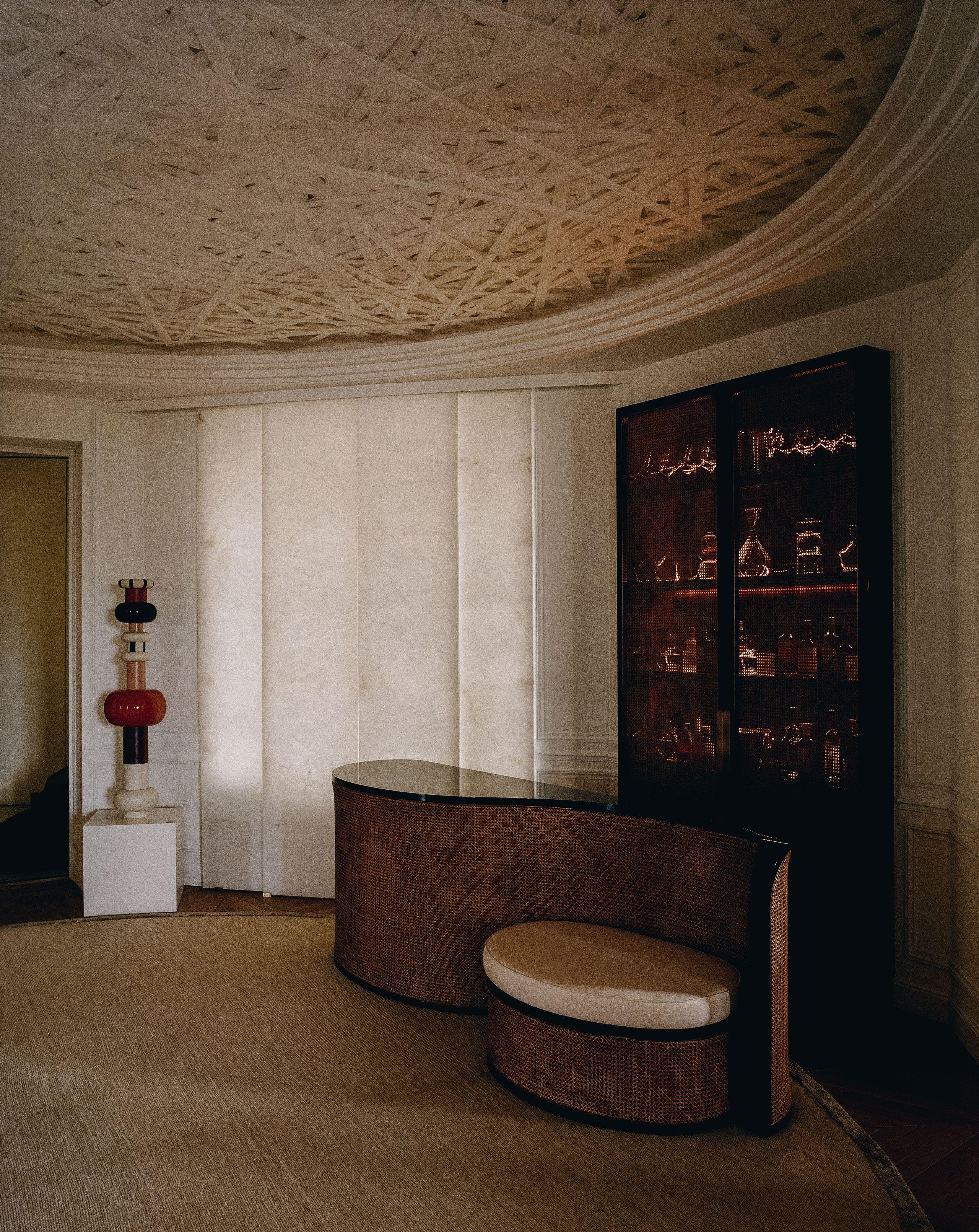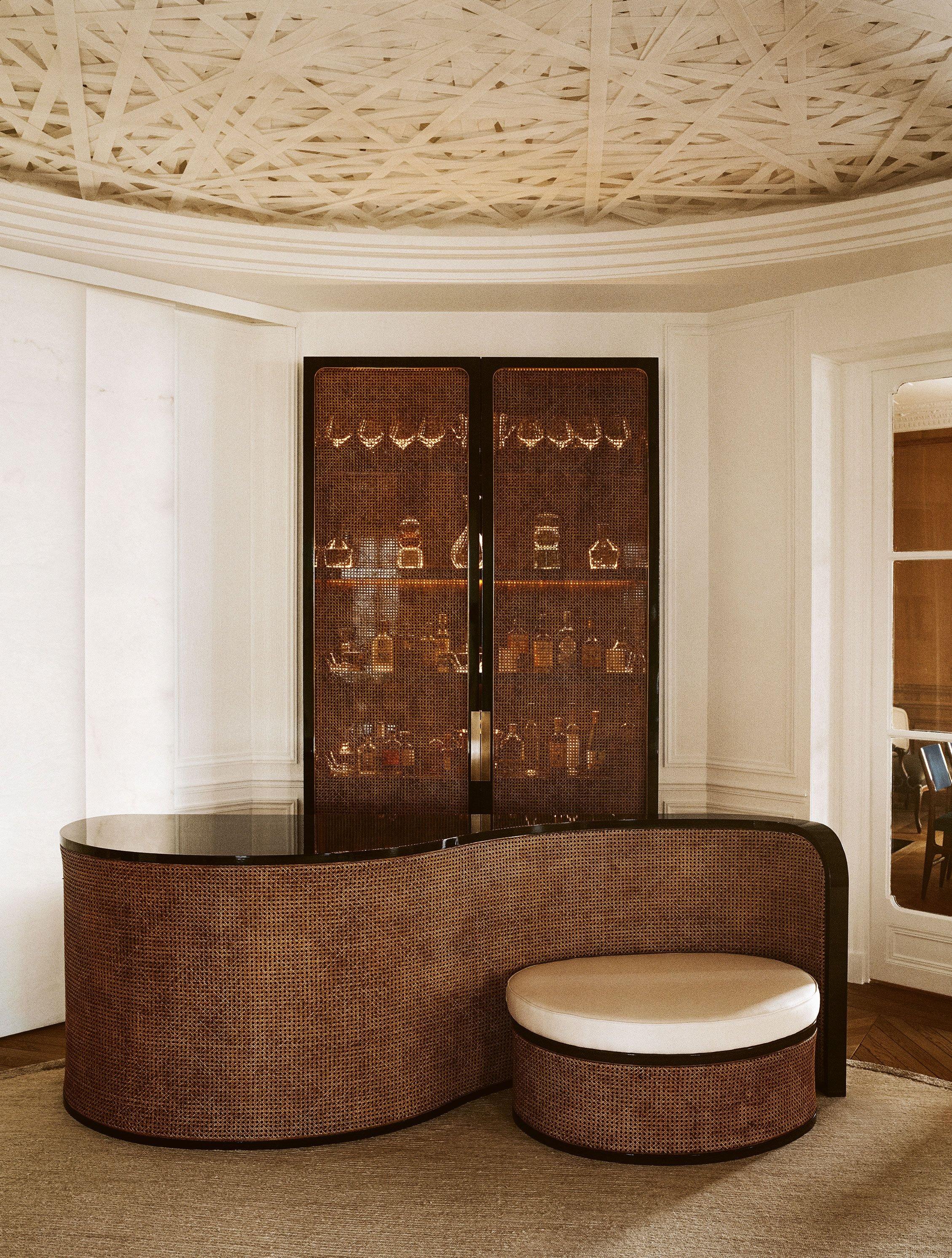 В вестибюле у входа этот диалог принимает слегка театральный вид: изогнутая барная стойка и овальный пуф с плетенкой стоят под абстрактным потолком с обрешеткой — работой французского художника Яна Керсале.