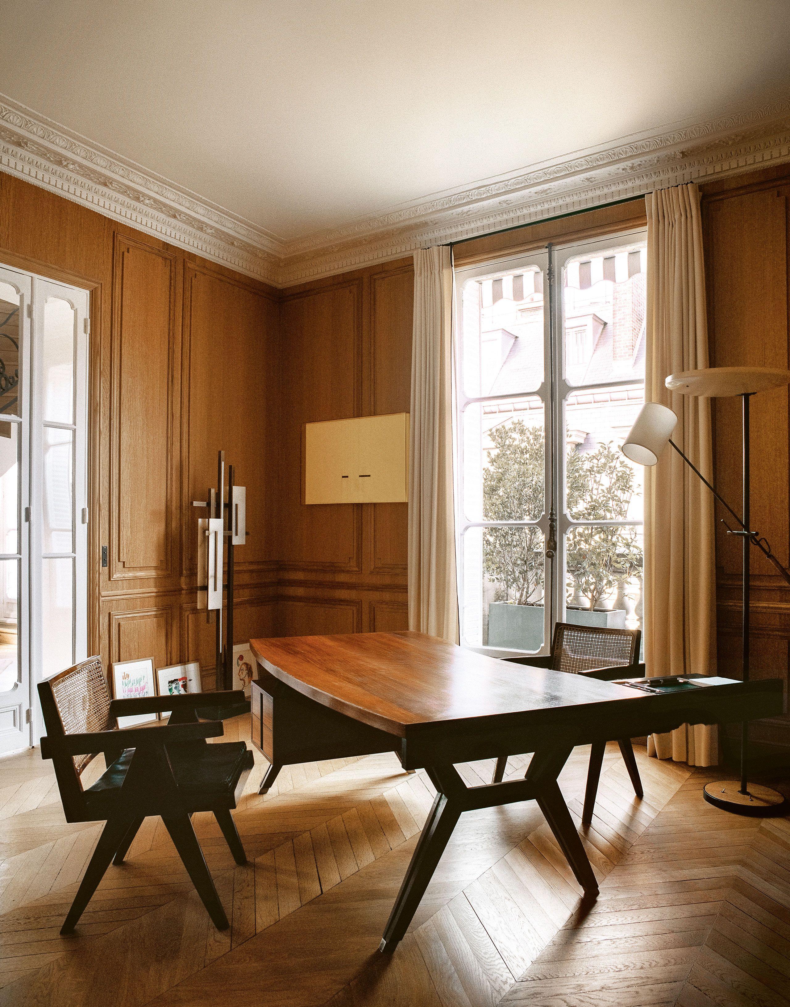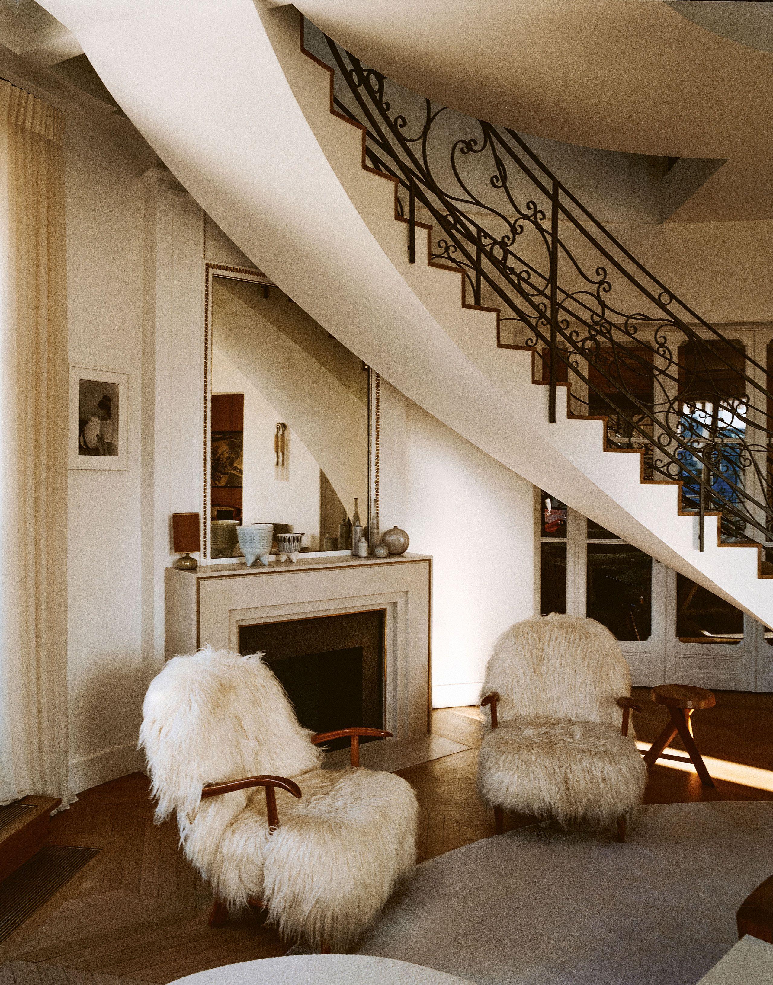 Диалог между эпохами дизайнер продолжила с помощью мебели, соединив модернизм 1950-х и 1960-х годов с современными работами Dimorestudio и Рика Оуэнса, а также собственными работами. В гостиной изгибы дивана Владимира Кагана и округлого кресла Пьера Полена стоят рядом с четкой геометрией журнального столика Nobu Кристиана Лиэгра и книжными полками по дизайну Изабель Станислас.