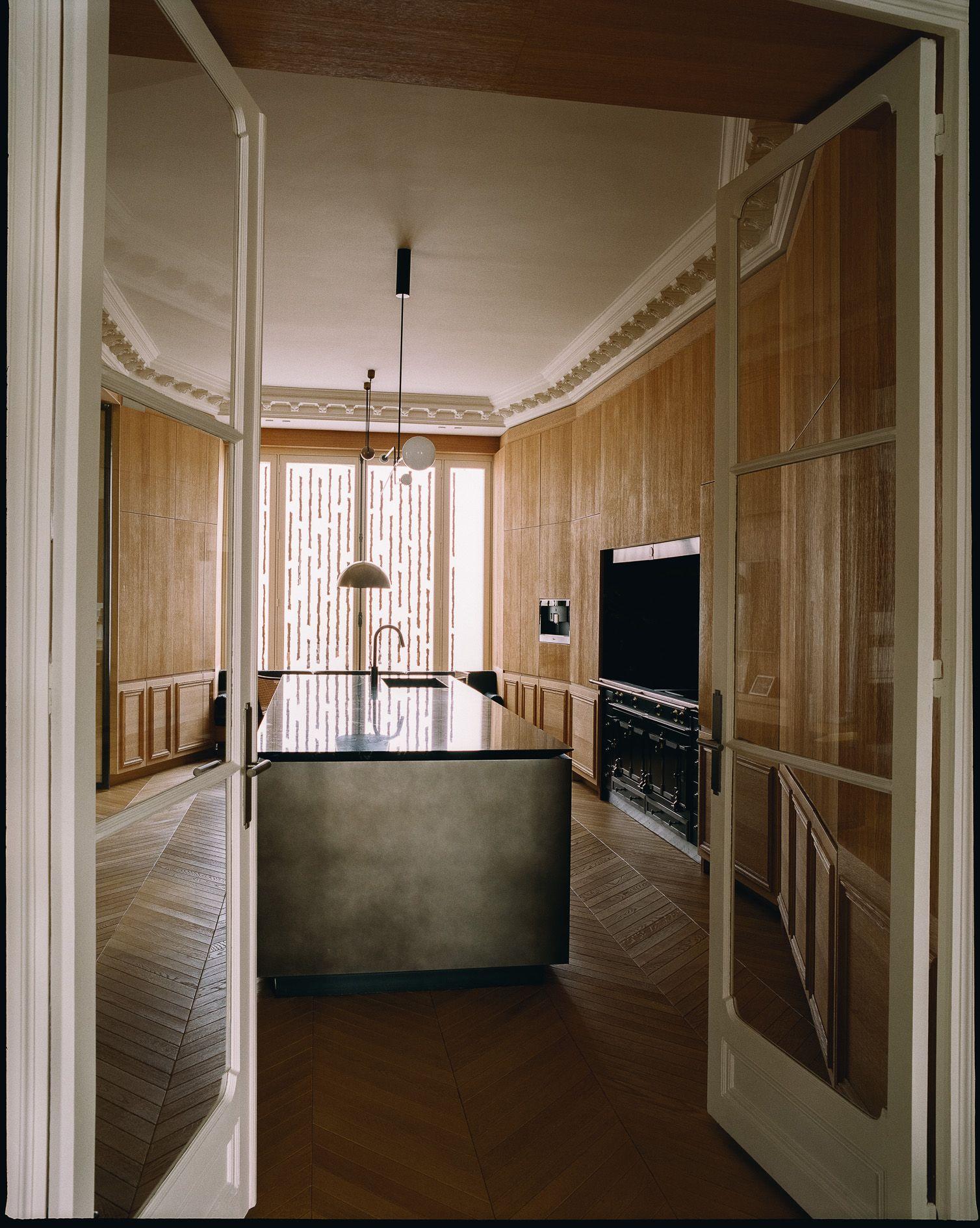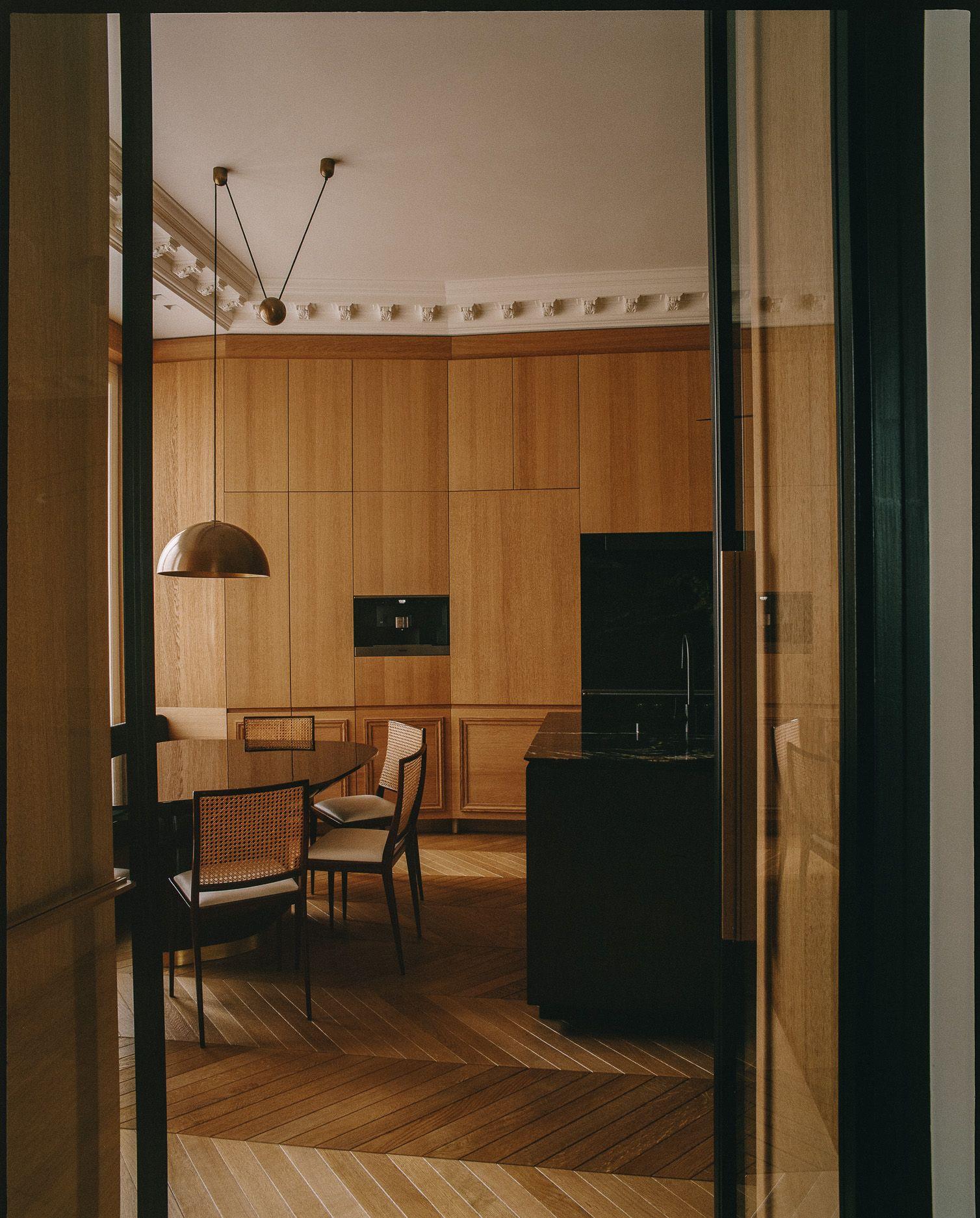 Дизайнера пригласил глава семьи, попросив обновить интерьеры квартиры. Она соединила старые карнизы и кессонный потолок, новые стеновые панели и современную мебель. В результате получилось пространство, где исторические детали и современный минимализм вступают в сдержанный, продуманный диалог.