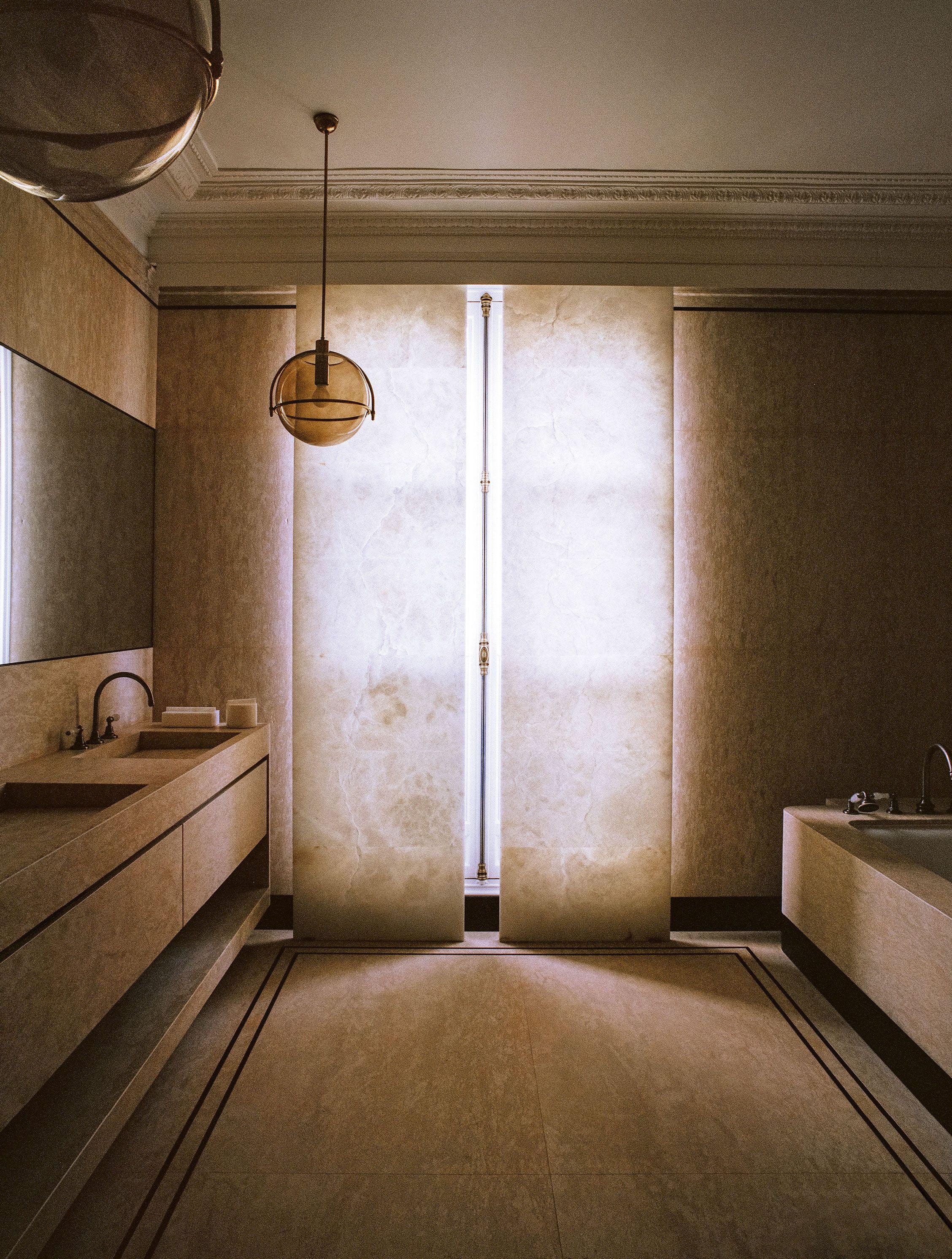 Главная спальня продолжает тему сдержанности и элегантности. Здесь винтажный алебастровый светильник из миланской галереи Nilufar перекликается с парой кресел Philip Arctander 1950-х годов и винтажными тумбочками Silvio Cavatorta. Алебастровые оконные панели в прилегающей ванной комнате рассеивают дневной свет, превращая его в прозрачное свечение.