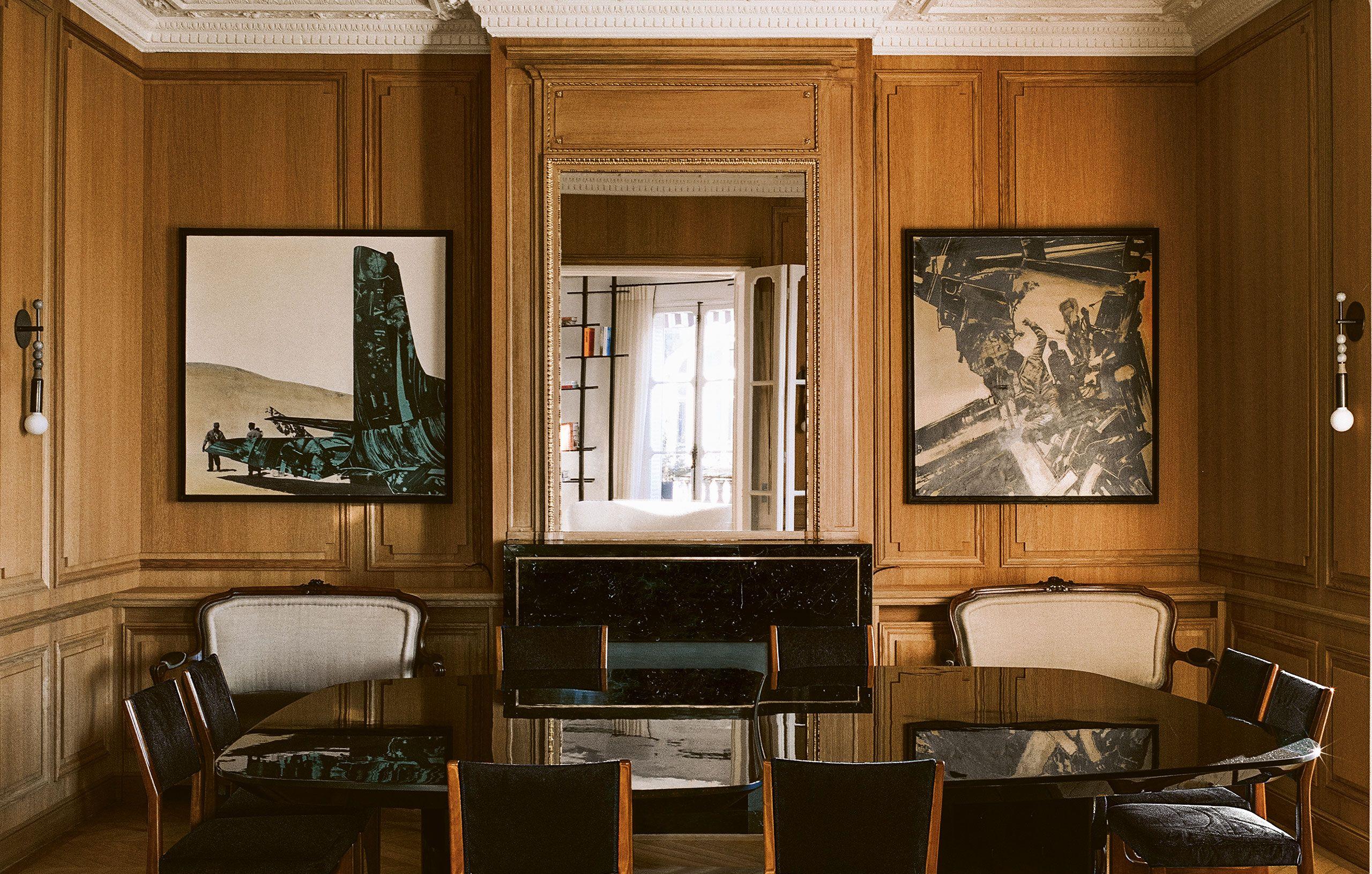 В столовой пара соединенных между собой лакированных столов, спроектированных Изабель, окружена стульями Джо Понти 1950 -х годов и потолочным светильником Анджело Лелли 1960-х годов. Минималистичный камин из черного мрамора, окруженный двумя диванами XIX века, подчёркивает тёмную отделку столов.