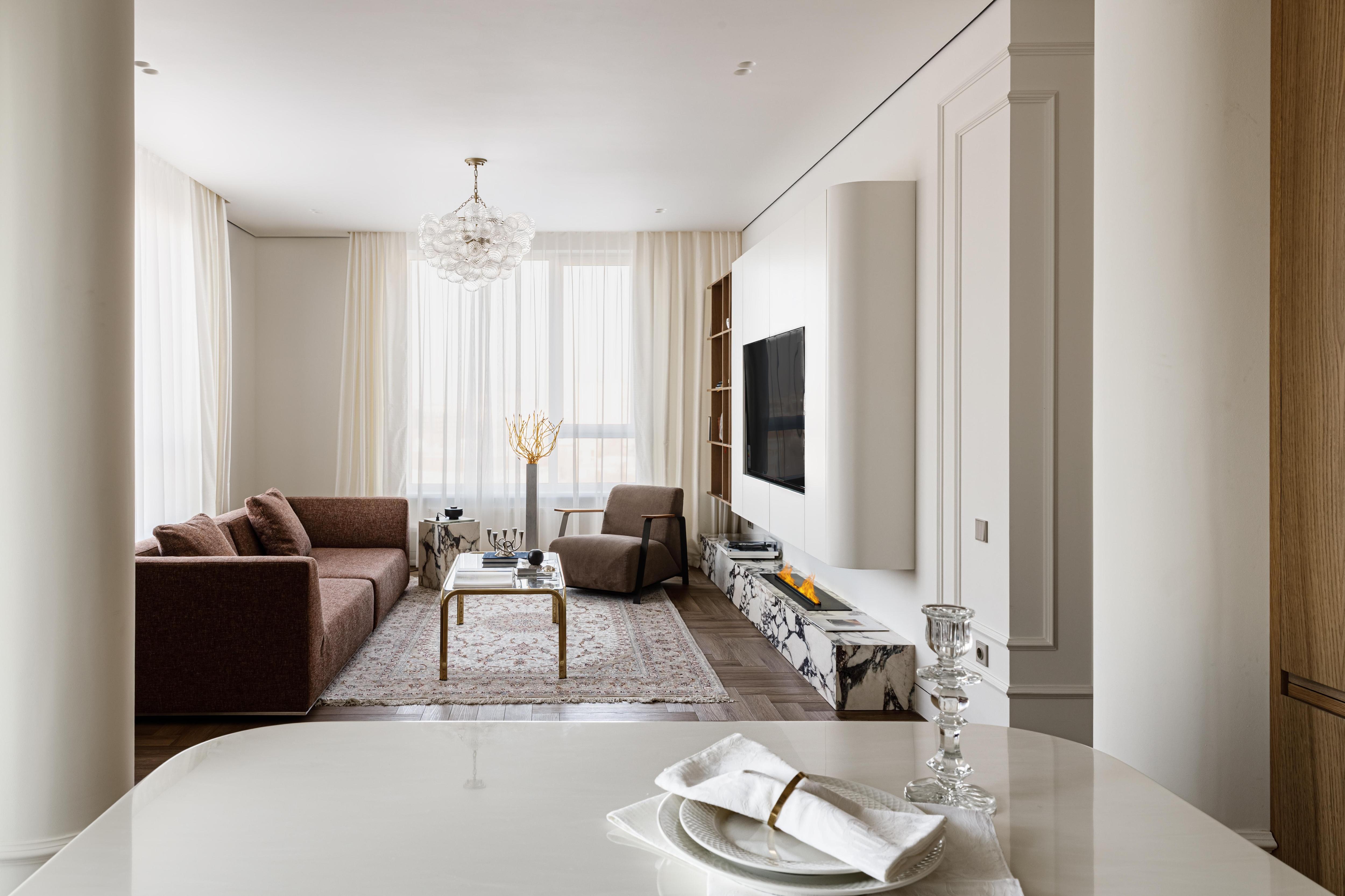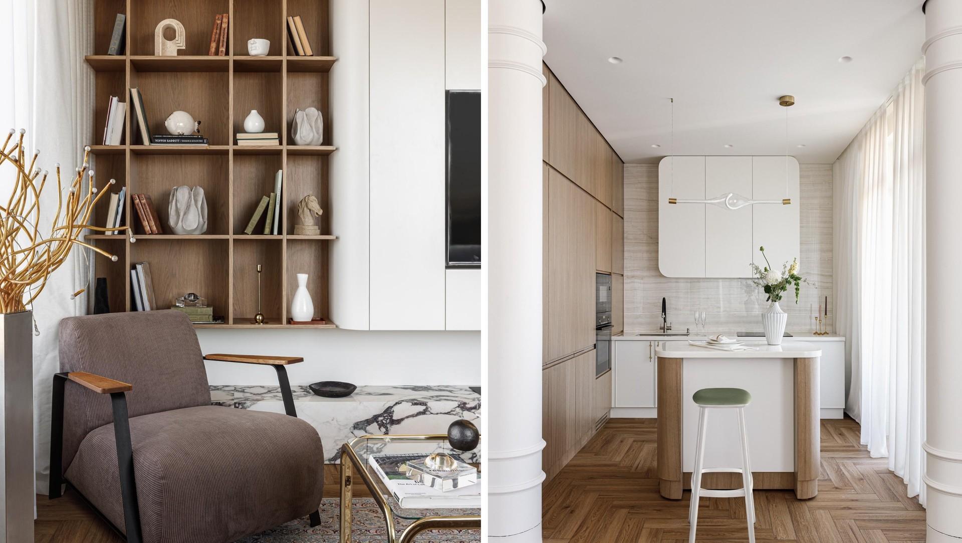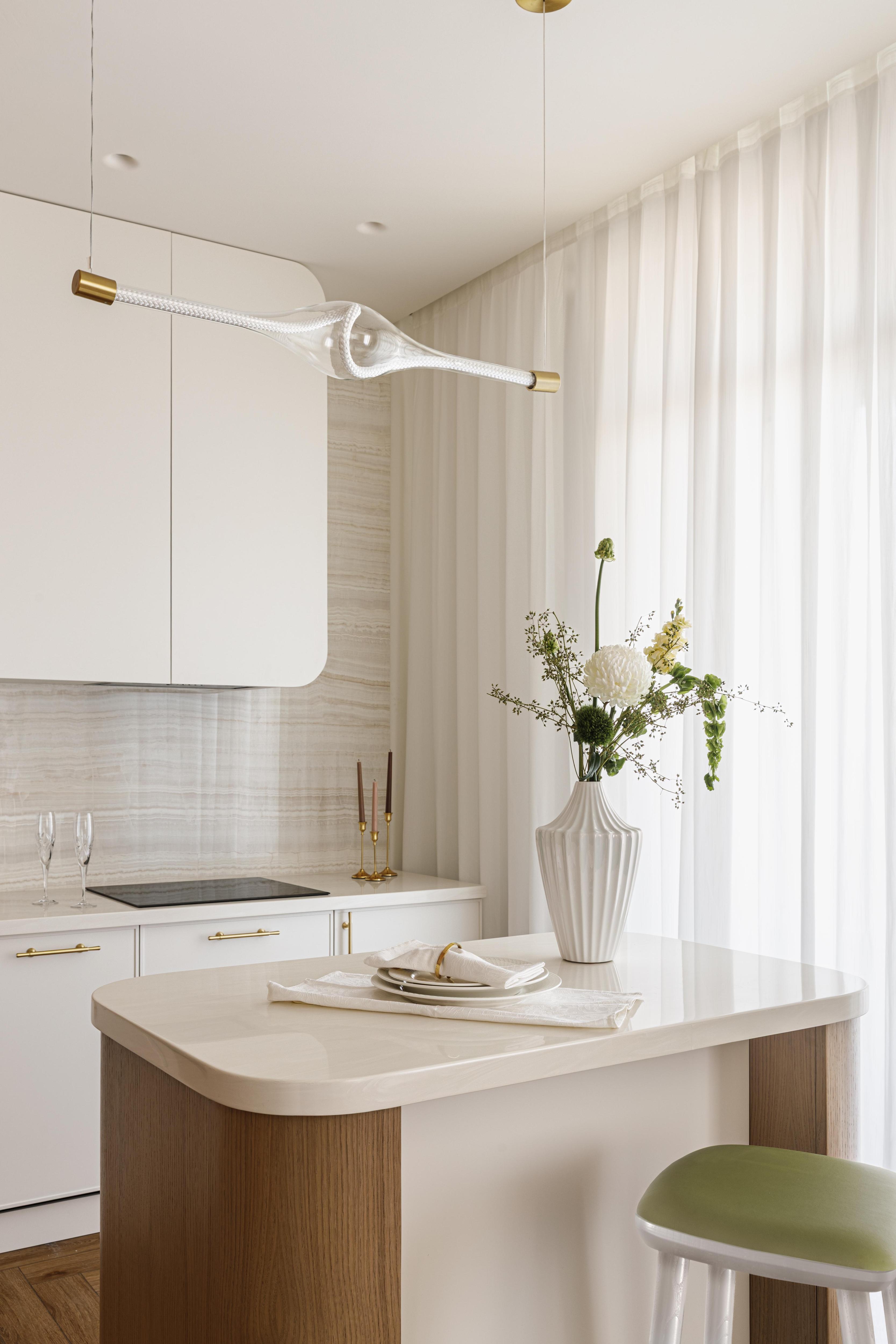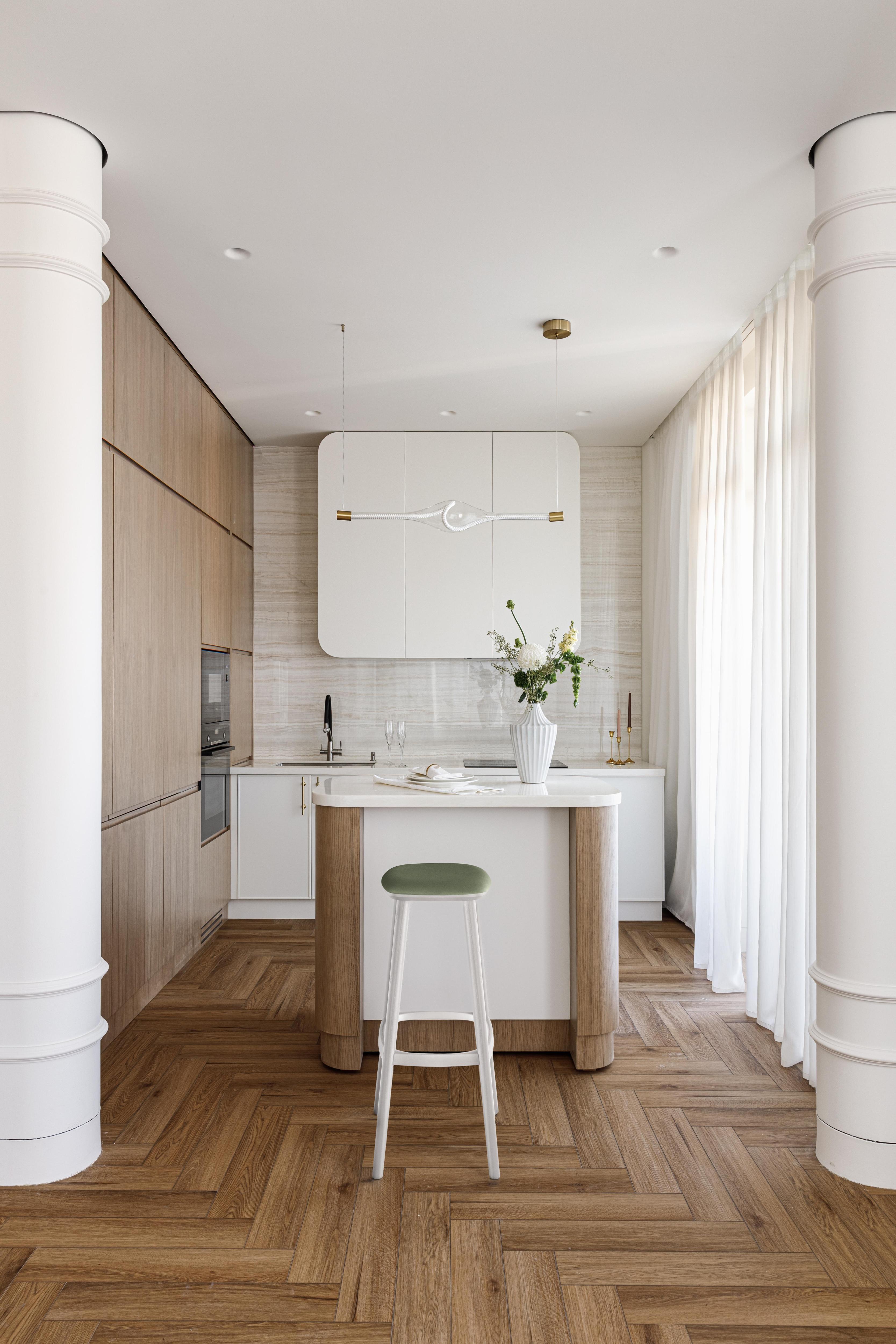 Мы создали цельный, пластичный интерьер, построенный на мягкой архитектуре и радиусных формах. Его обволакивает теплая нейтральная палитра: молочные и белые оттенки, натуральное дерево, мягкий бежевый камень с мраморным рисунком, деликатные латунные акценты. Есть и винтажные предметы, они создают особенную атмосферу.