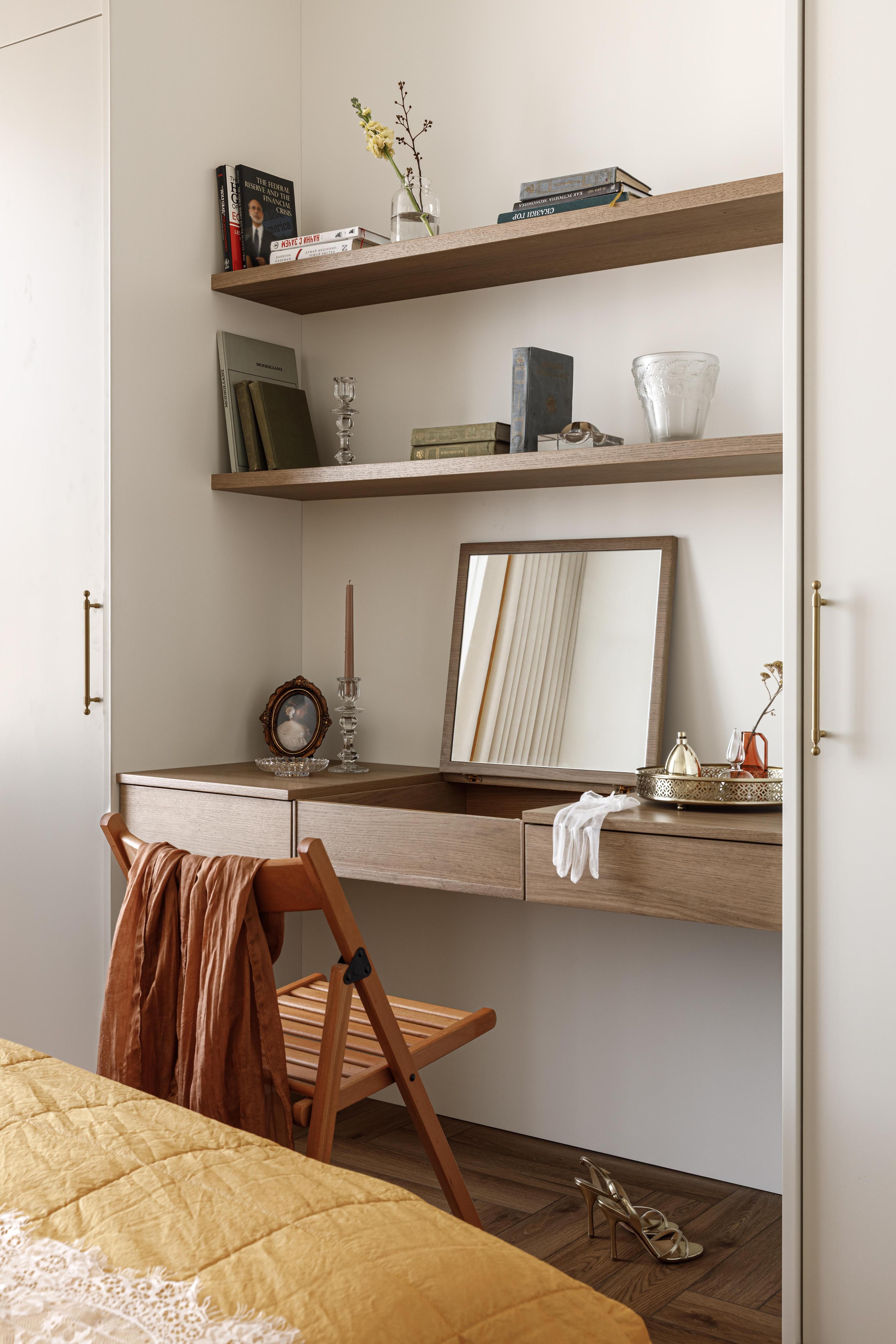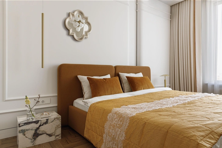 В спальне — такая же спокойная палитра. Она получилась светлой, свободной и при этом очень камерной. Белый воздушный оттенок мягко заземляет благородный терракотовый оттенок (на шторах, кровати, подушках). А еще здесь есть туалетный столик: у него откидная столешница, поэтому зеркало можно поднимать и опускать, когда нужно будет посидеть с ноутбуком.