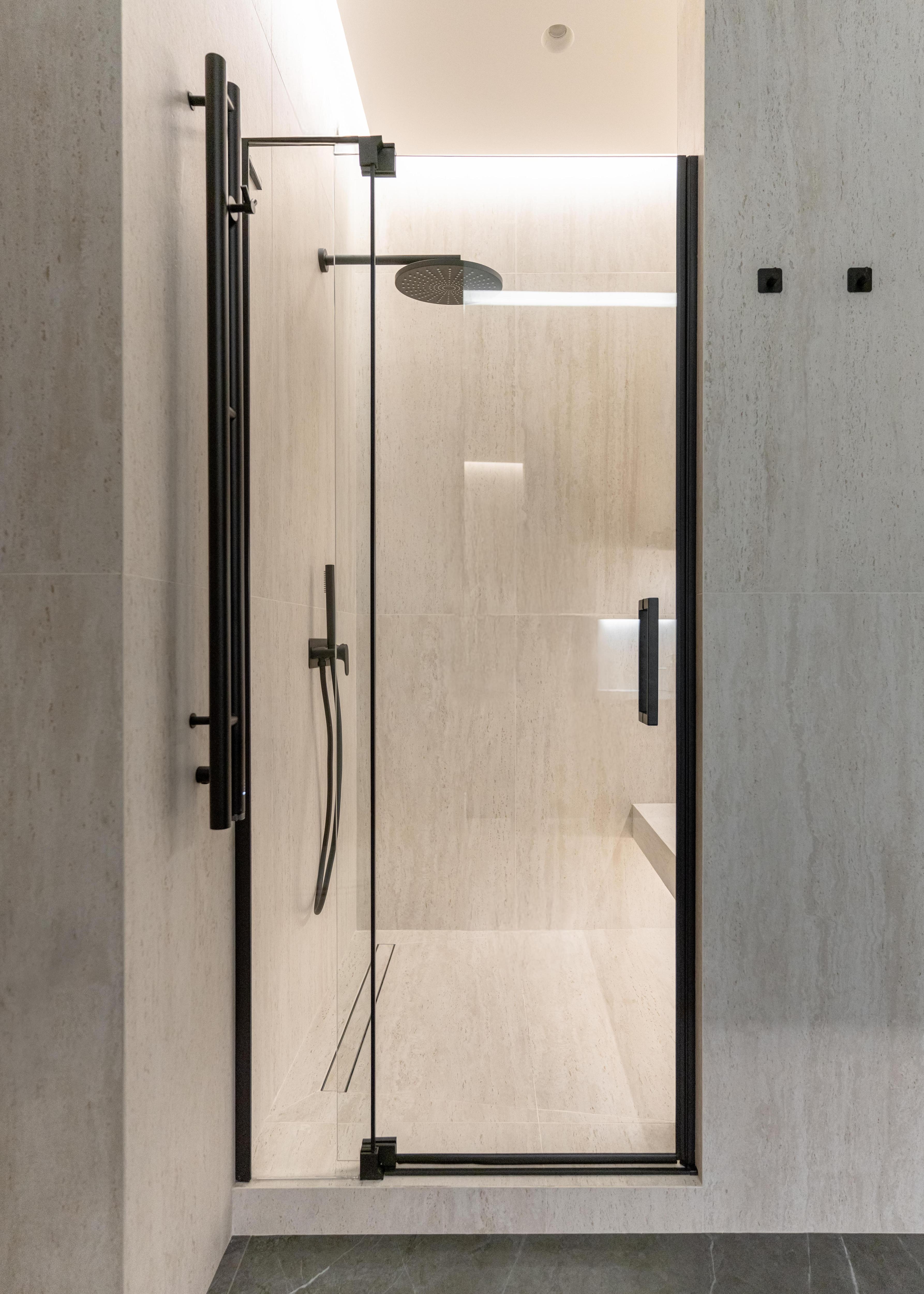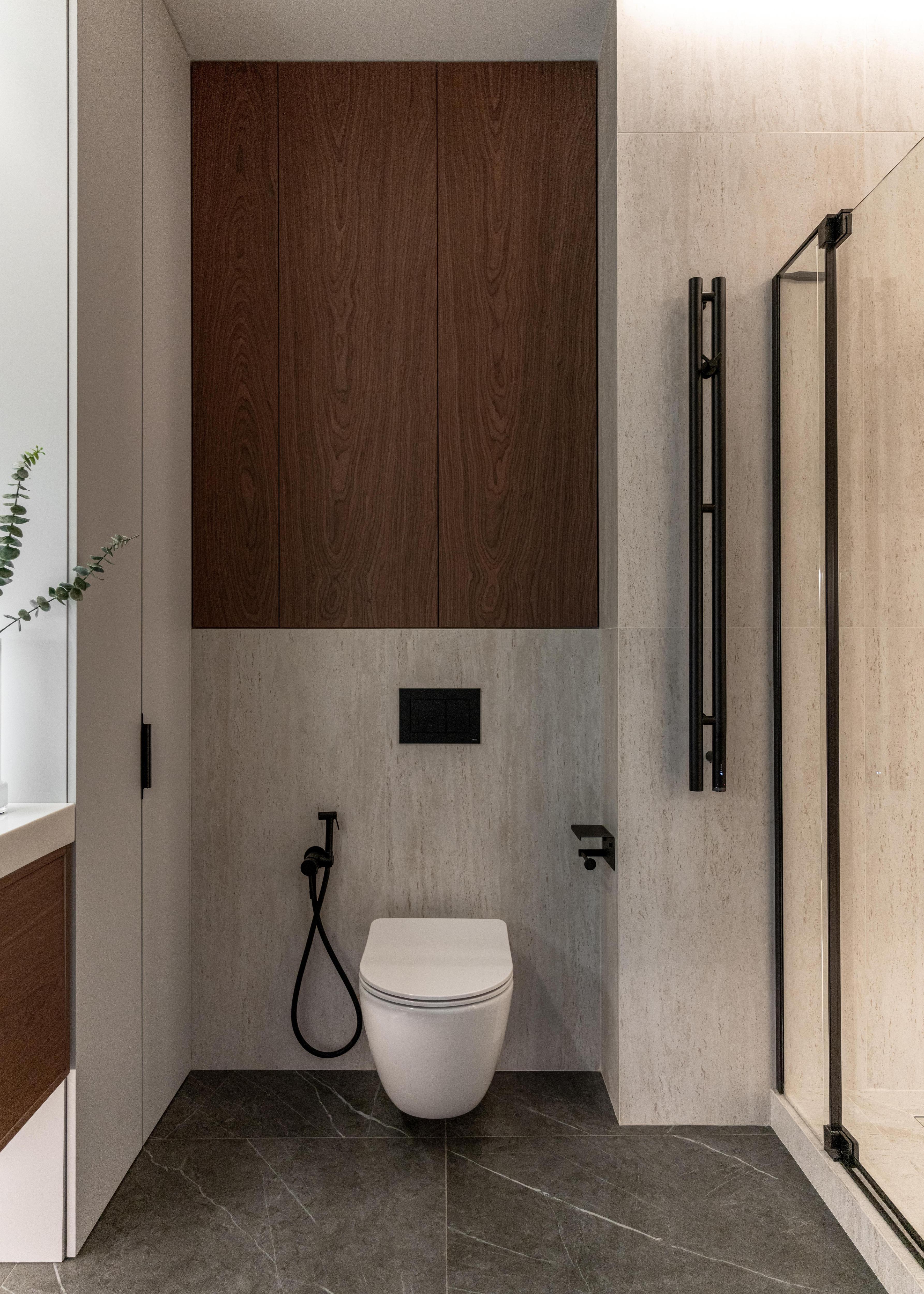 В санузле удалось спроектировать полноценный душ с сидением и встроенными полками. Поместился и хозблок: бойлер, стиральная и сушильная машины отлично вписались в пенал справа от раковины. Над унитазом тоже есть скрытые места для хранения.